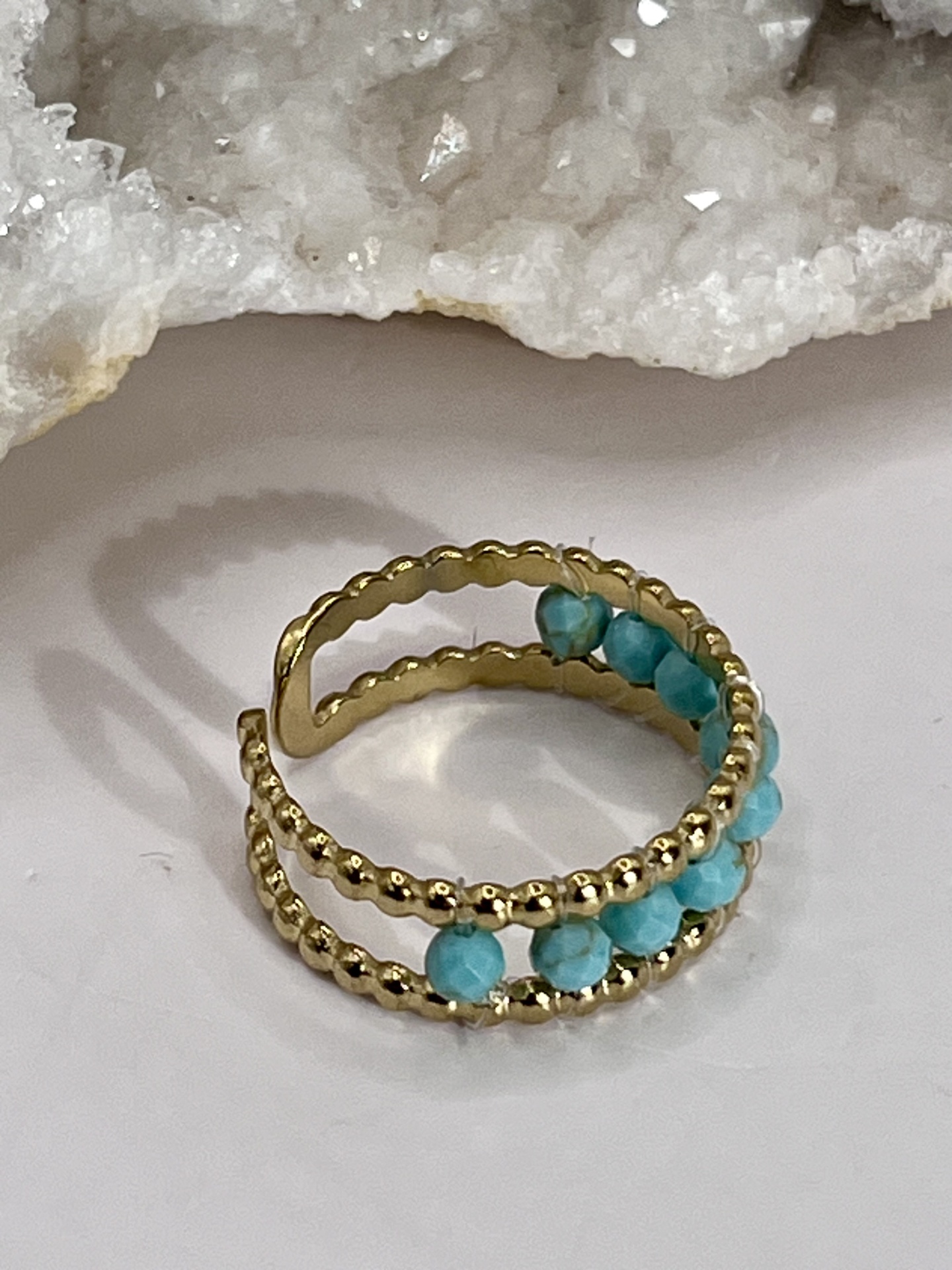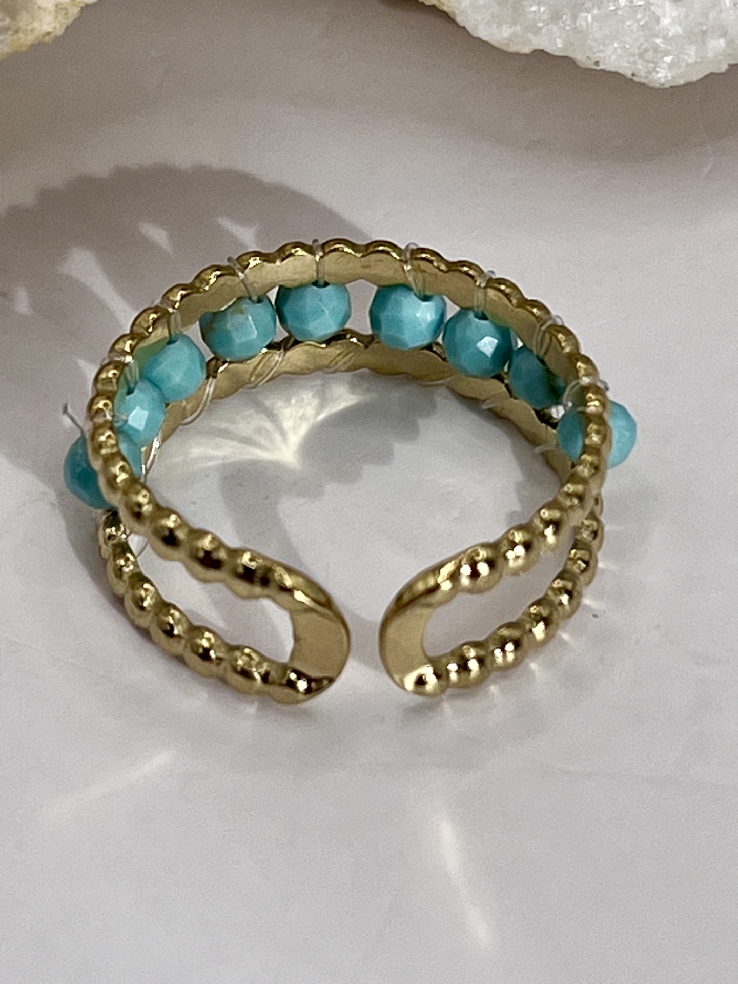 O Anel Duplo em Aço Inoxidável com Pedra Azul Turquesa – Modernidade e Sofisticação é uma peça de joalharia em liga metálica, com turquesa natural, acabamento cuidado para uso diário. Design elegante que realça a autenticidade artesanal e complementa qualquer look.