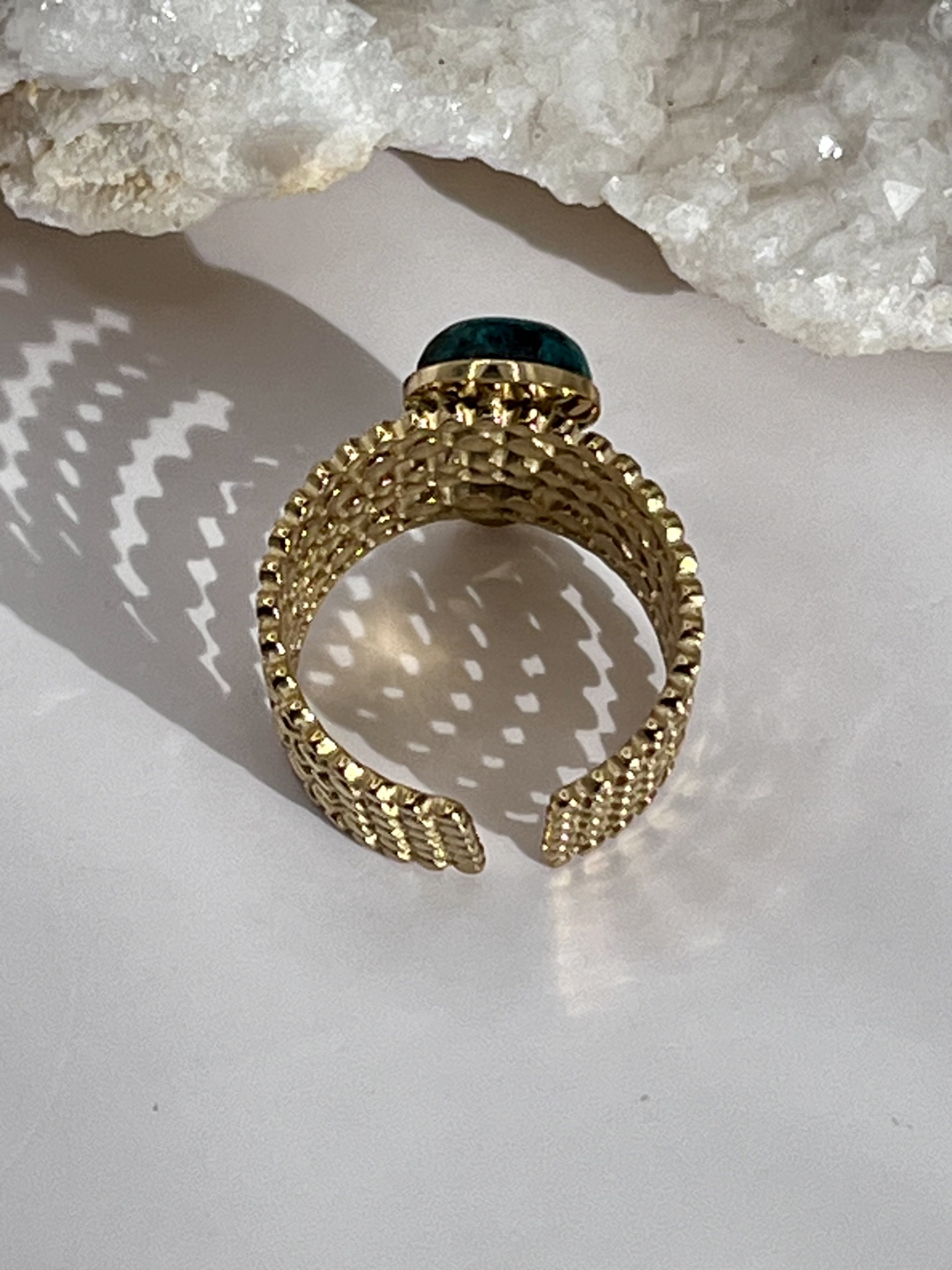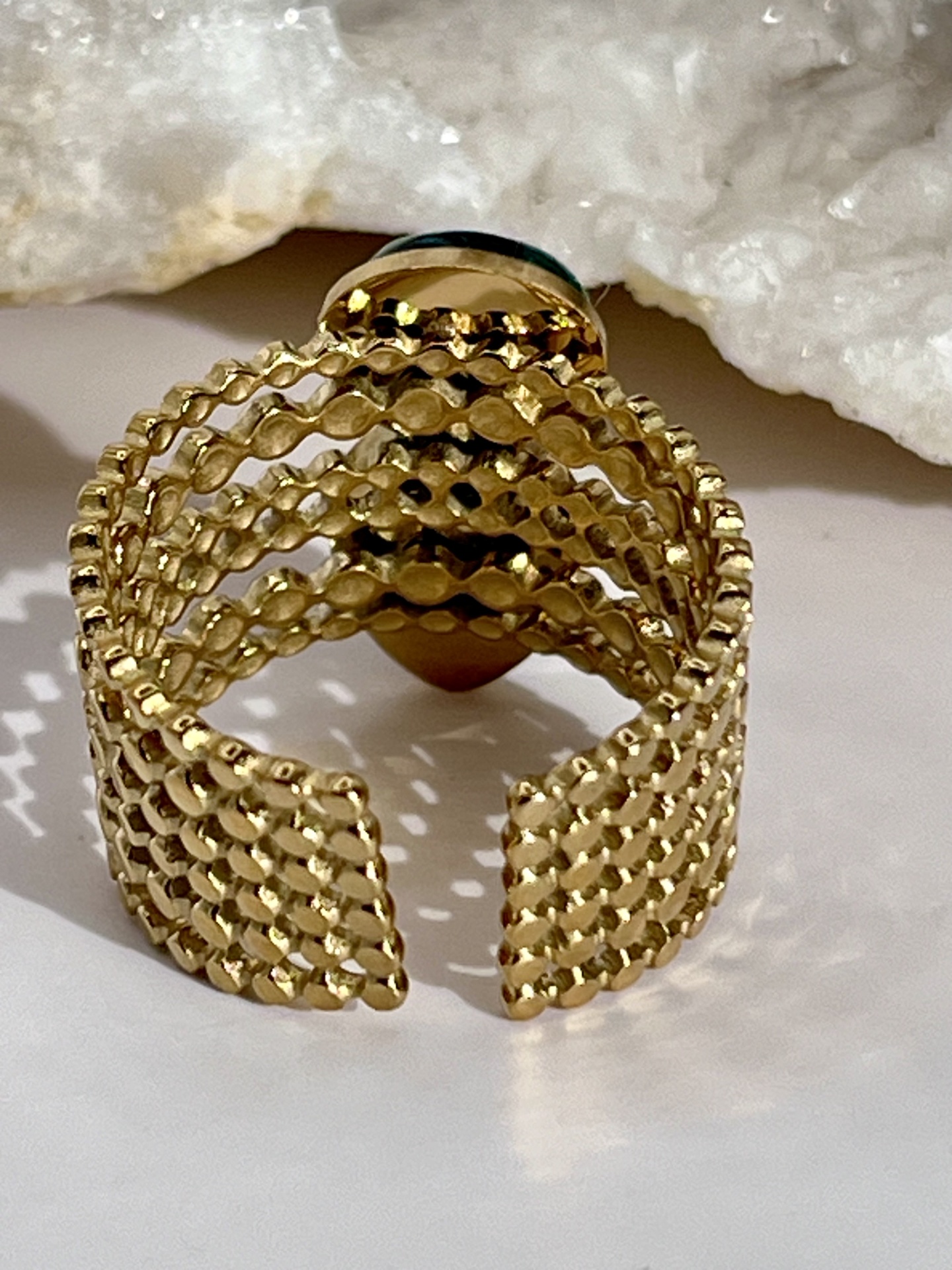 O Anel Multi-Anel Ajustável Dourado com Pedras Naturais é uma joia perfeita para presentear ou para quem deseja um acessório que combine design contemporâneo com o charme intemporal das pedras reais.