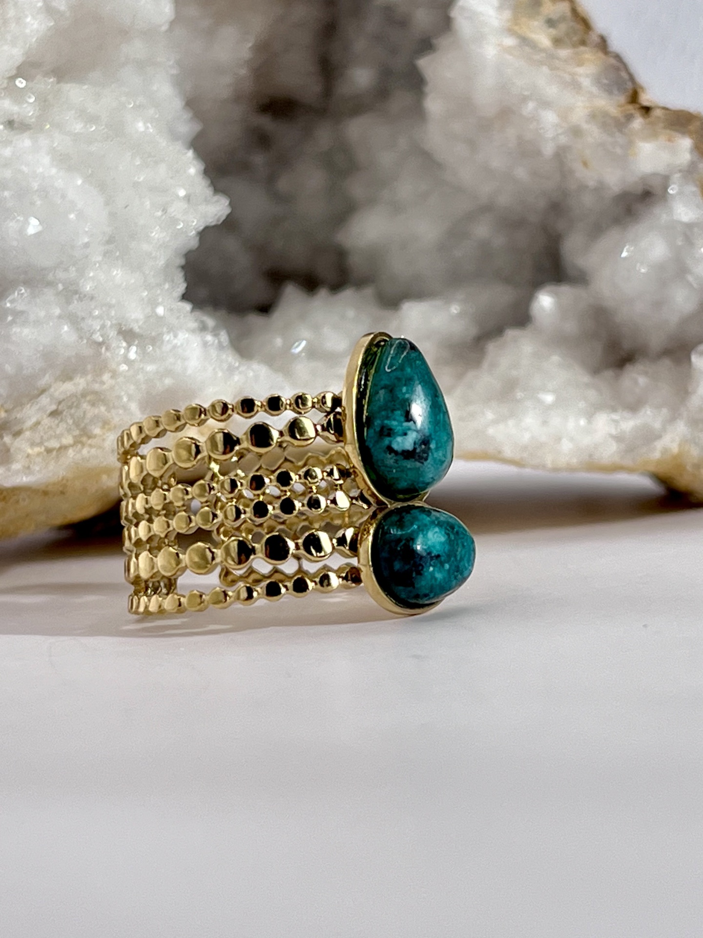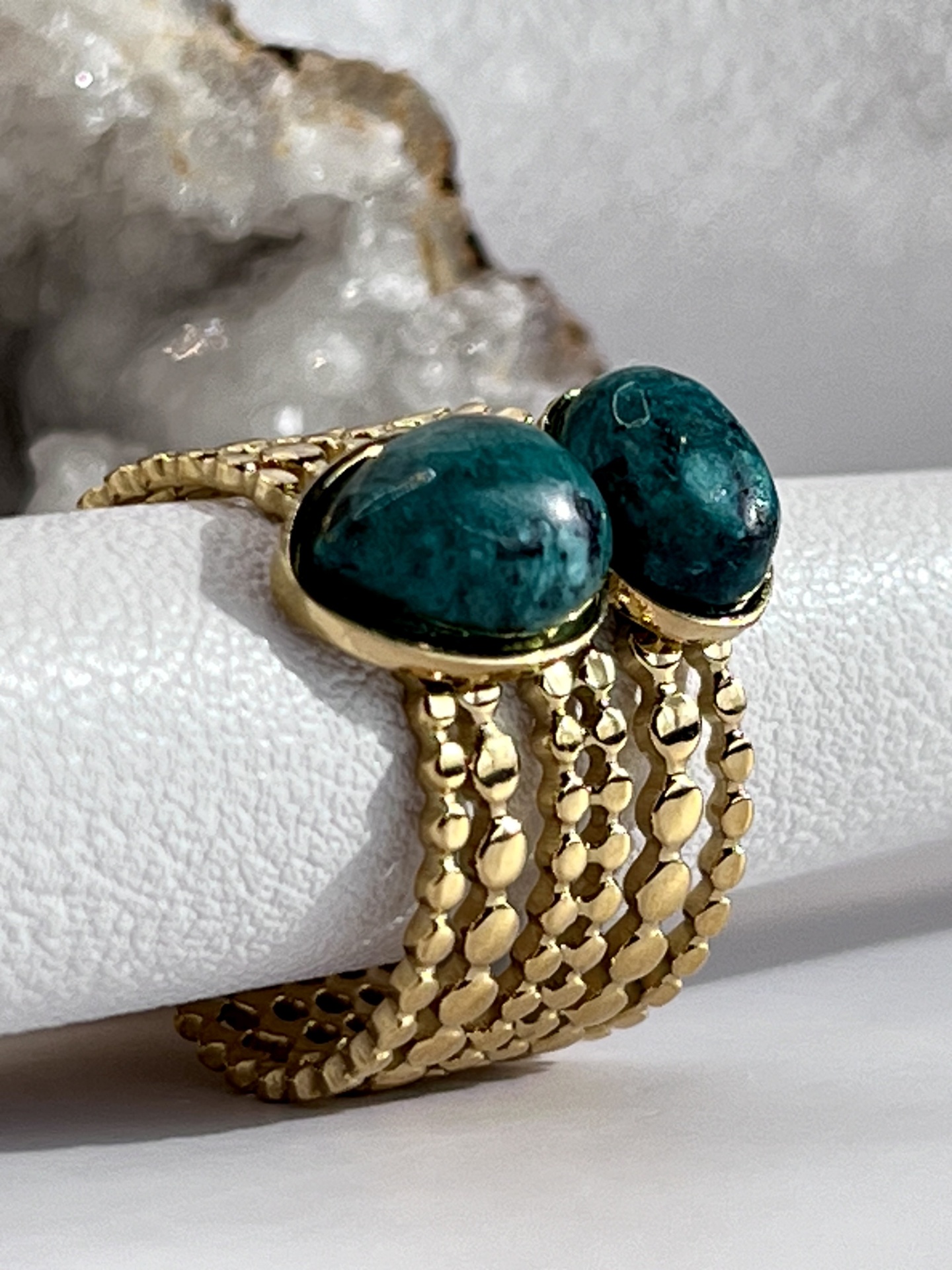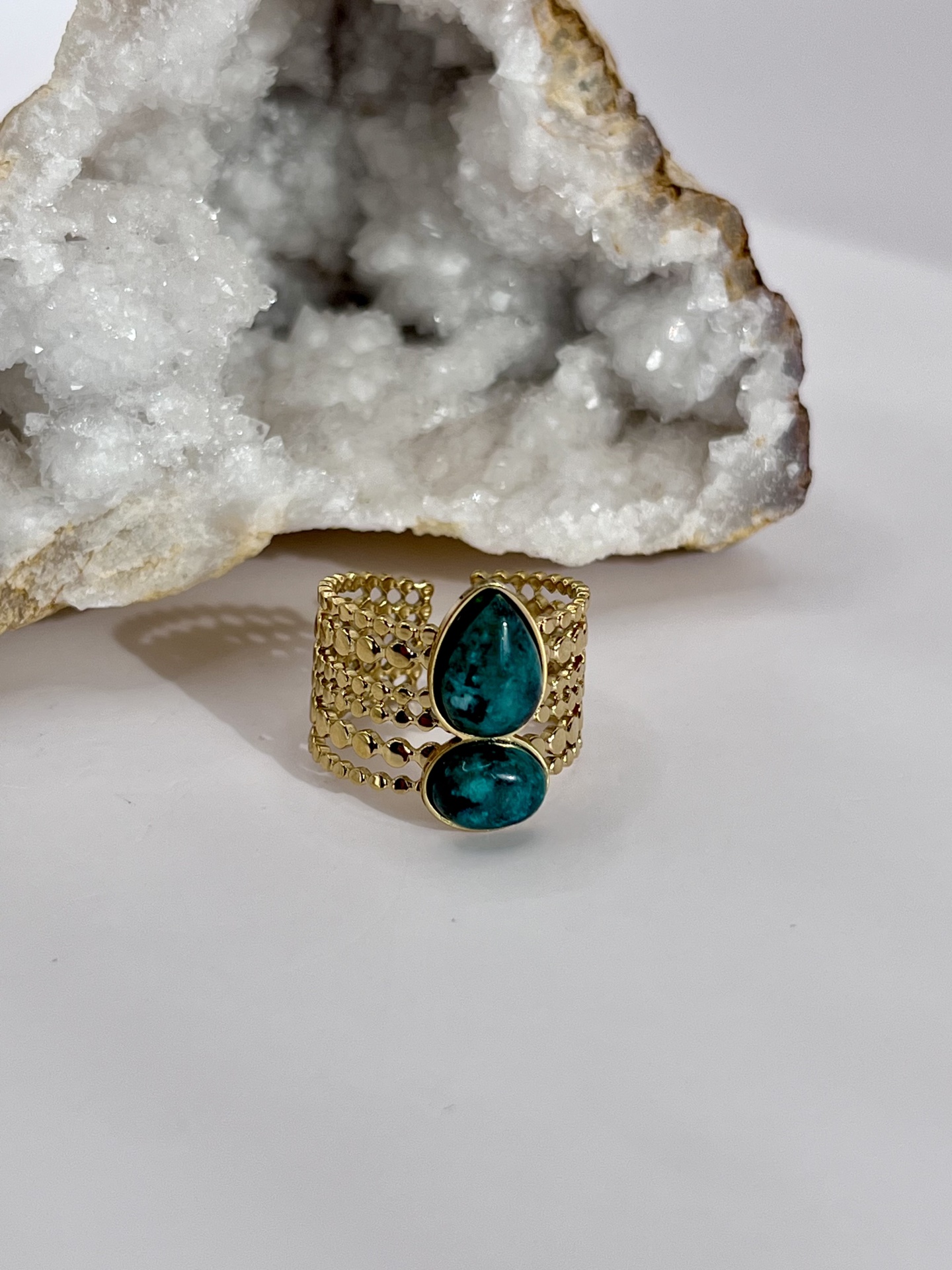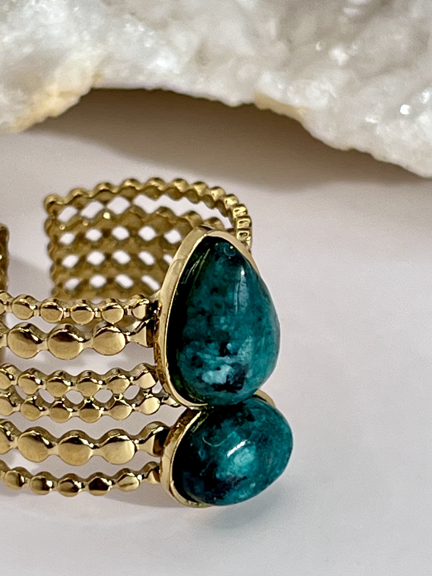 O Anel Multi-Anel Aberto e Ajustável em Aço Inox Dourado com Duas Gotas de Pedra Natural é uma joia moderna e sofisticada, ideal para mulheres que apreciam acessórios versáteis e elegantes. Com um design inovador, esse anel apresenta um estilo multi-anel aberto com duas delicadas gotas de pedra natural, que trazem um toque de frescor e autenticidade à peça.