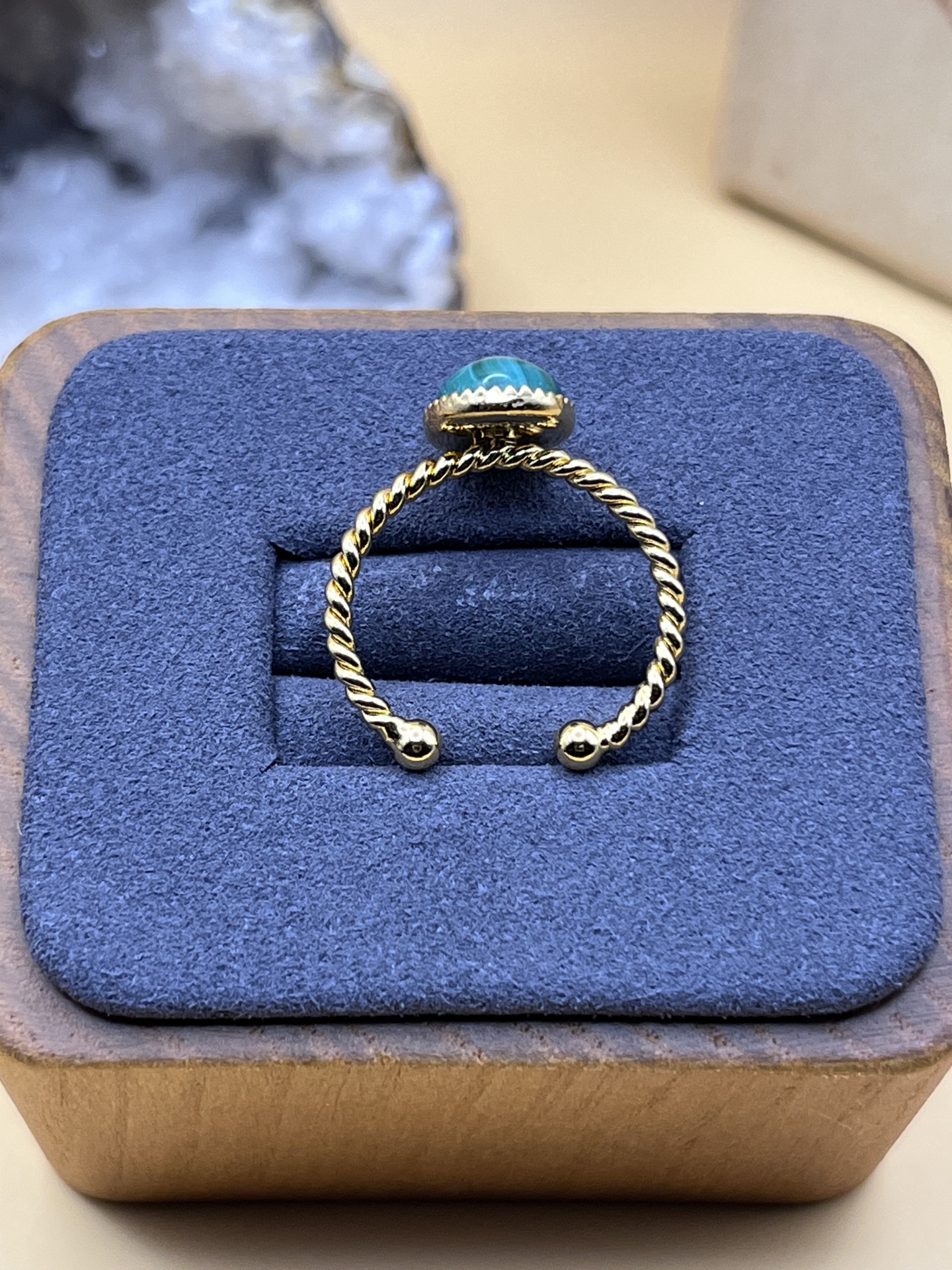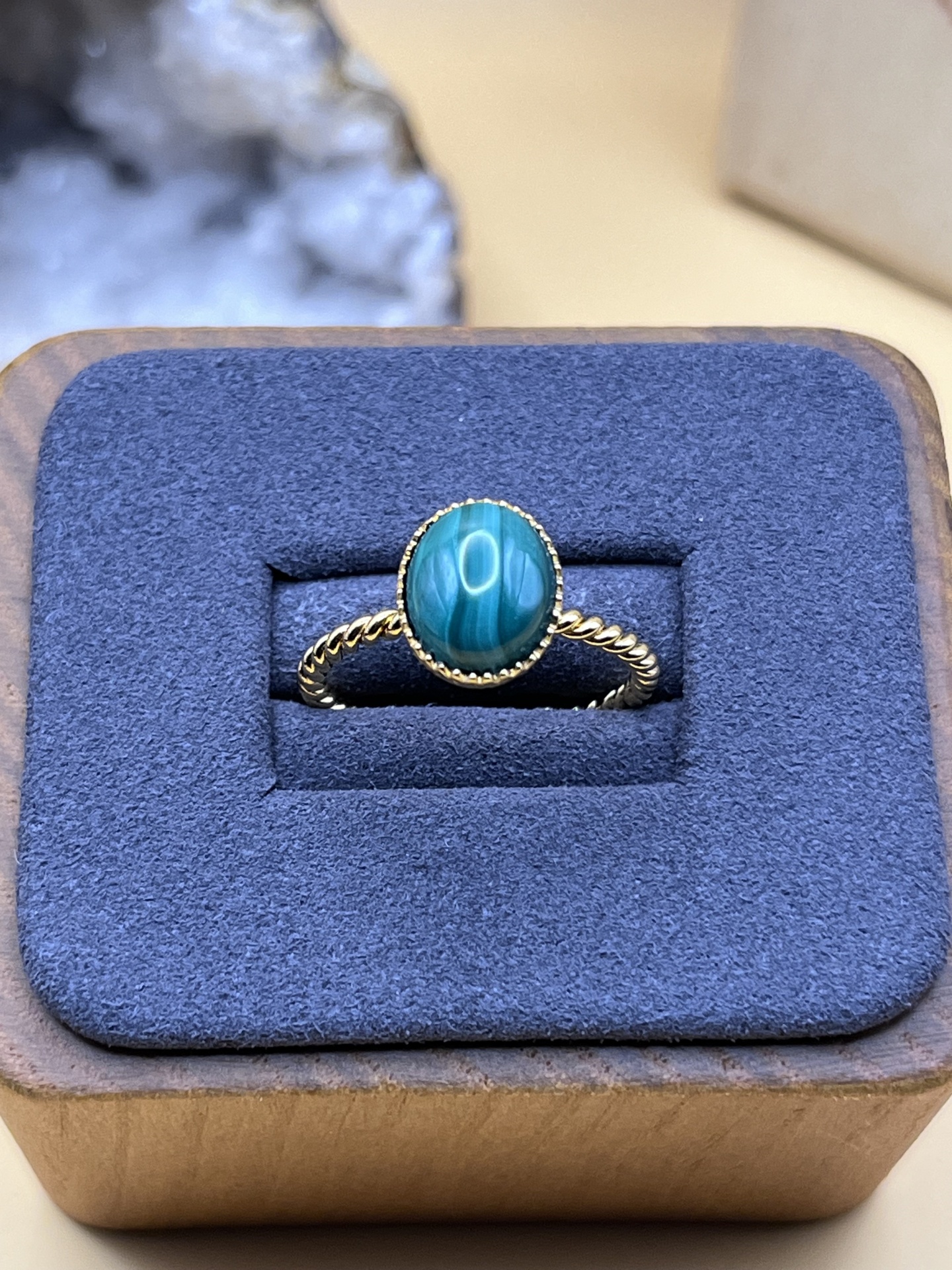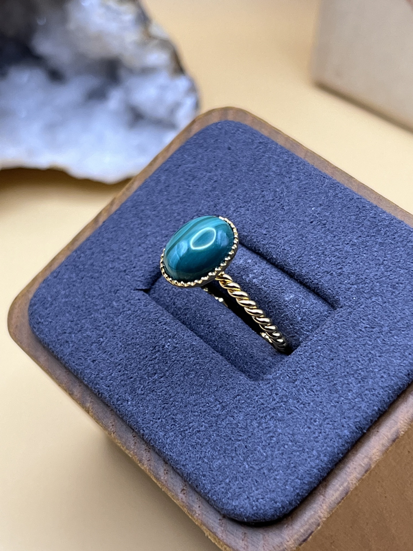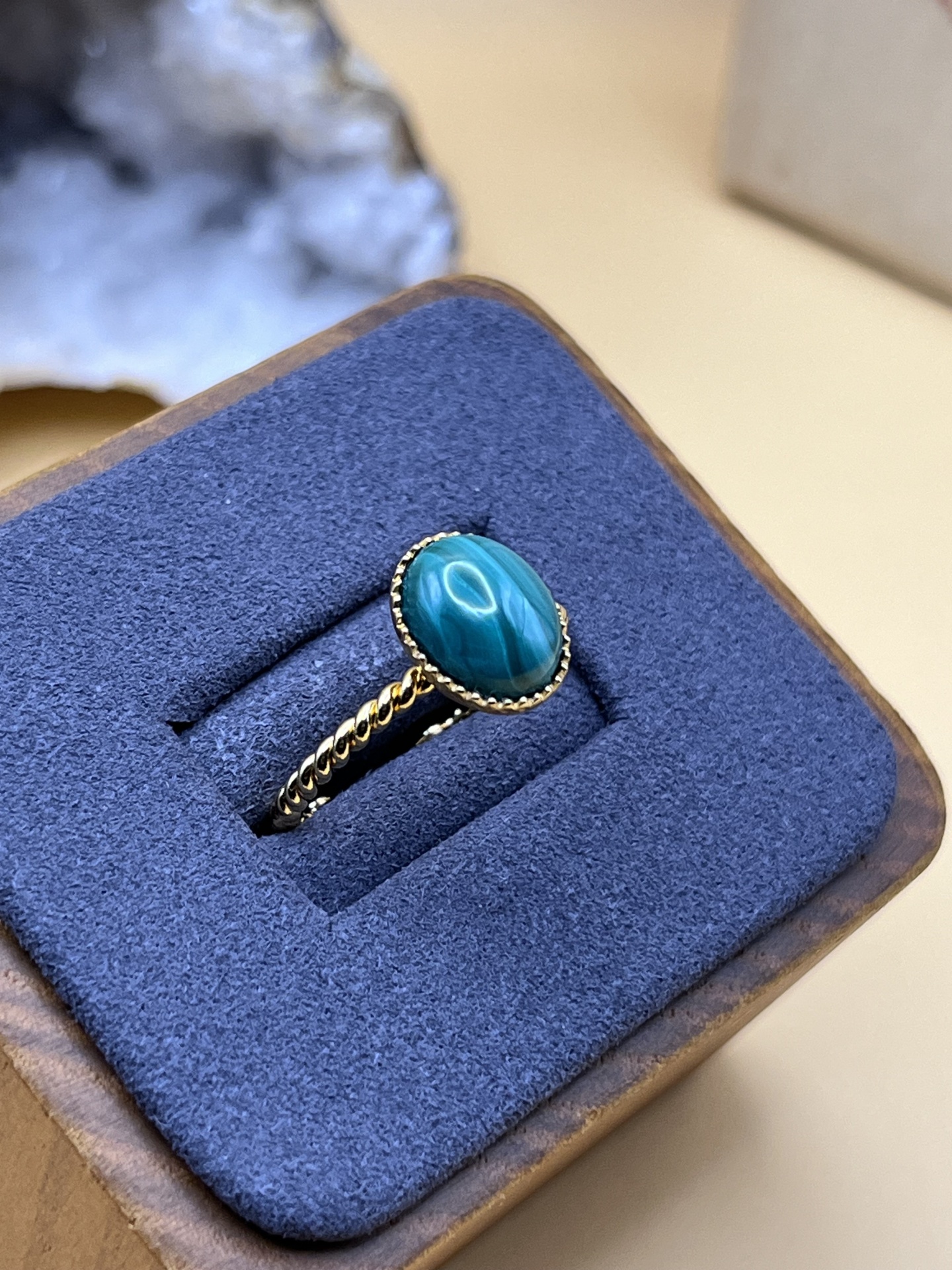 O Anel Torcido Banhado a Ouro com Malaquita – Ajustável, Natural e Sofisticado é uma peça de joalharia em banho de ouro 18k (3 mícrons), com malaquita natural (10x8 mm), escolhida pela sua qualidade e cor única. Torcido e ajustável, adaptável a qualquer dedo para conforto diário.