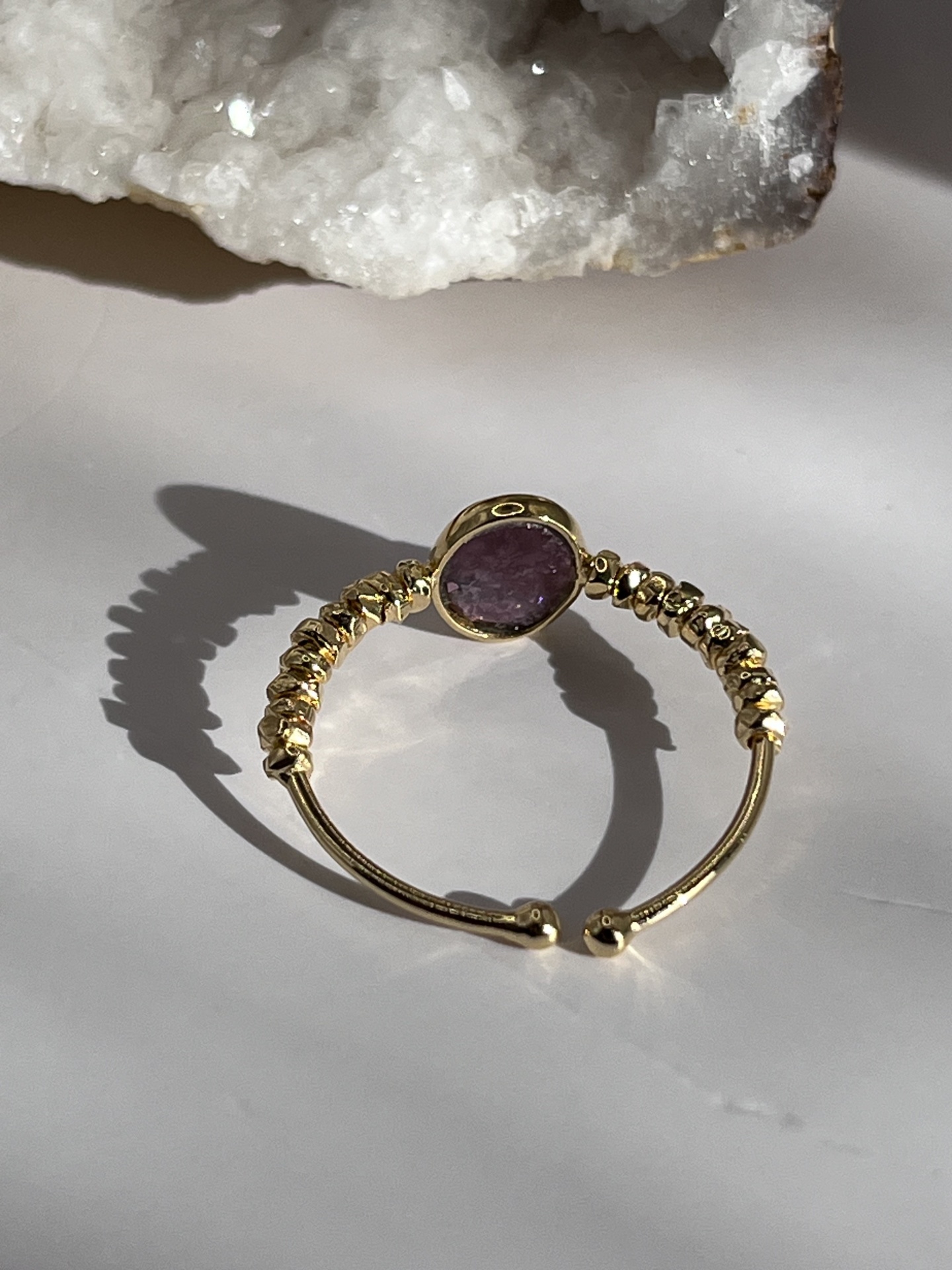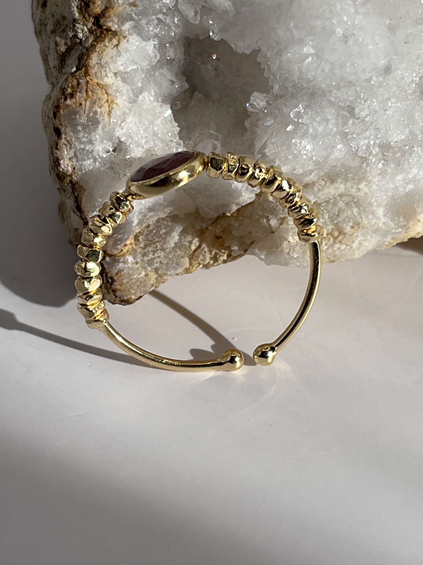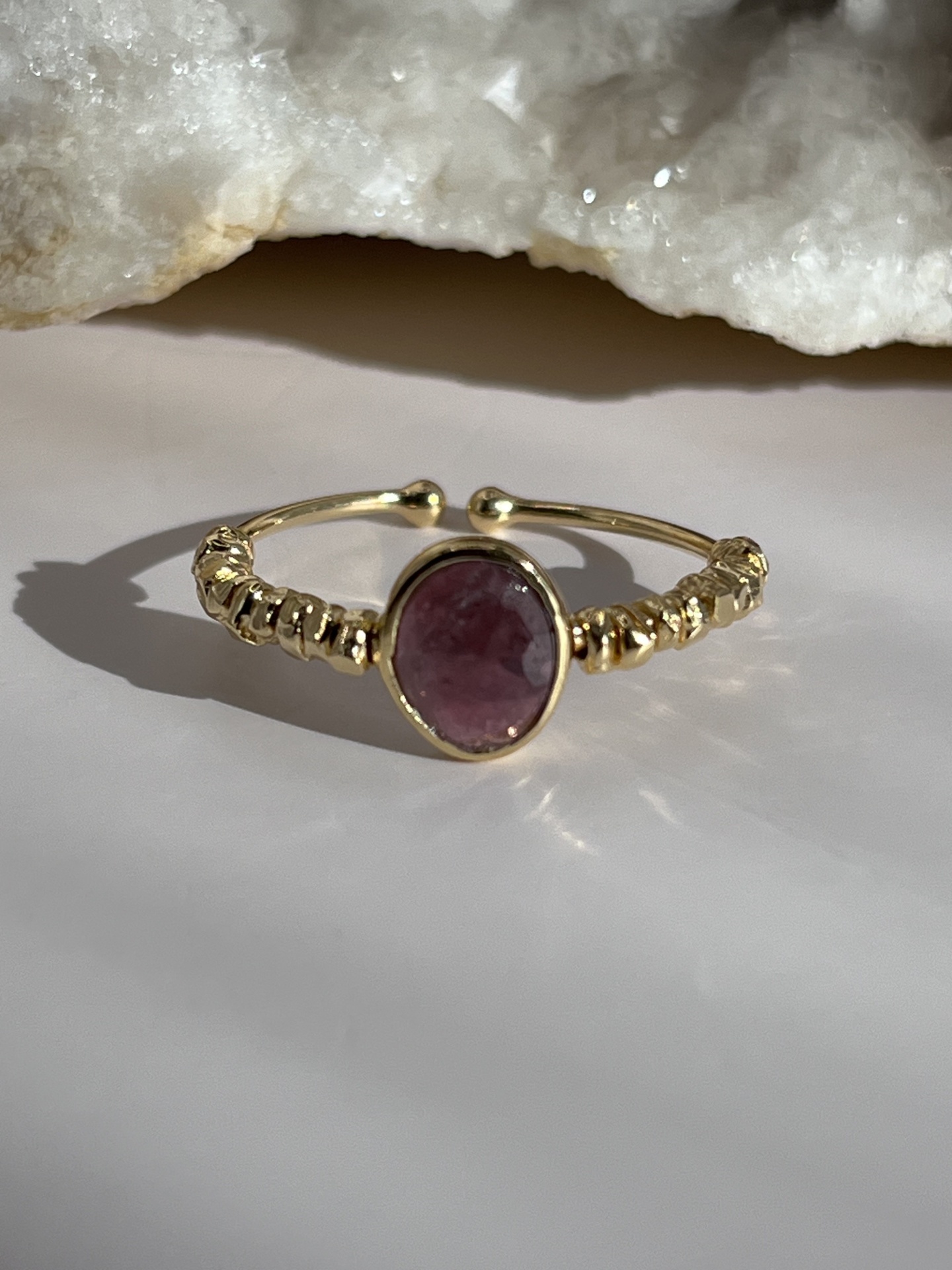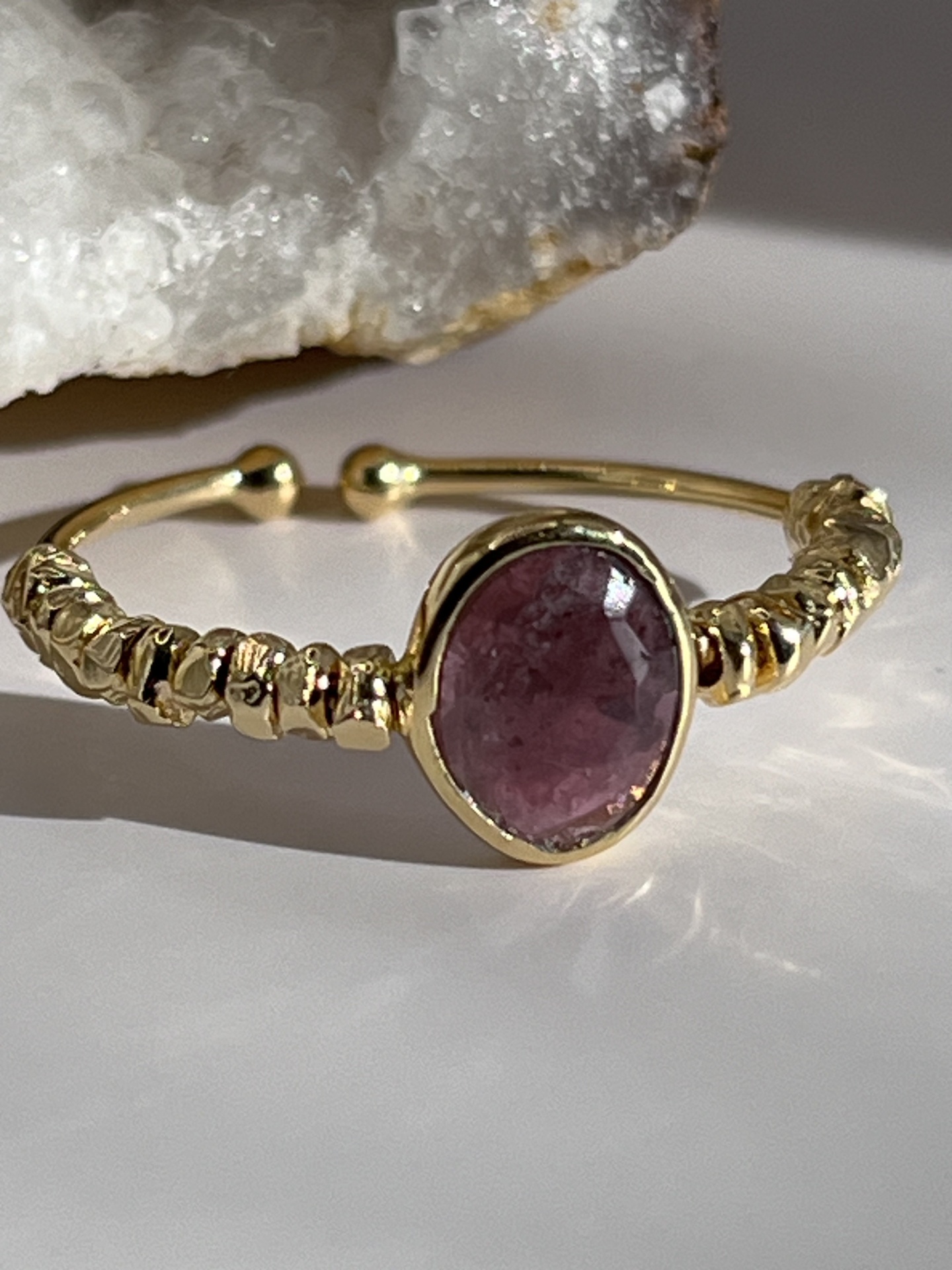 Anel em banho de ouro 18 k (2 μm) com turmalina-rosa natural, de design ajustável para tamanhos 54–60. A pedra destaca-se pelo seu tom delicado e simbolismo de equilíbrio emocional, enquanto o acabamento polido garante brilho e durabilidade no uso diário. Uma joia elegante e versátil, perfeita para realçar o estilo com um toque de cor e significado.