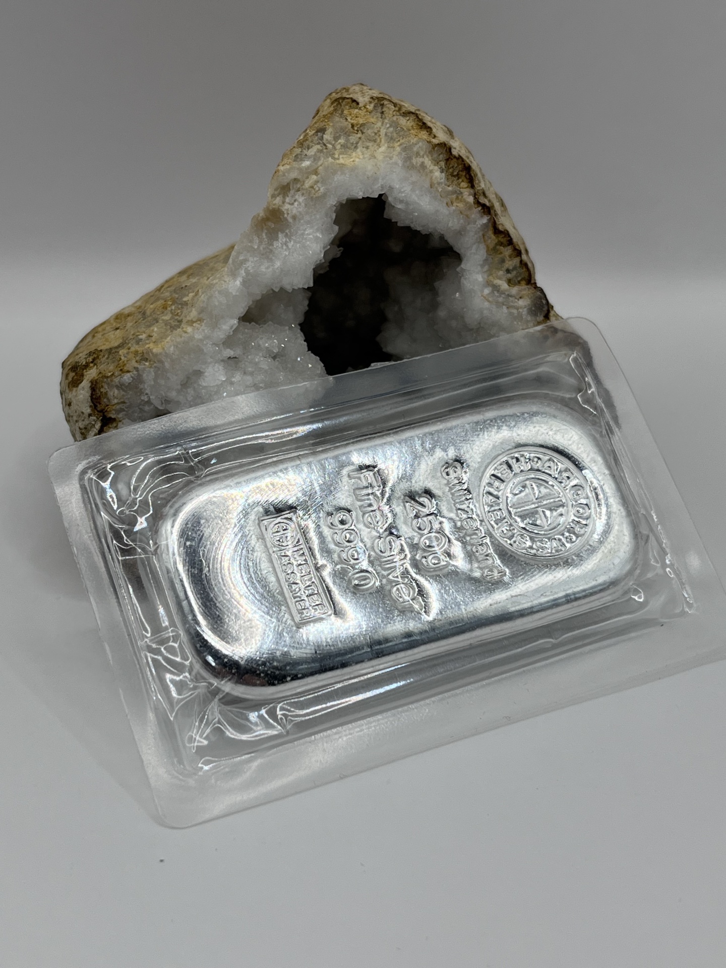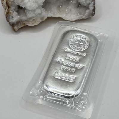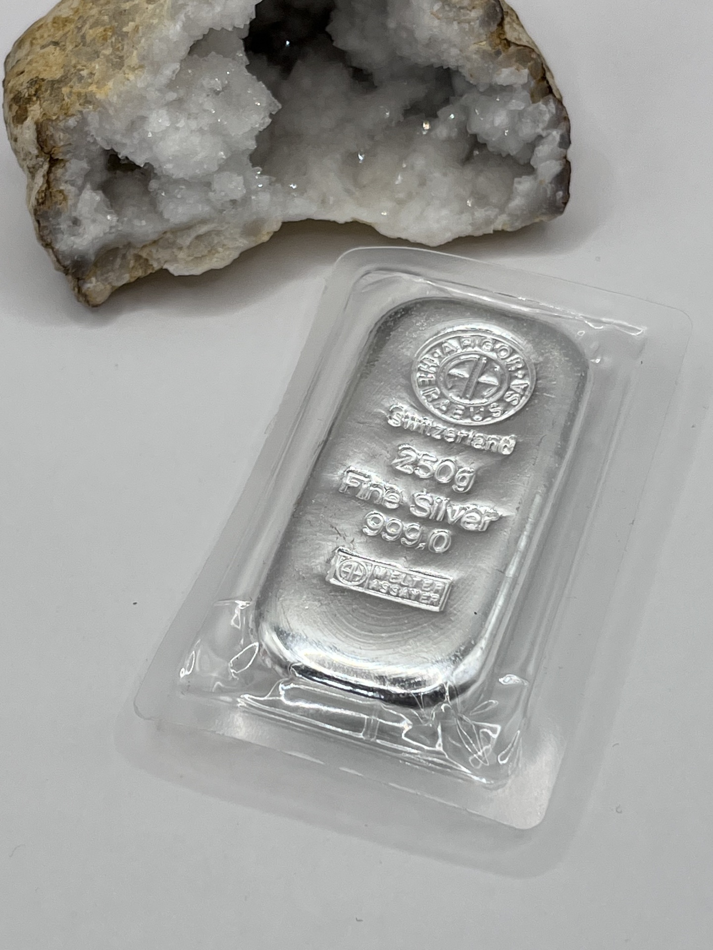 A Barra de Prata Argor Heraeus 250 g combina engenharia suíça e pureza .999 num formato equilibrado para investidores e colecionadores. Acabamento impecável, marcação clara de peso e pureza, e a reputação de uma das refinarias mais respeitadas do mundo. Um objeto de valor tangível com estética intemporal.