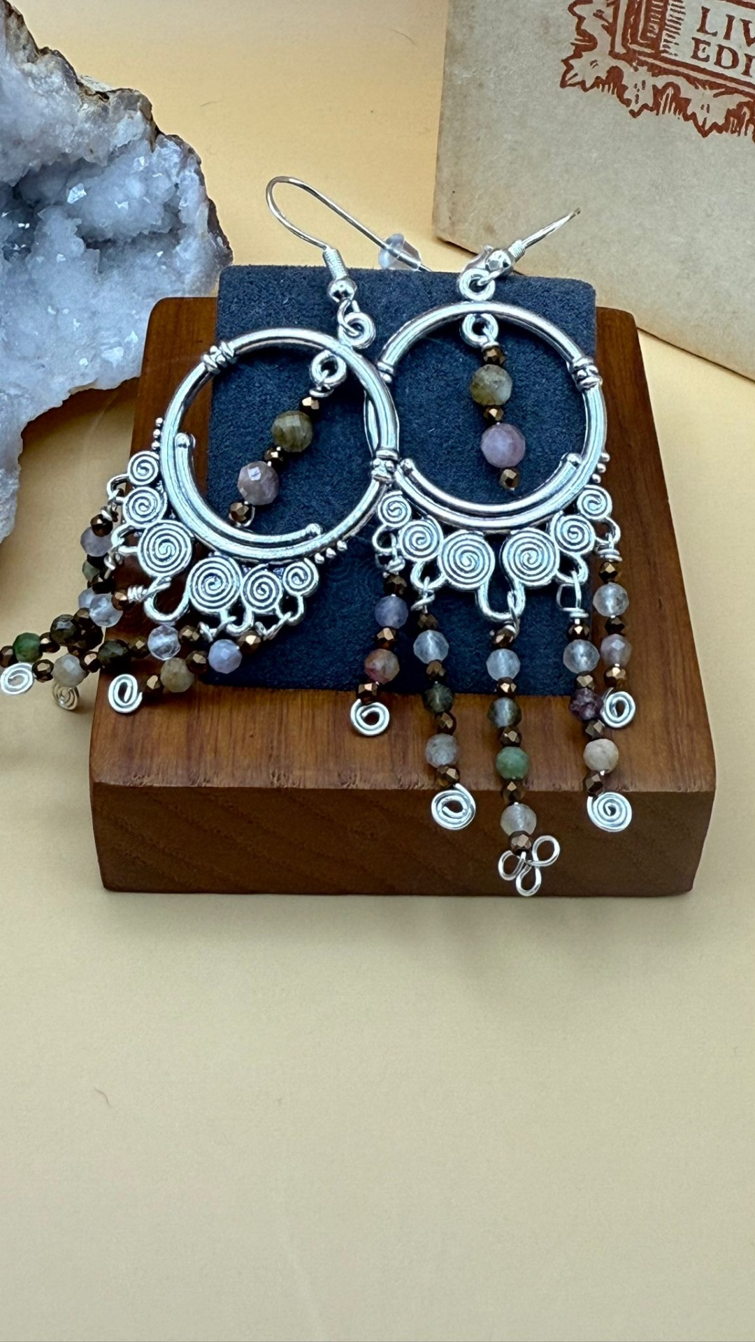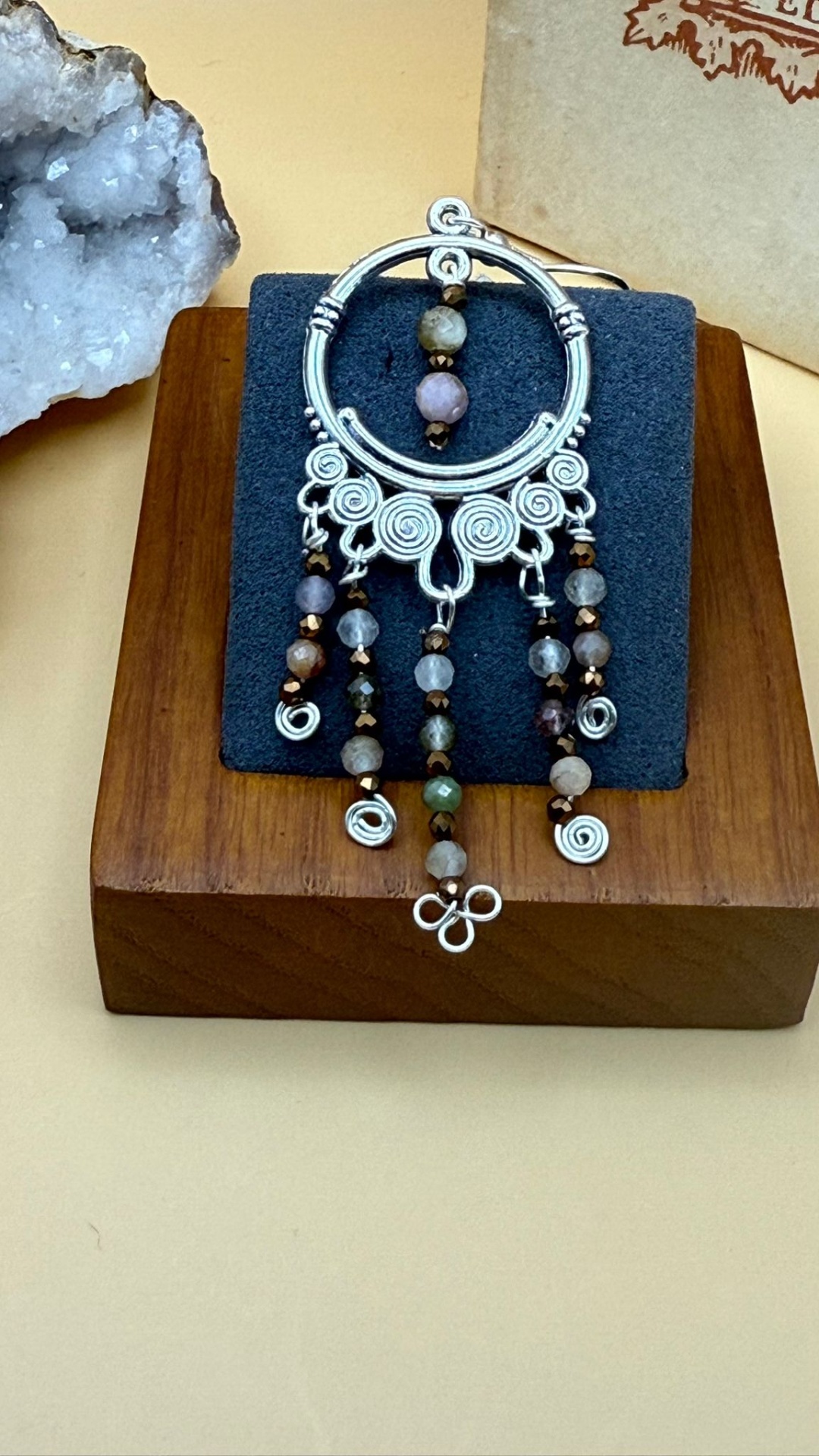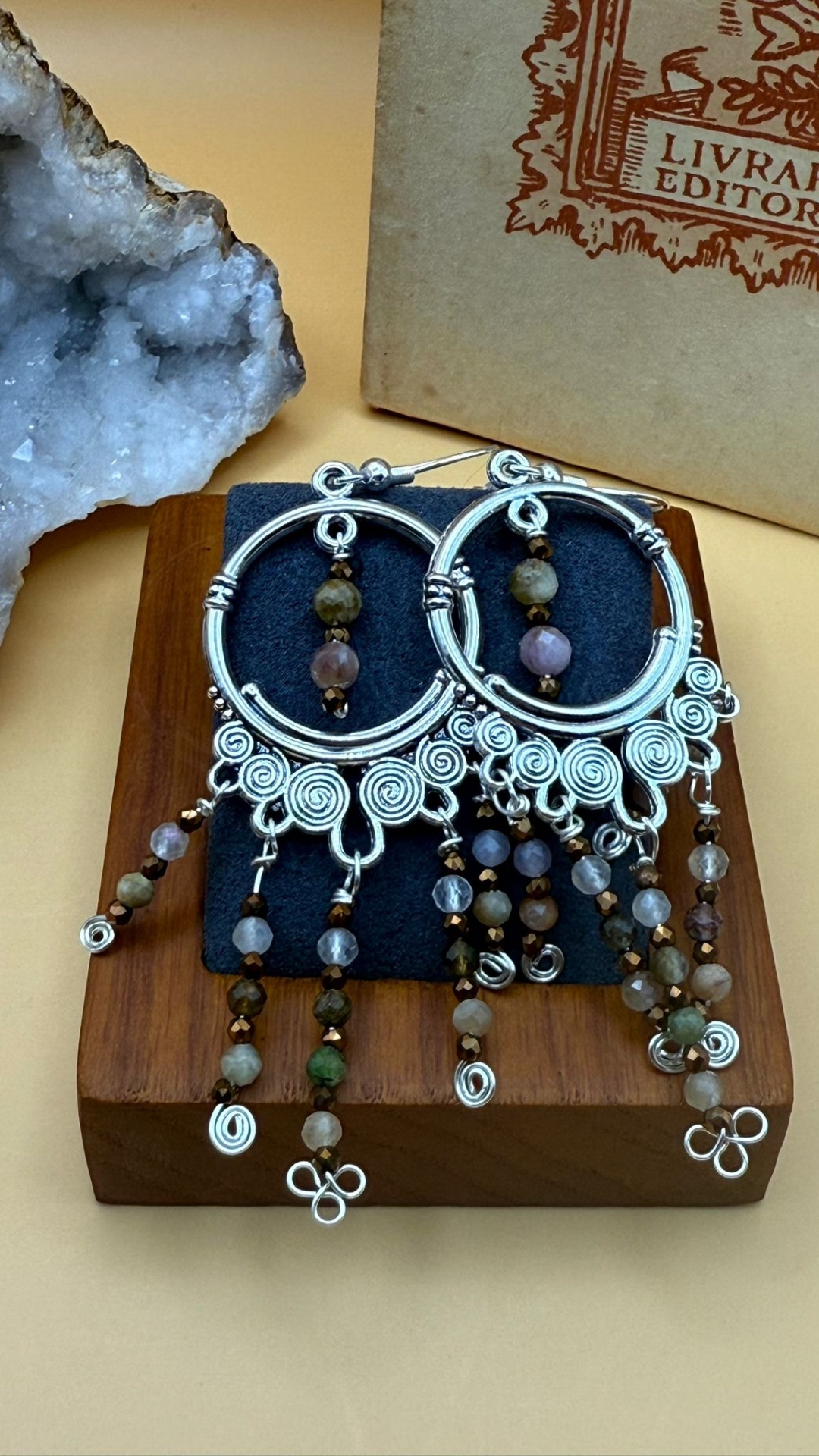 Estes brincos em aço inoxidável com pedras naturais de labradorite destacam-se pelo seu design artesanal, inspirado em crioulos ornamentados, que combinam elegância, leveza e movimento.