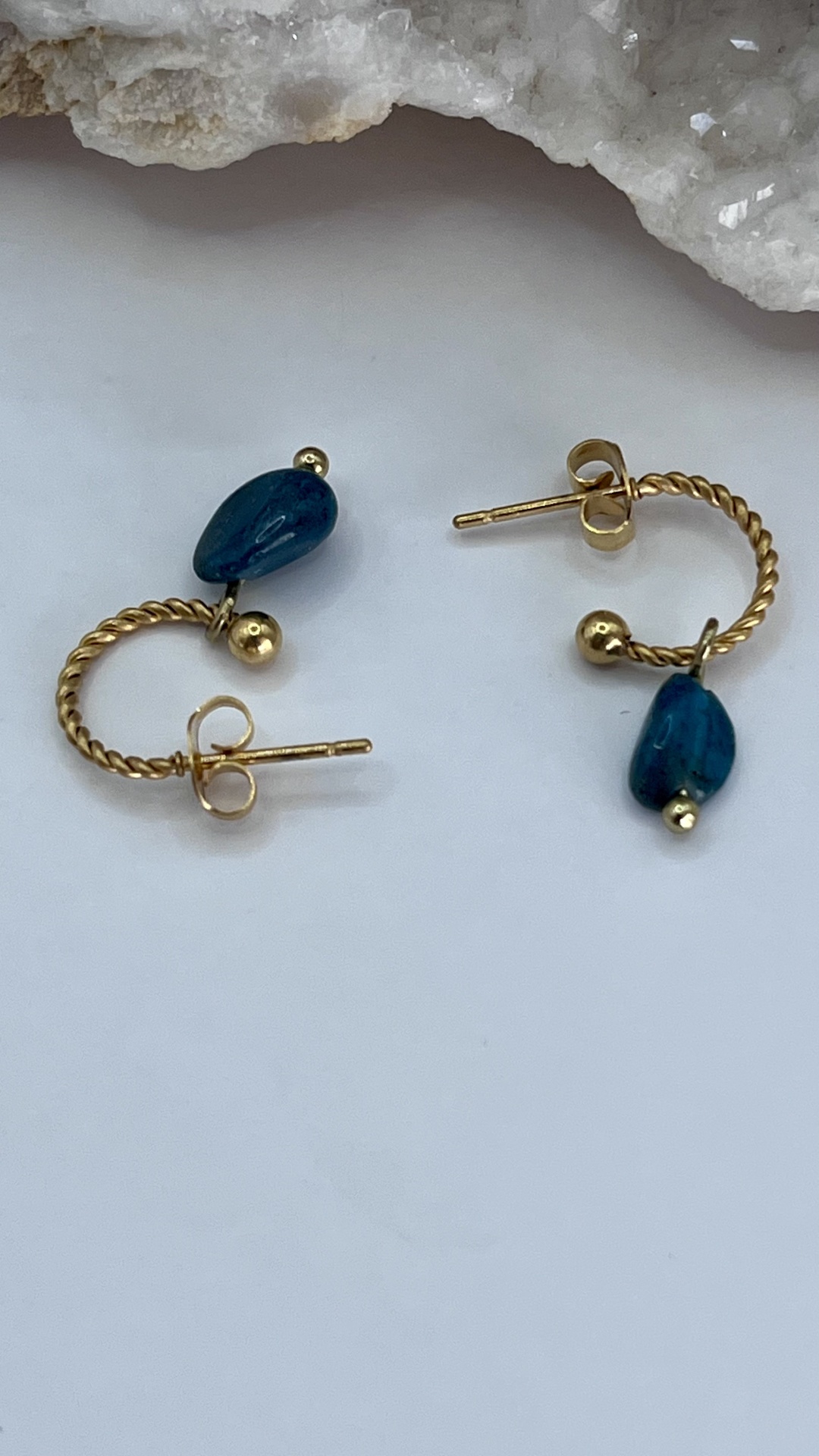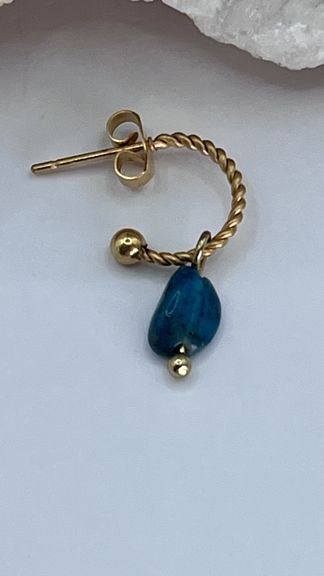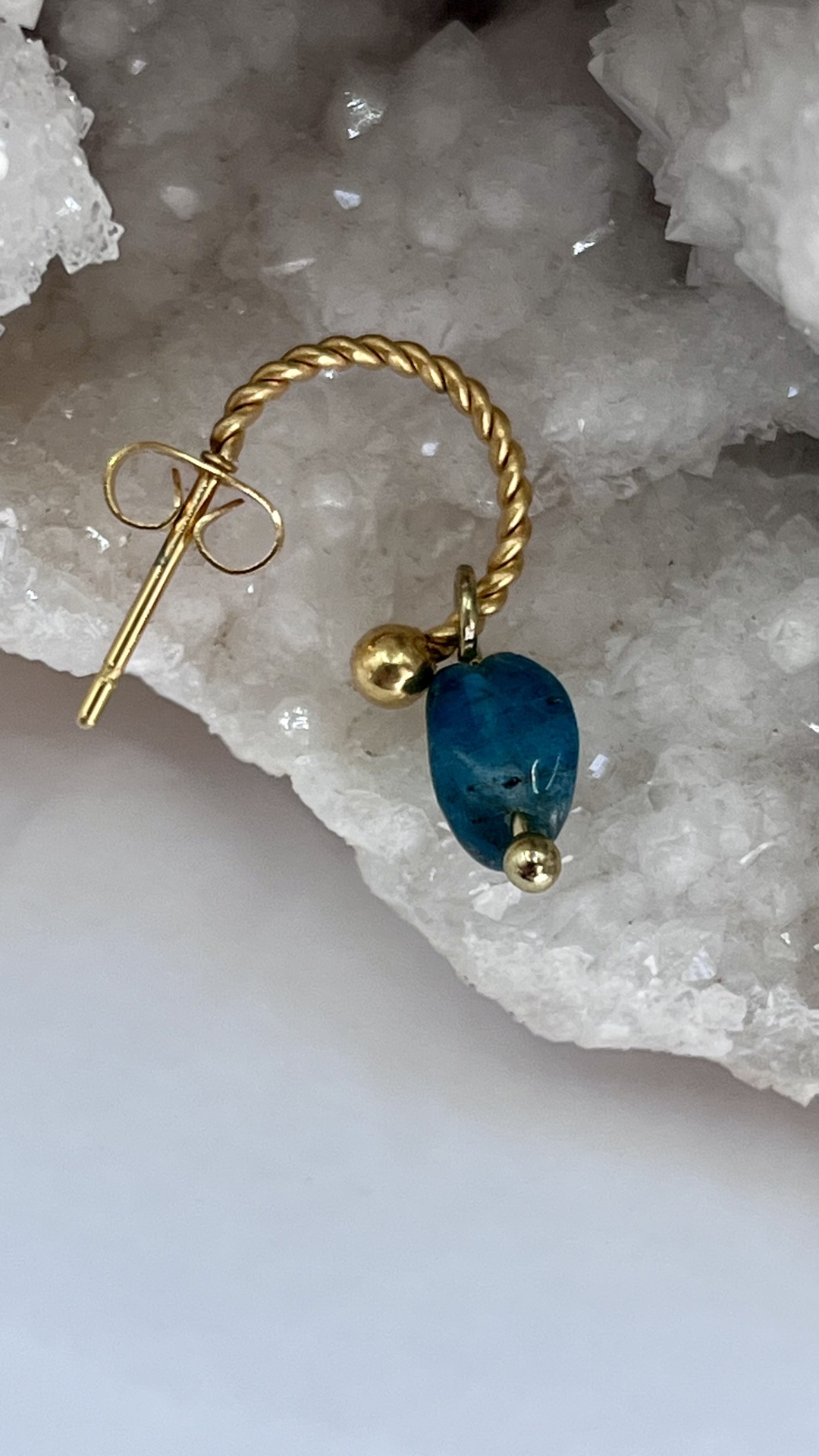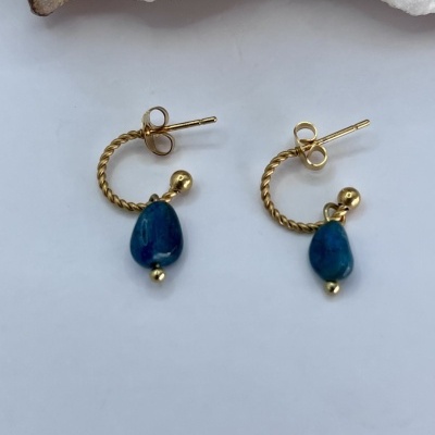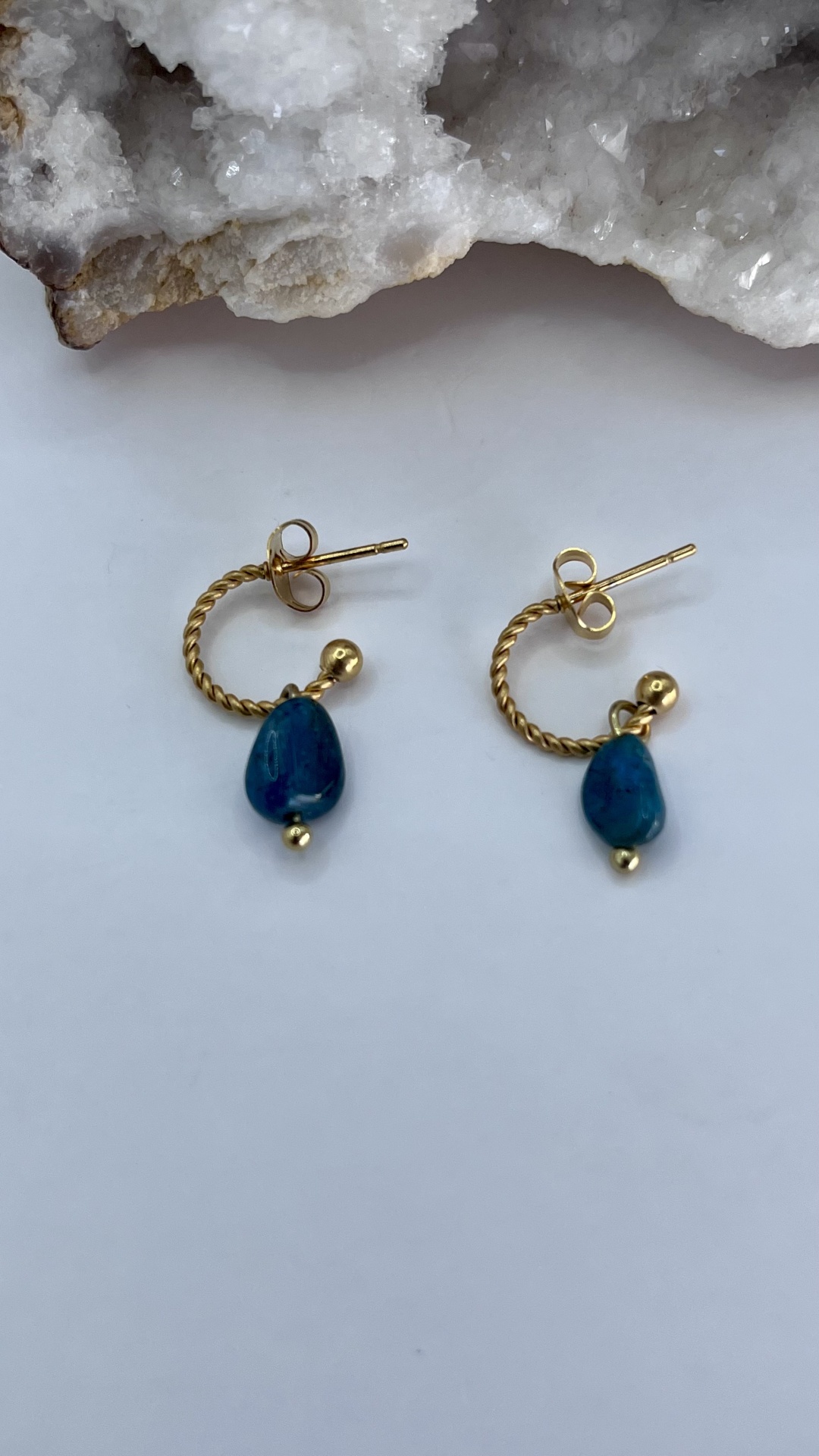Com design semi-aberto em formato de crioulos de 12 mm, estas peças são adornadas com a pedra apatite natural, que confere um brilho vibrante e um toque exclusivo a cada par. Conhecida pelas suas propriedades ligadas à inspiração e à comunicação, a apatite acrescenta ainda mais significado a esta joia.