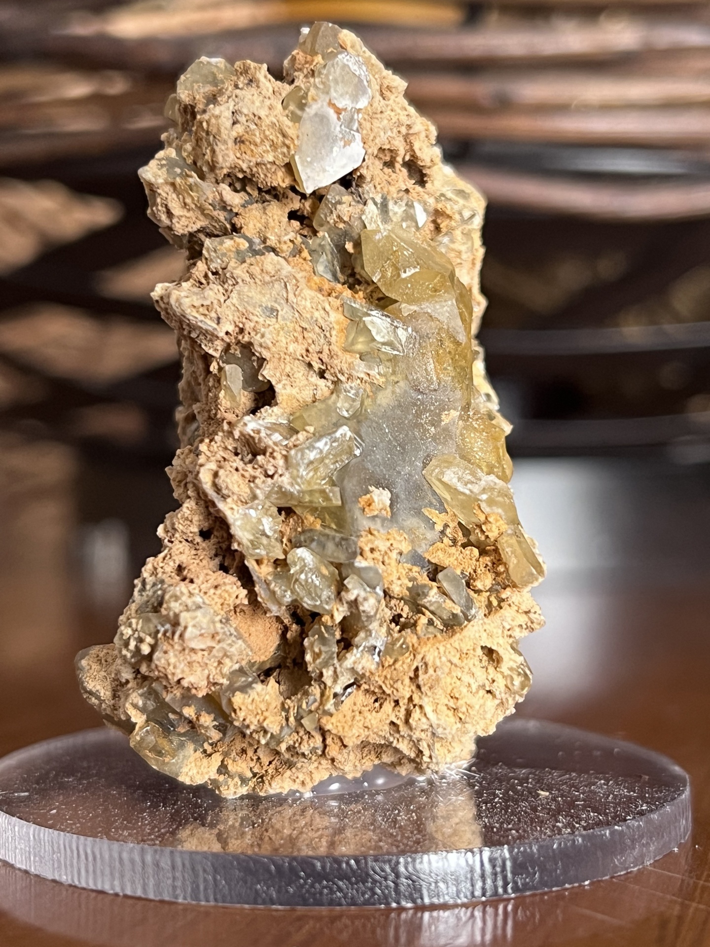 Este exemplar é uma calcita cristalizada em matriz, apresentando cristais translúcidos a levemente amarelados, com faces bem definidas e crescimento natural preservado.