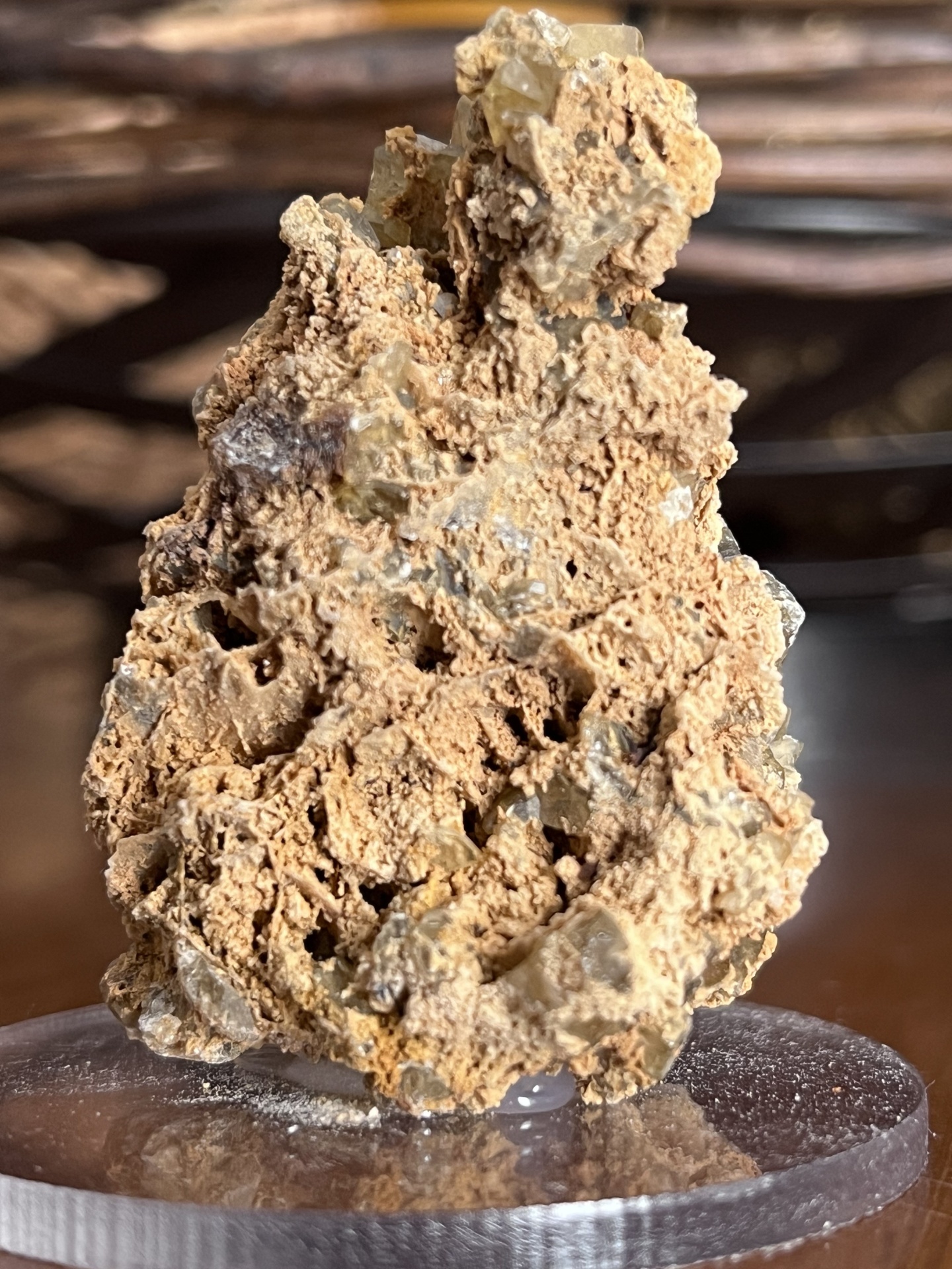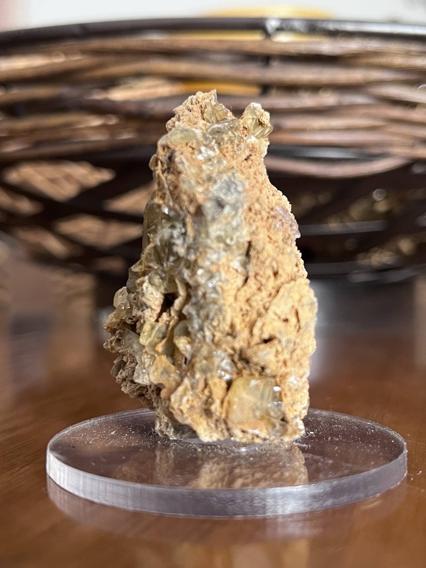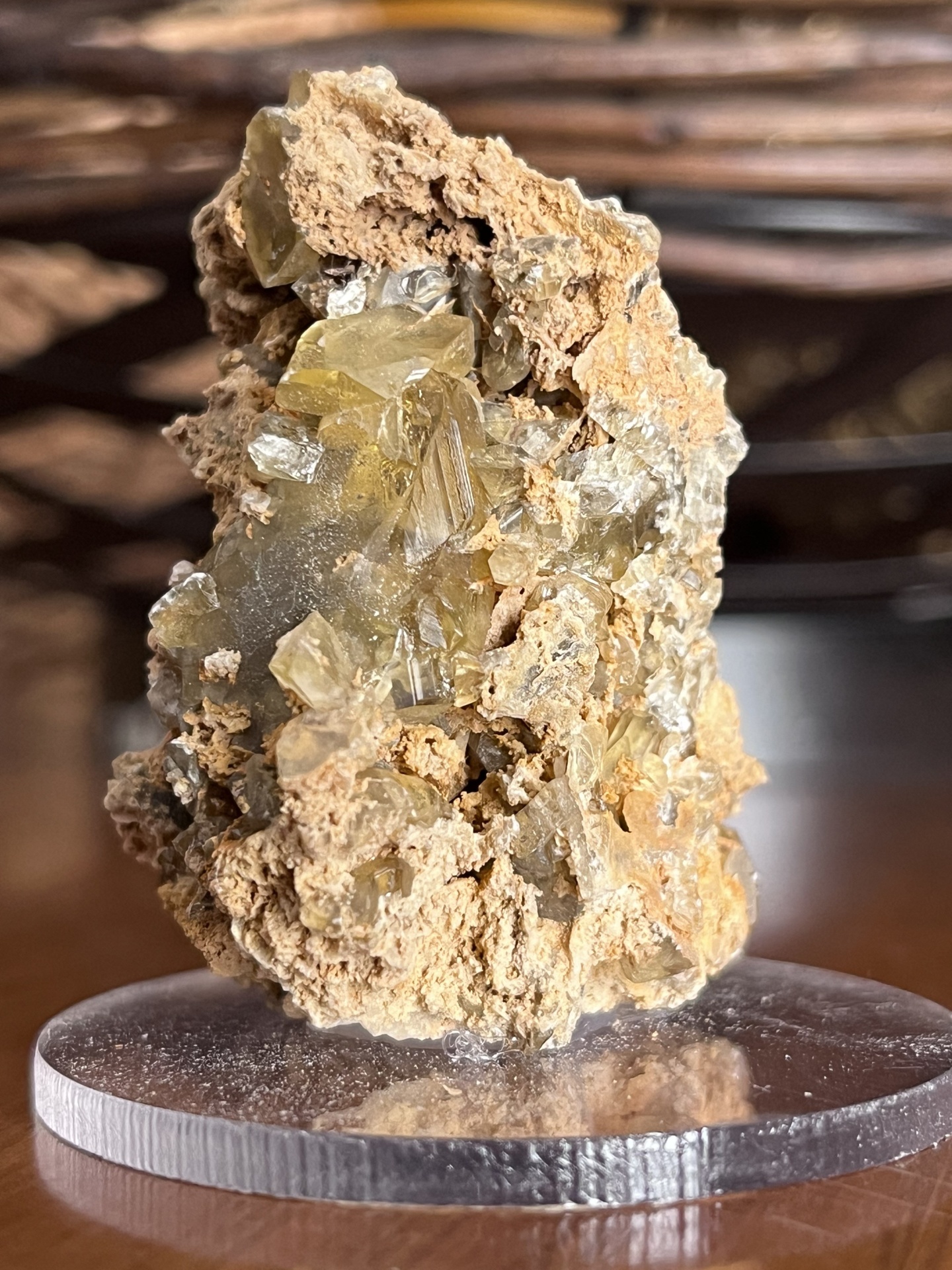 Pelas suas características visuais e pelo tipo de cristalização, a origem é considerada provavelmente Montevecchio, uma histórica região mineira da Sardenha, Itália, conhecida pelos seus exemplares clássicos de calcita associados a antigos filões minerais.