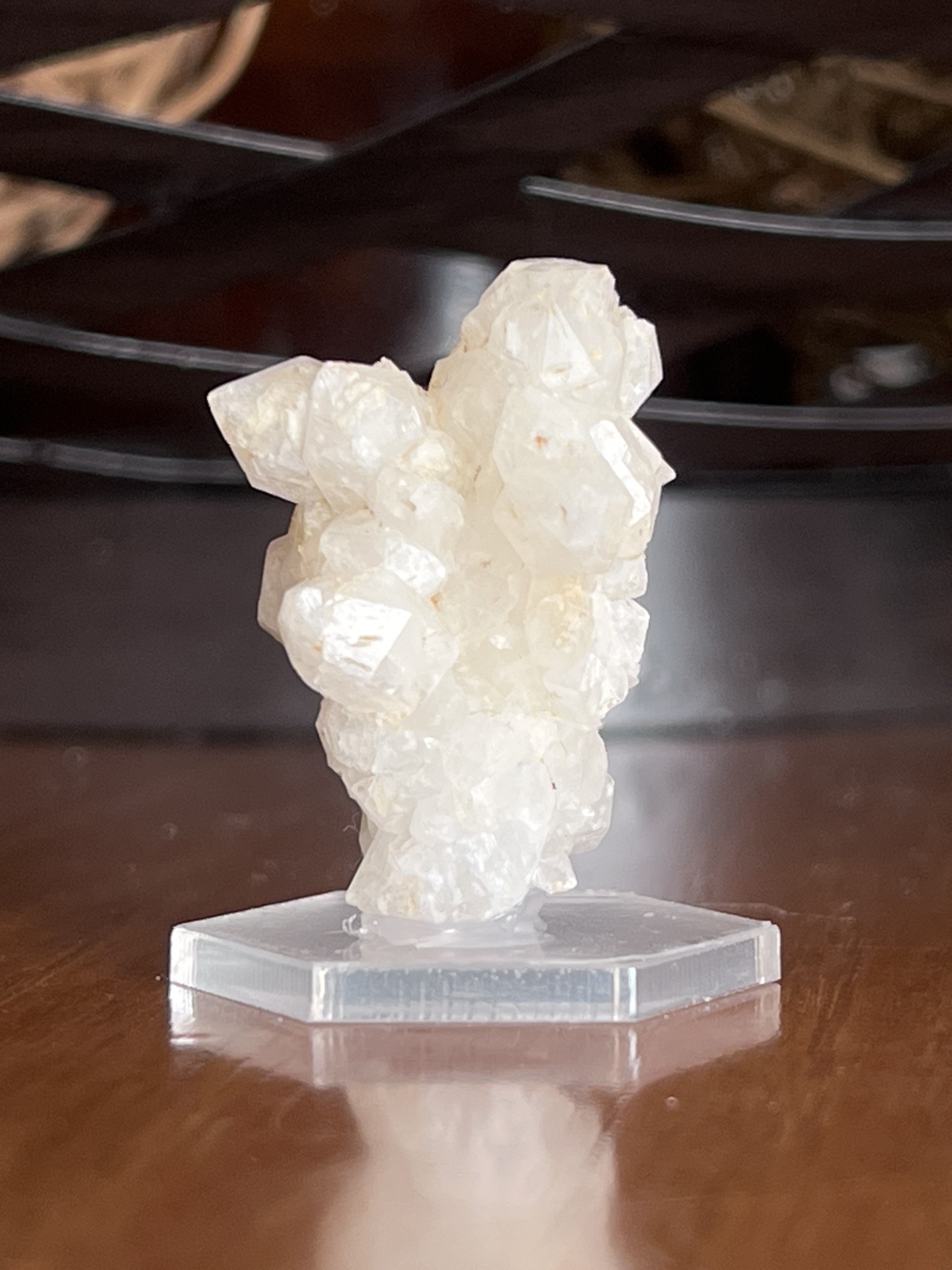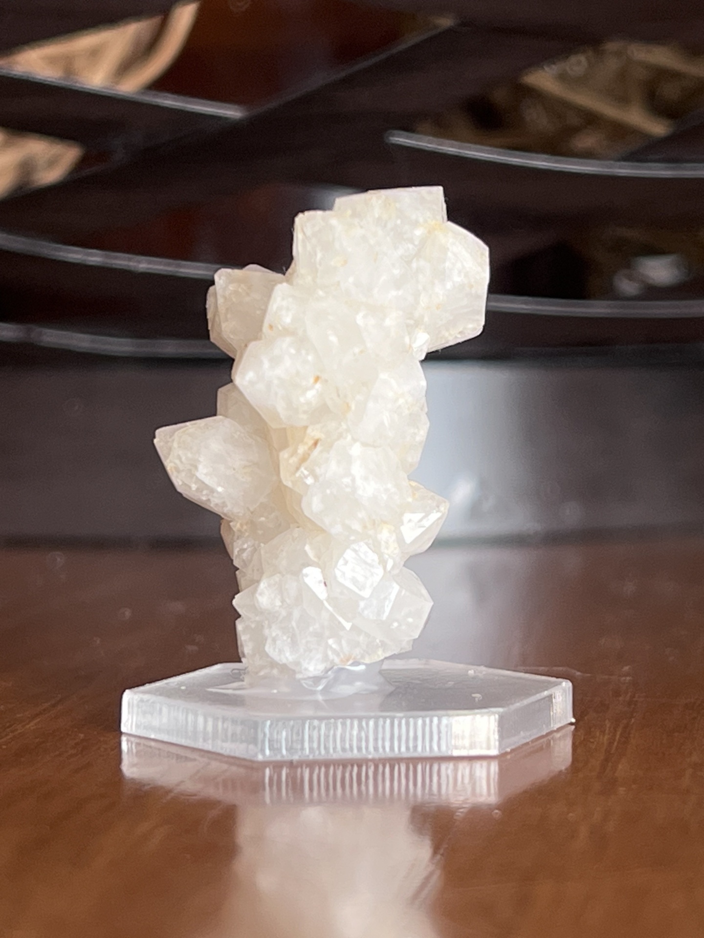 Este exemplar é uma calcita cristalizada em matriz, apresentando um agregado de cristais bem formados, de coloração branco-leitosa a translúcida e brilho vítreo suave.