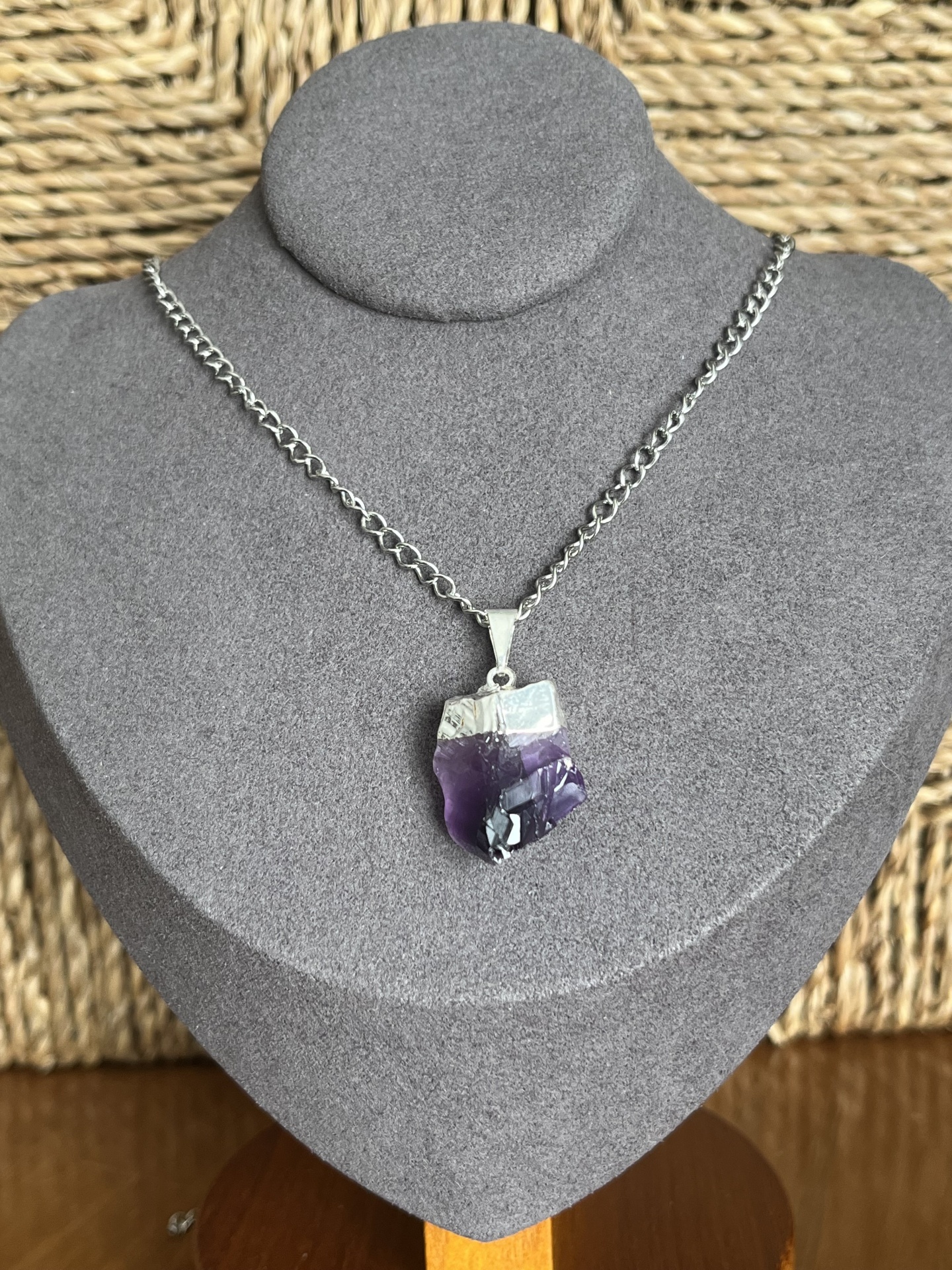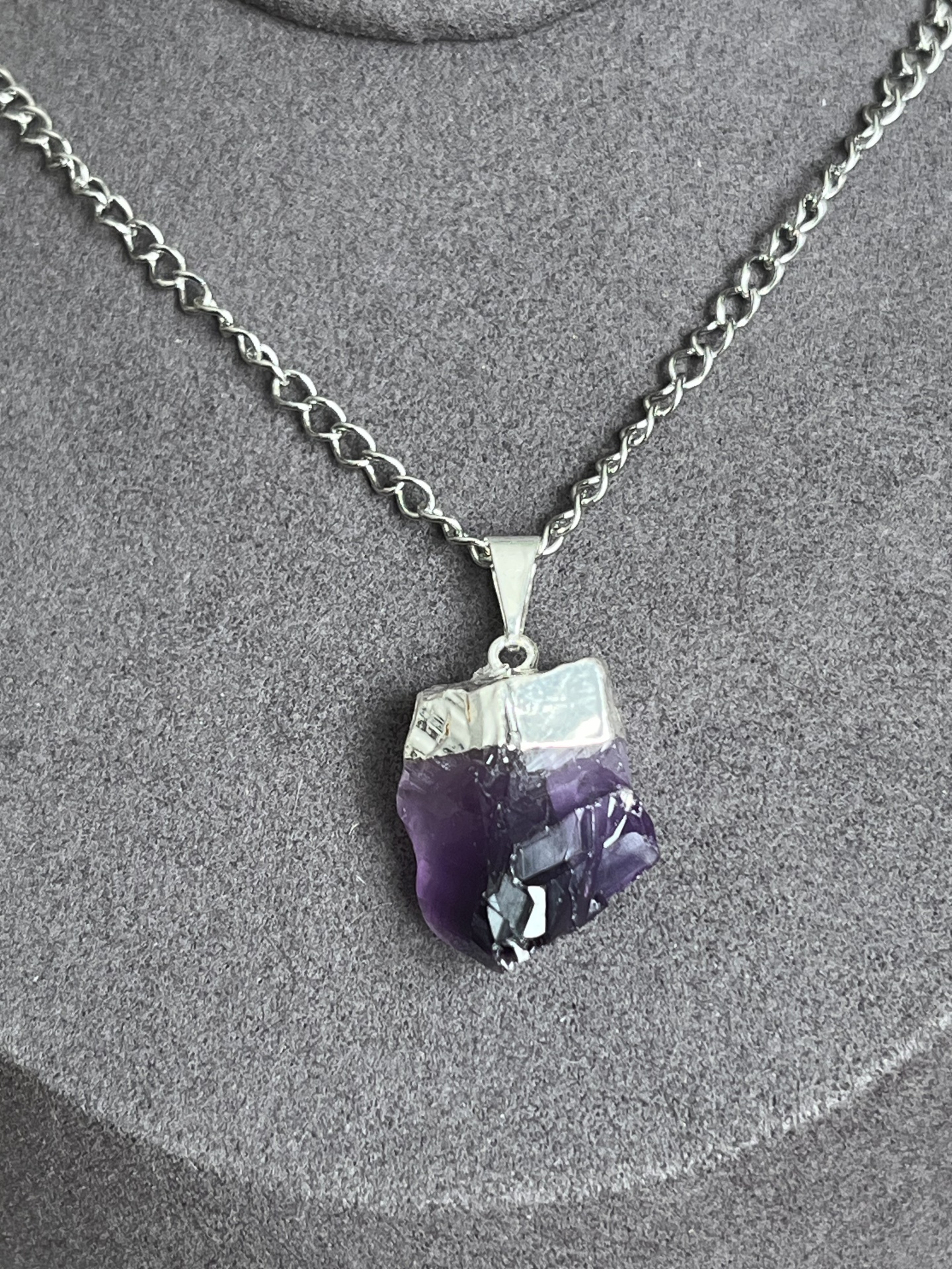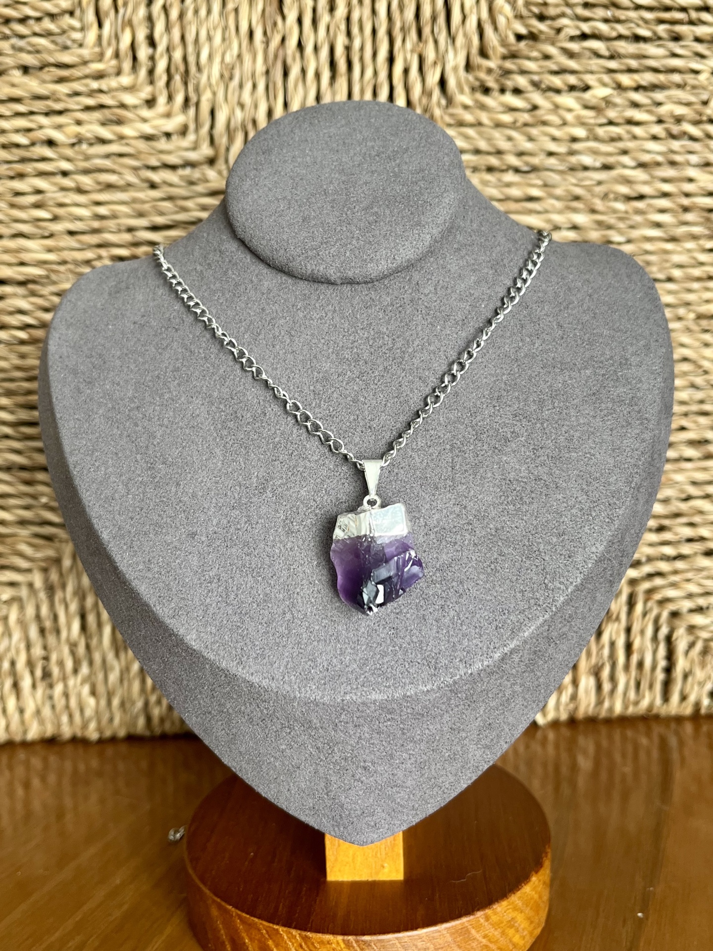 Colar em Aço Inoxidável com Pendente de Ametista Natural Bruta