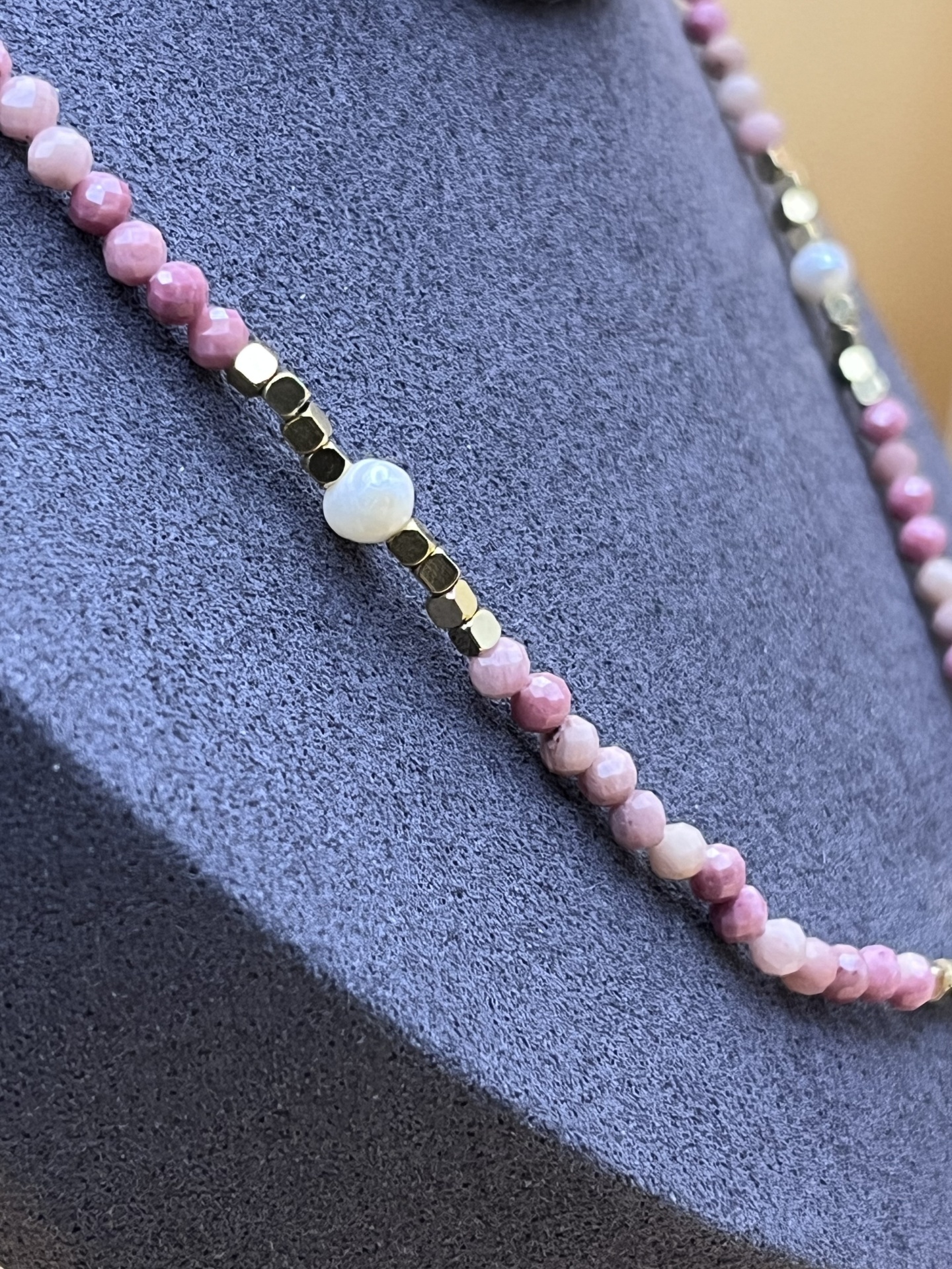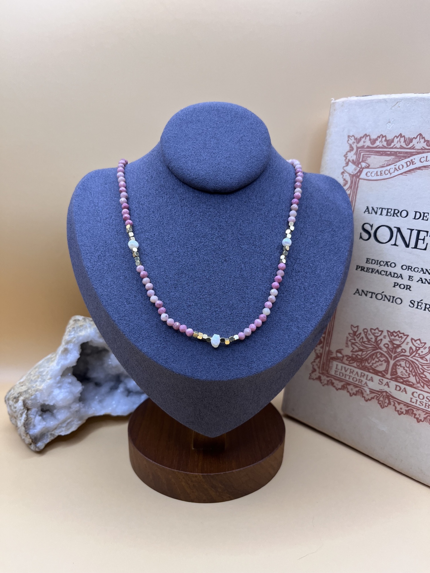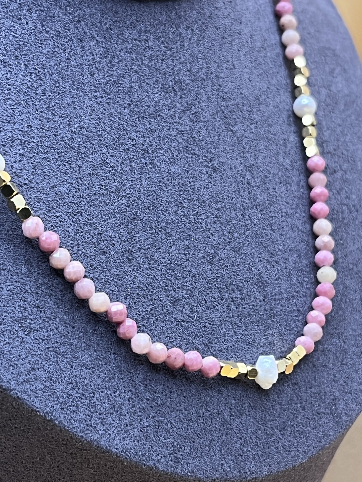 As contas de pedra natural facetadas, com 3 mm de diâmetro, proporcionam brilho sutil e requinte ao design. Já as pérolas de água doce adicionam um elemento clássico e atemporal. — o colar se adapta a diferentes estilos e ocasiões.