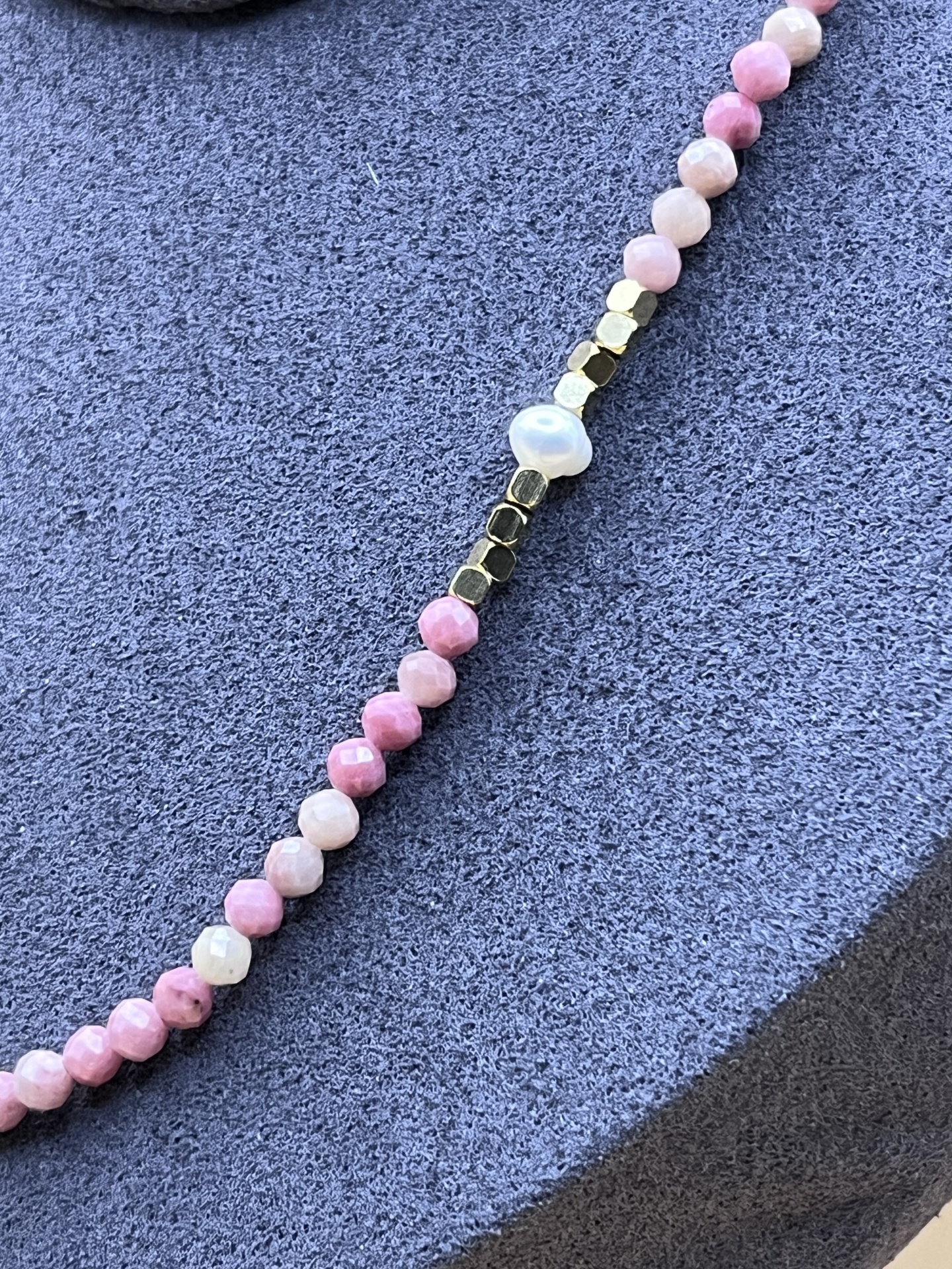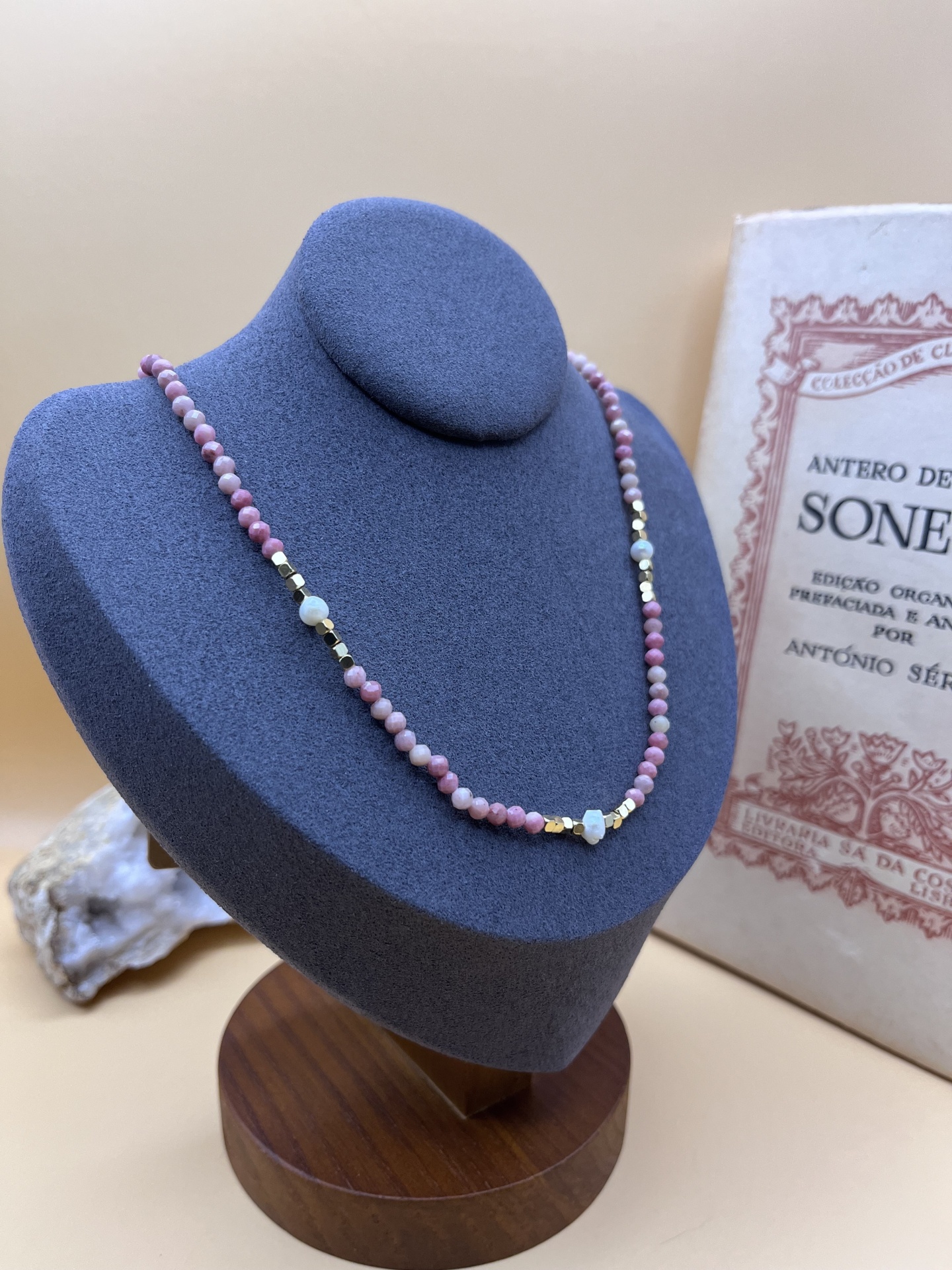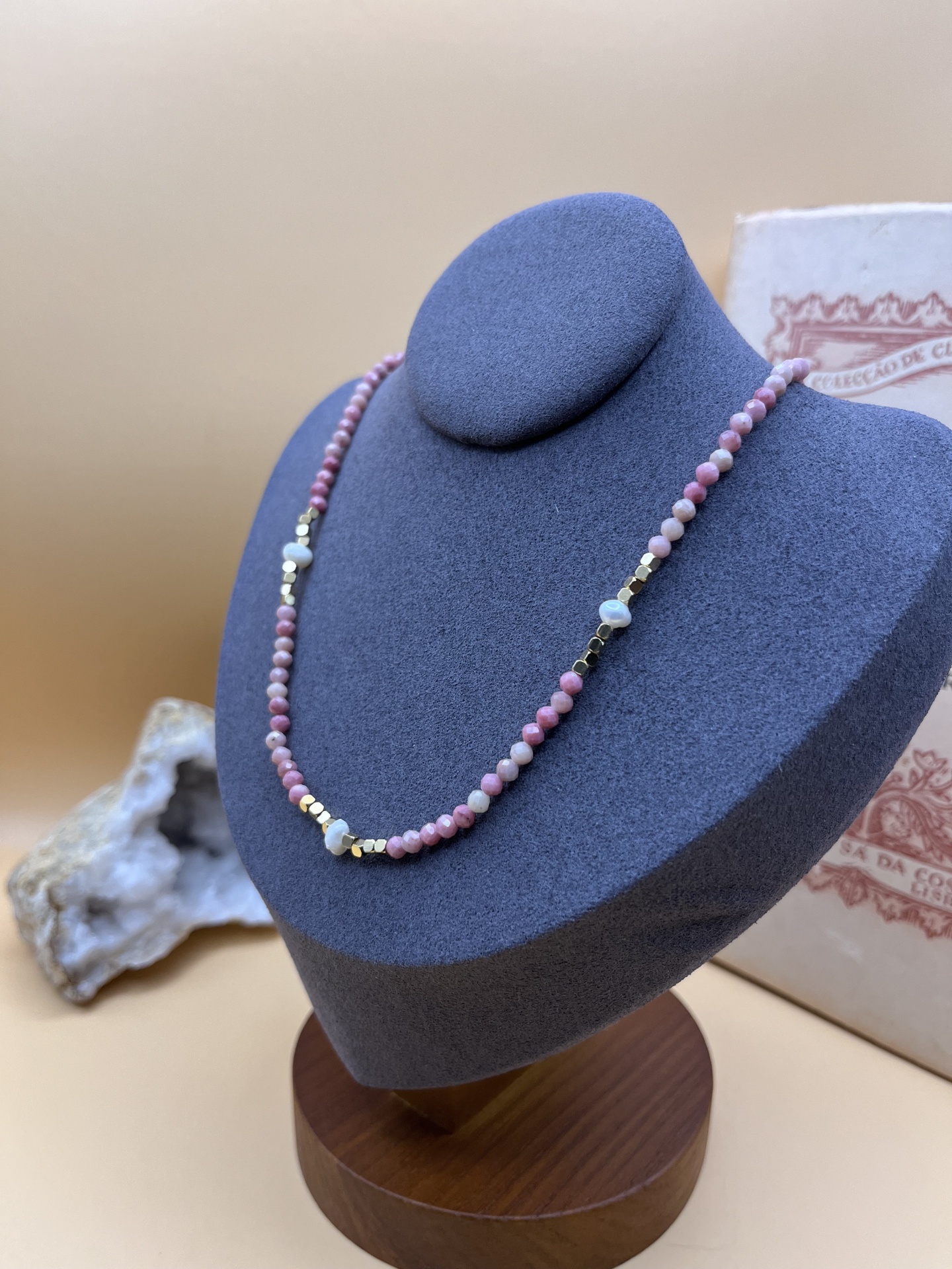 As contas de pedra natural facetadas, com 3 mm de diâmetro, proporcionam brilho sutil e requinte ao design. Já as pérolas de água doce adicionam um elemento clássico e atemporal. — o colar se adapta a diferentes estilos e ocasiões.
