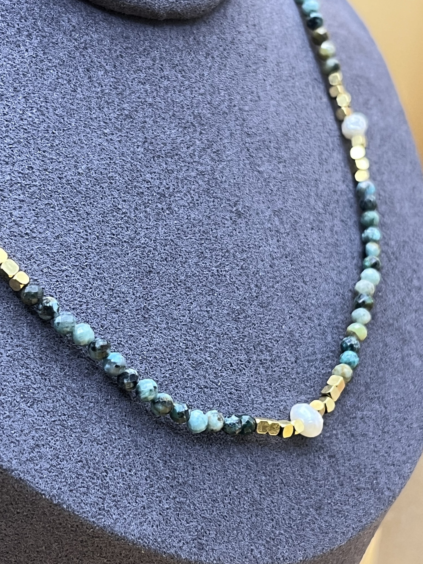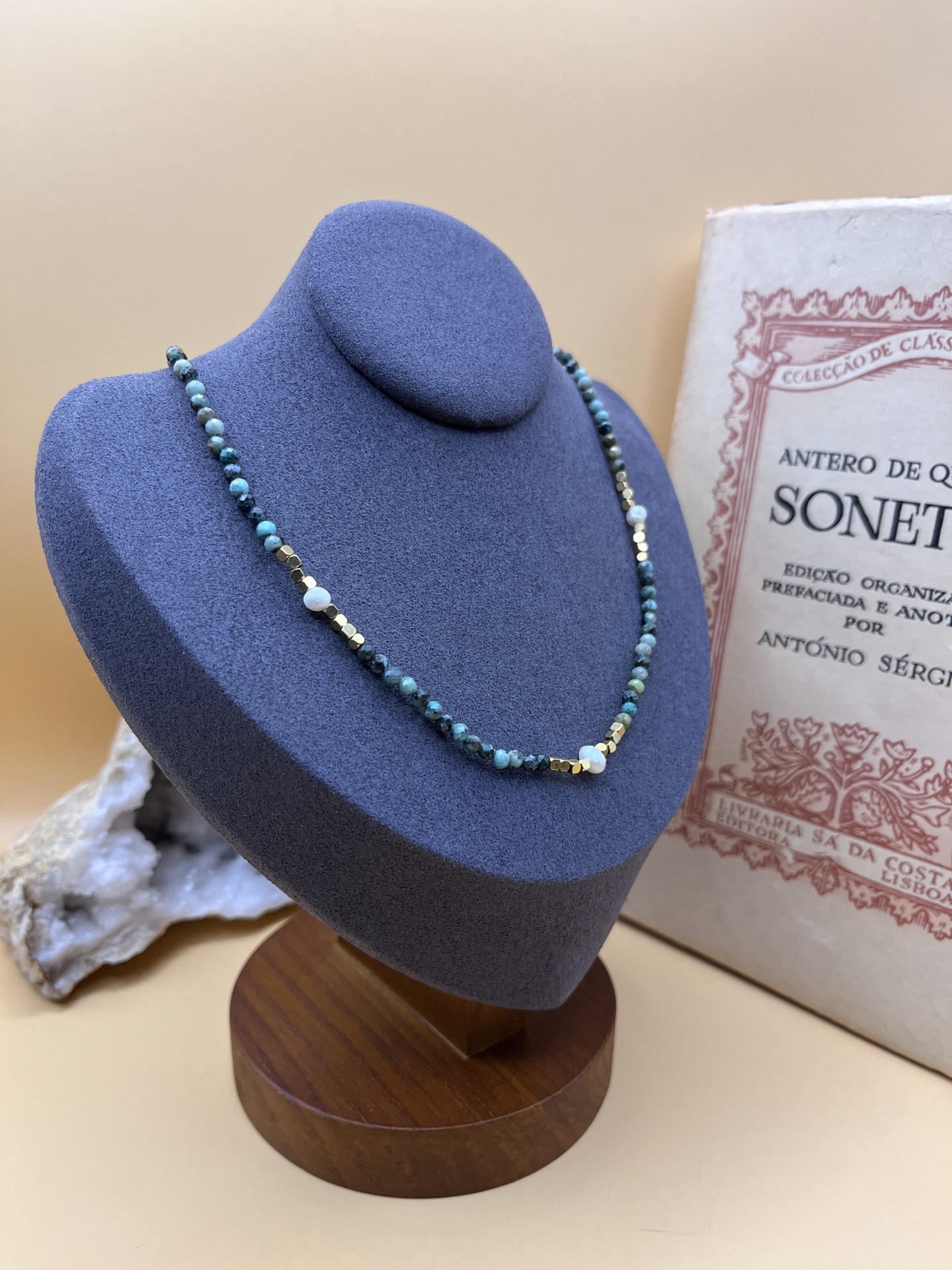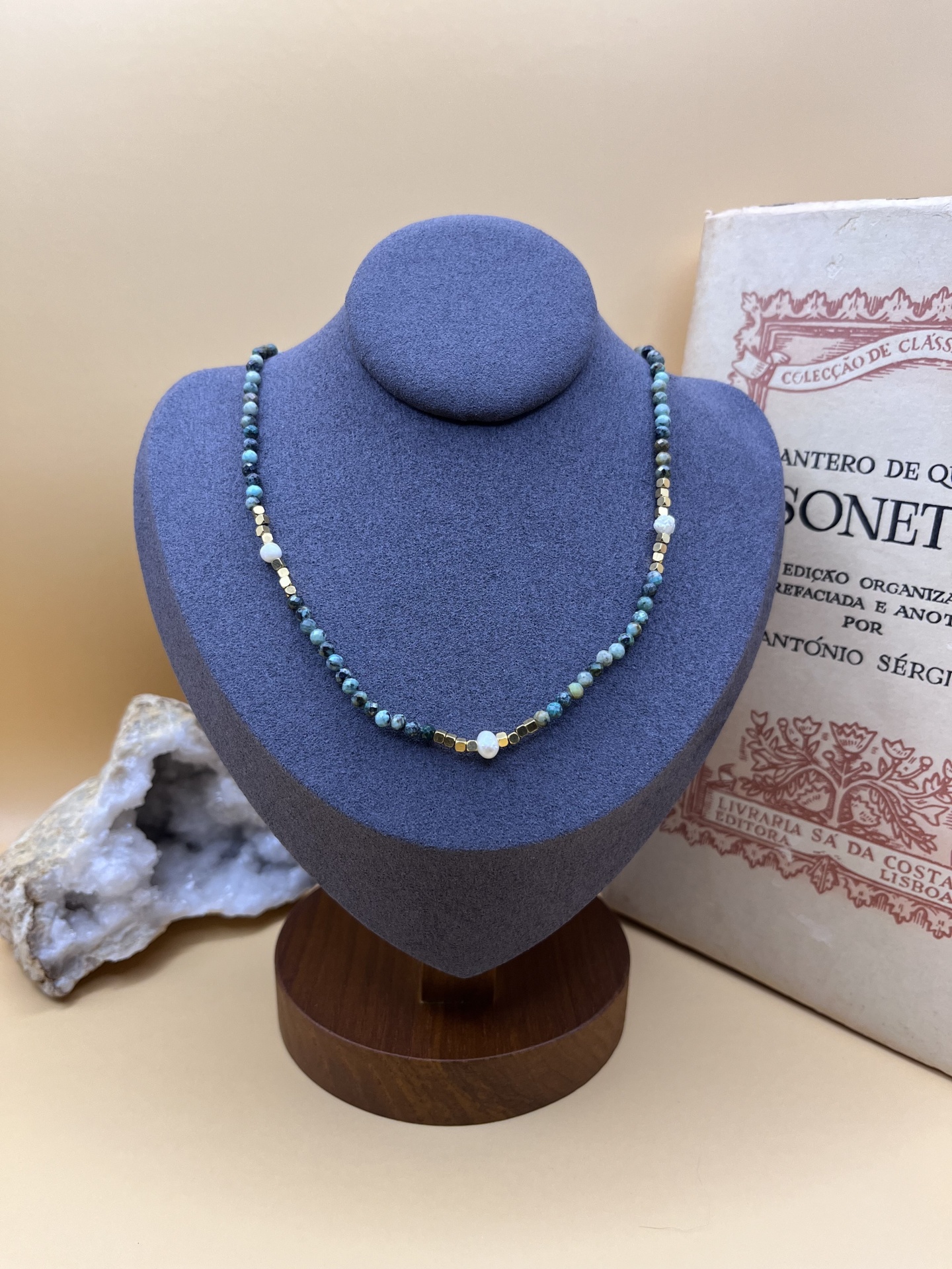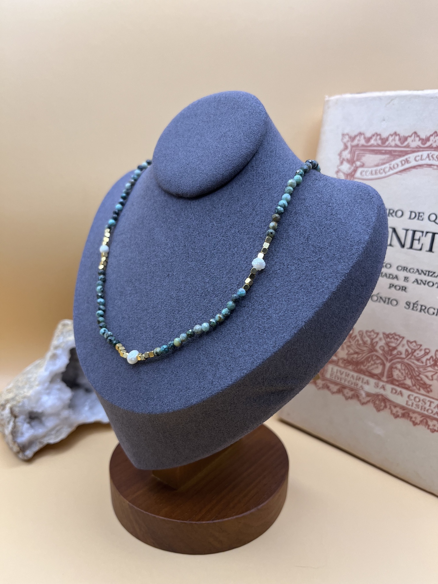 As contas de pedra natural facetadas, com 3 mm de diâmetro, proporcionam brilho sutil e requinte ao design. Já as pérolas de água doce adicionam um elemento clássico e atemporal. — o colar se adapta a diferentes estilos e ocasiões.