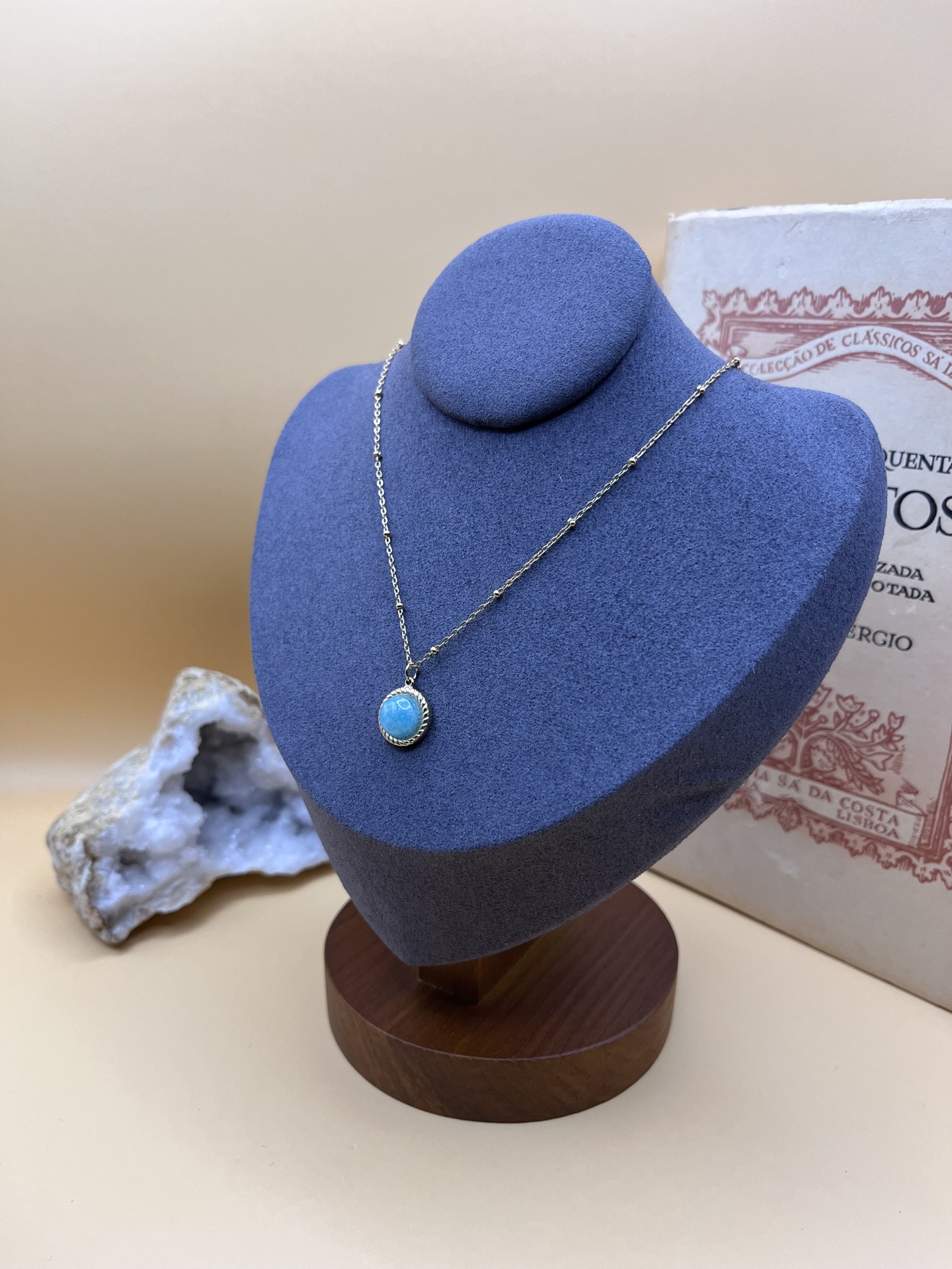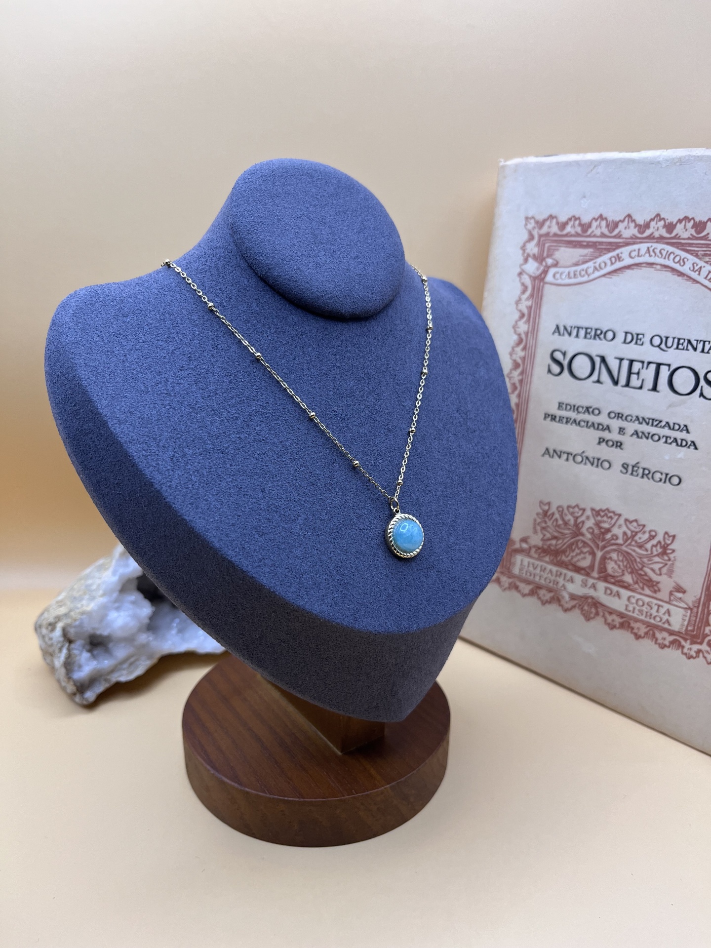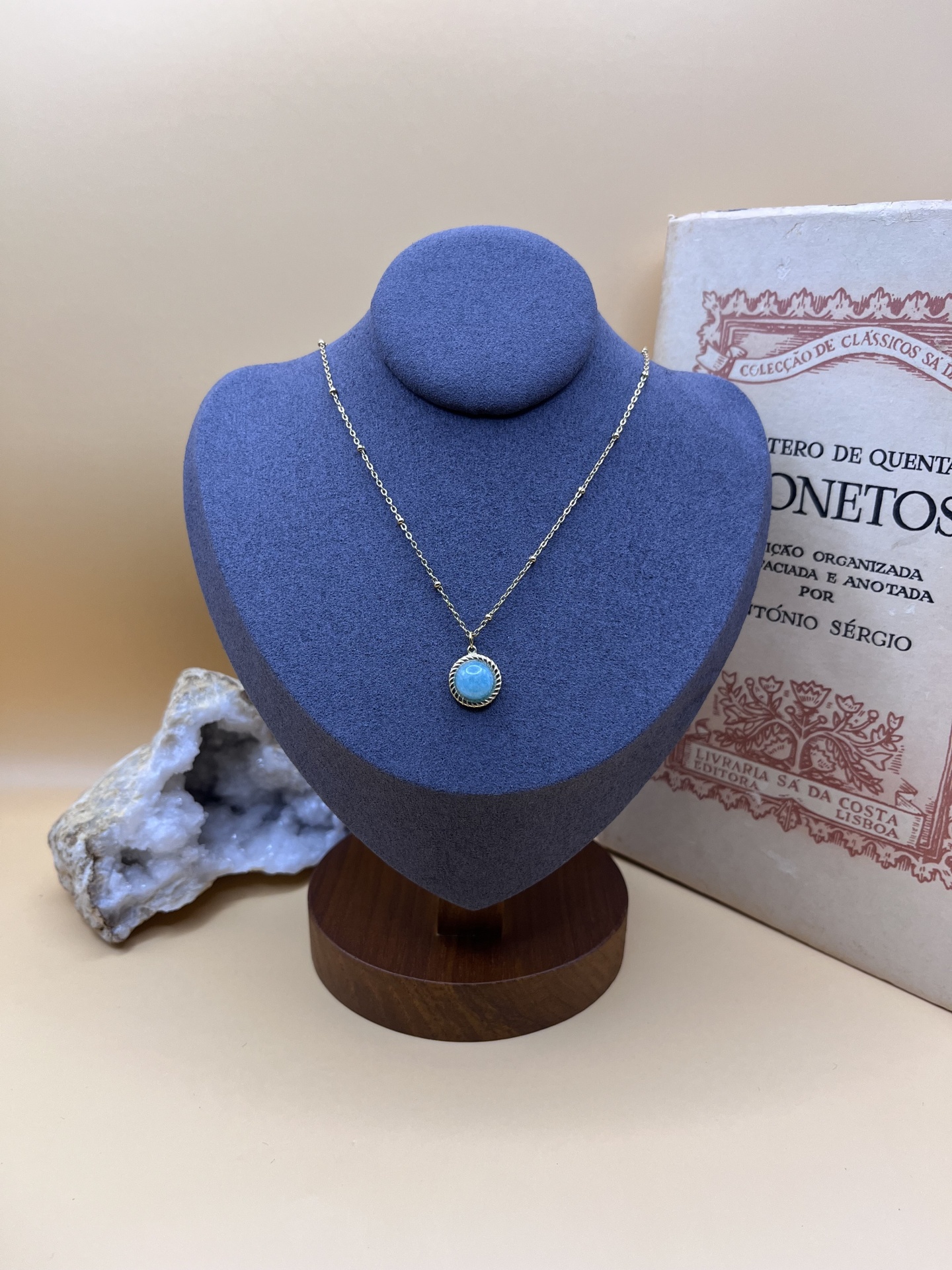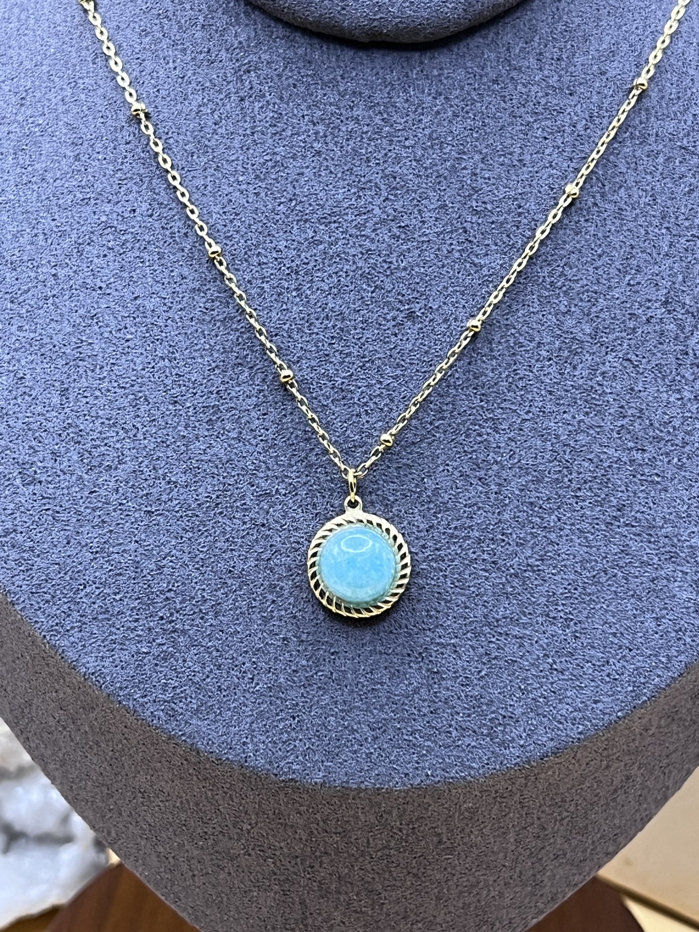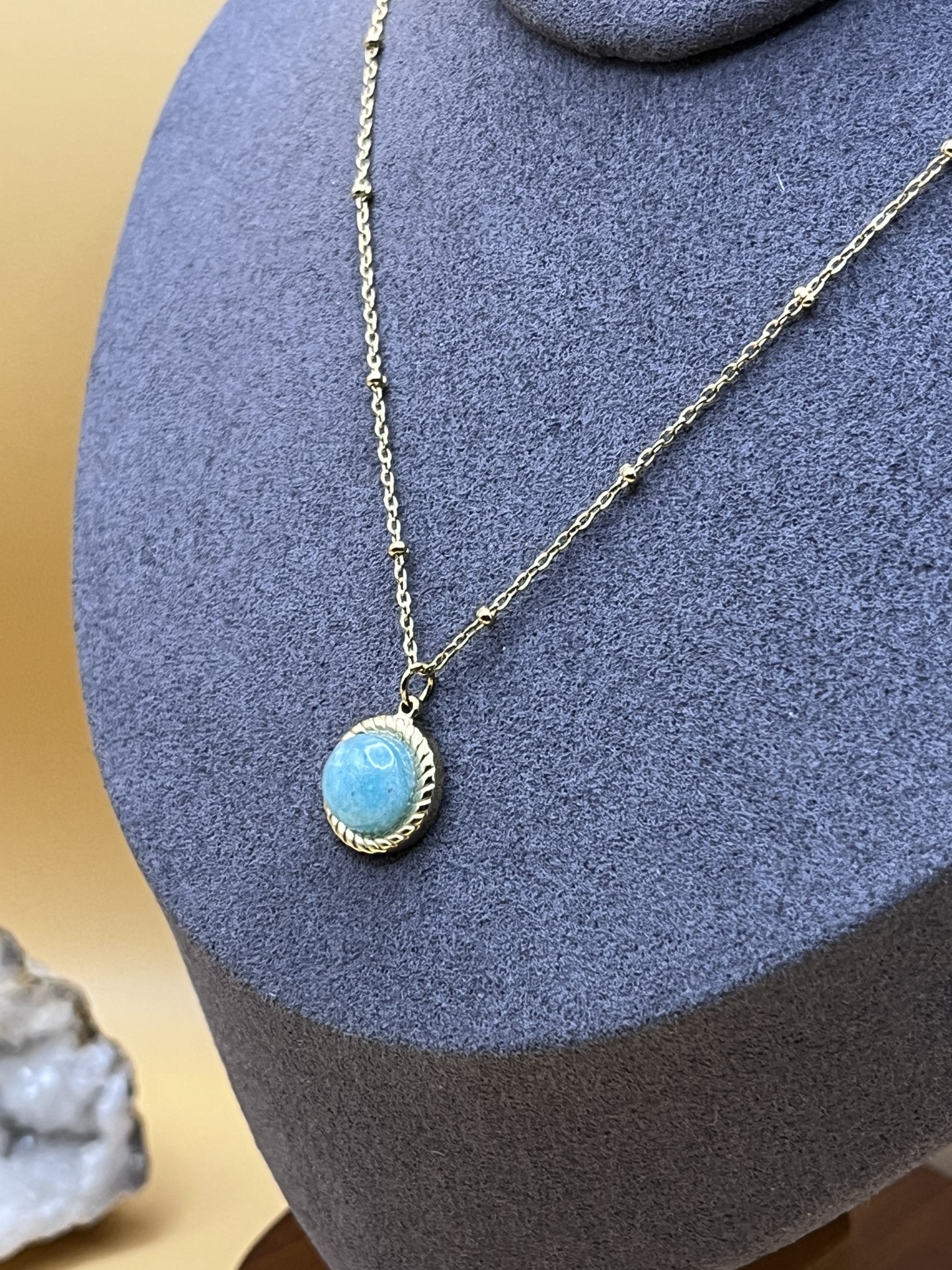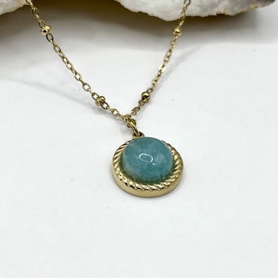 O Colar Dourado em Aço Inoxidável com Pedra Natural Amazonita é uma peça luminosa e elegante que une sofisticação moderna e a energia natural desta pedra especial.