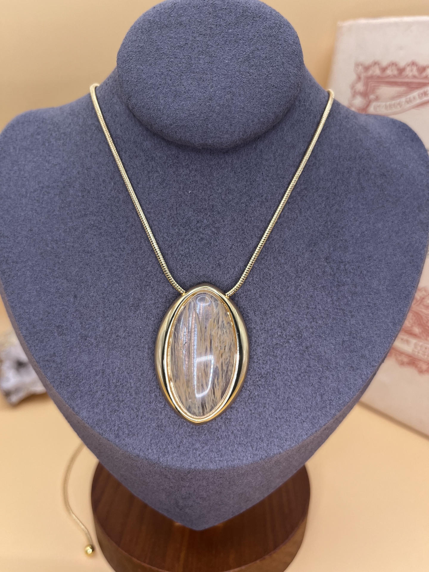 Este sofisticado Colar com Quartzo Rutilado a Ouro é a combinação perfeita entre elegância e significado. Seu deslumbrante pingente oval de quartzo rutilado, com 3,5 x 2,3 cm, destaca-se pelo brilho dourado natural da pedra, conhecida por seus poderosos efeitos energéticos e de cura.