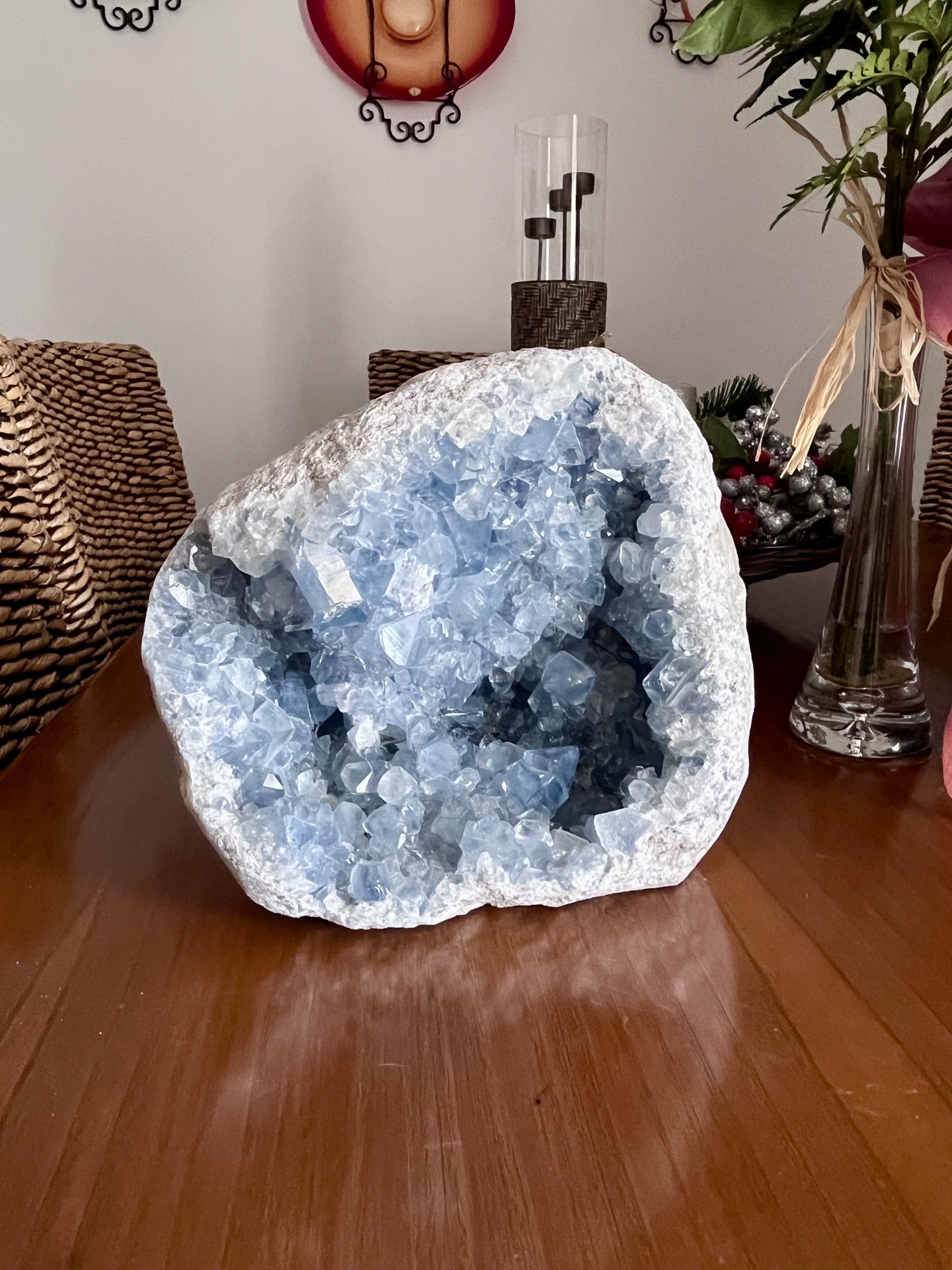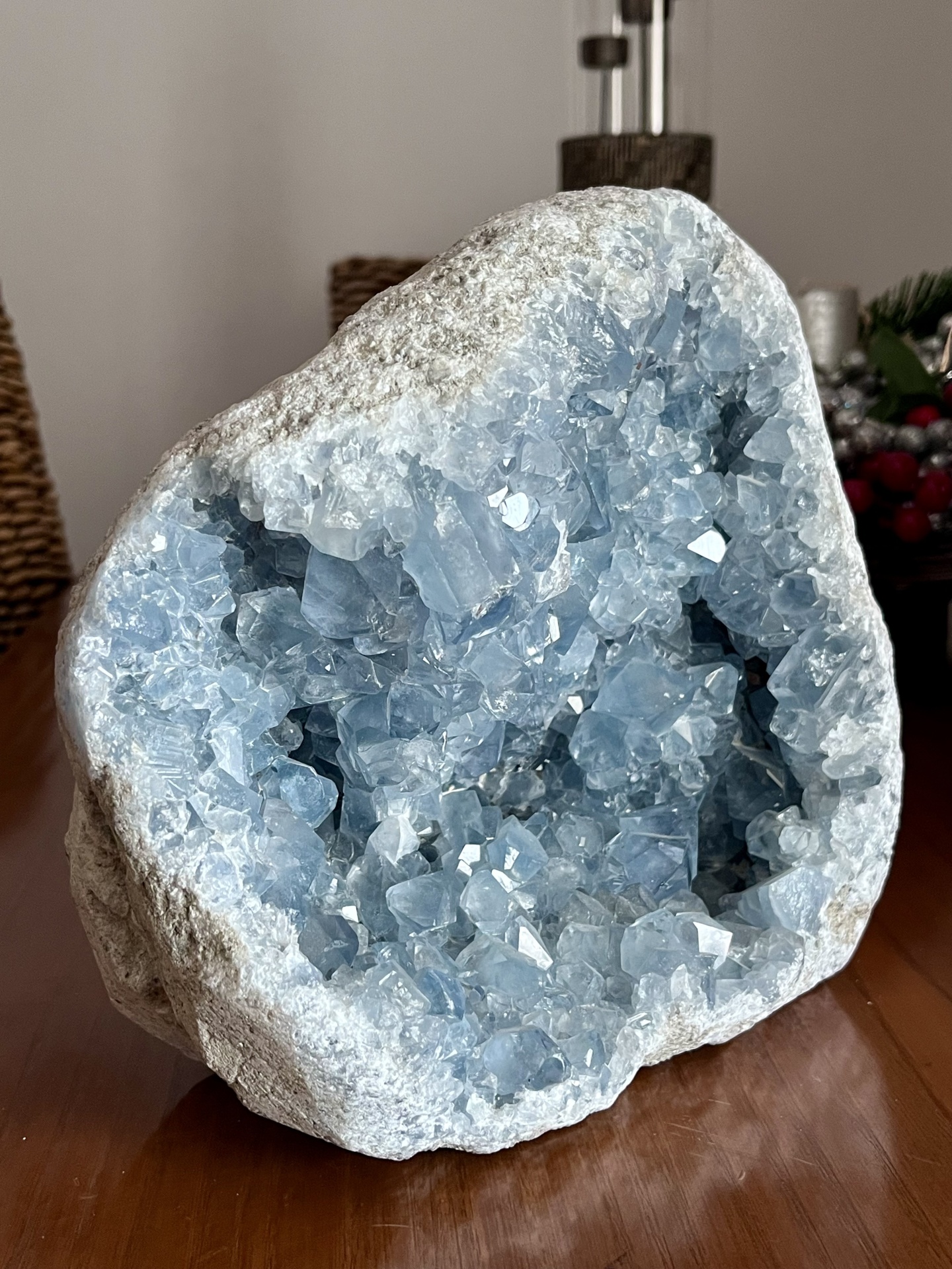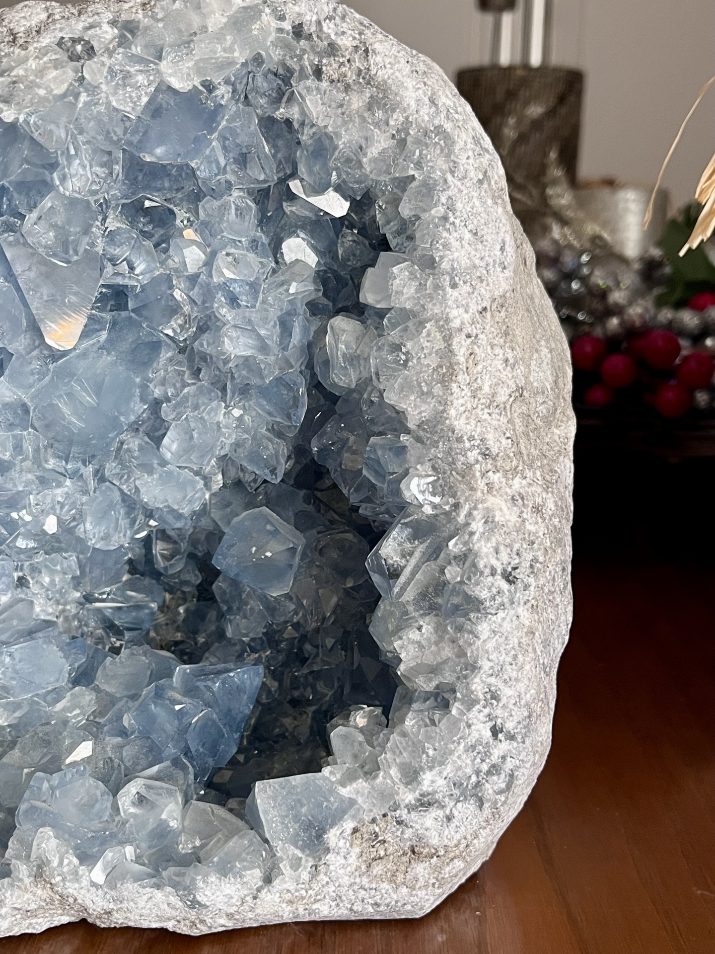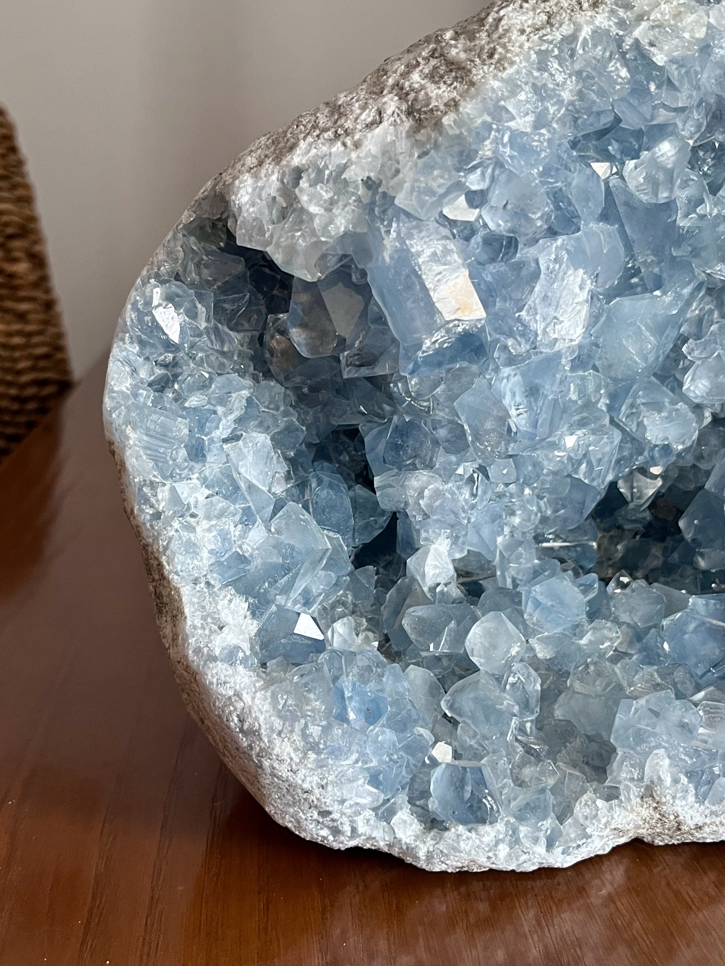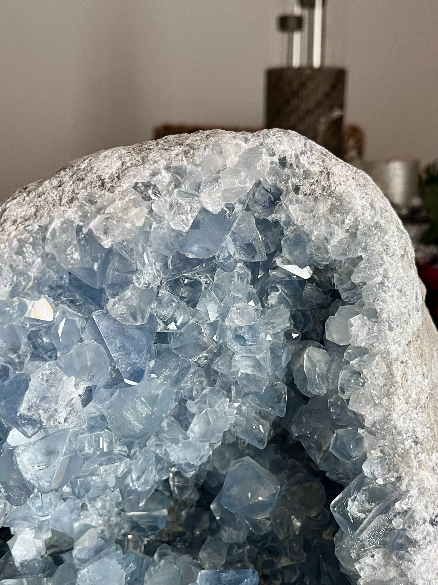 Conhecida como a pedra dos anjos, a Celestina é símbolo de paz, clareza e elevação espiritual. Esta drusa é ideal para decoração sofisticada, espaços de meditação ou colecionadores que procuram uma peça de energia pura e presença imponente.