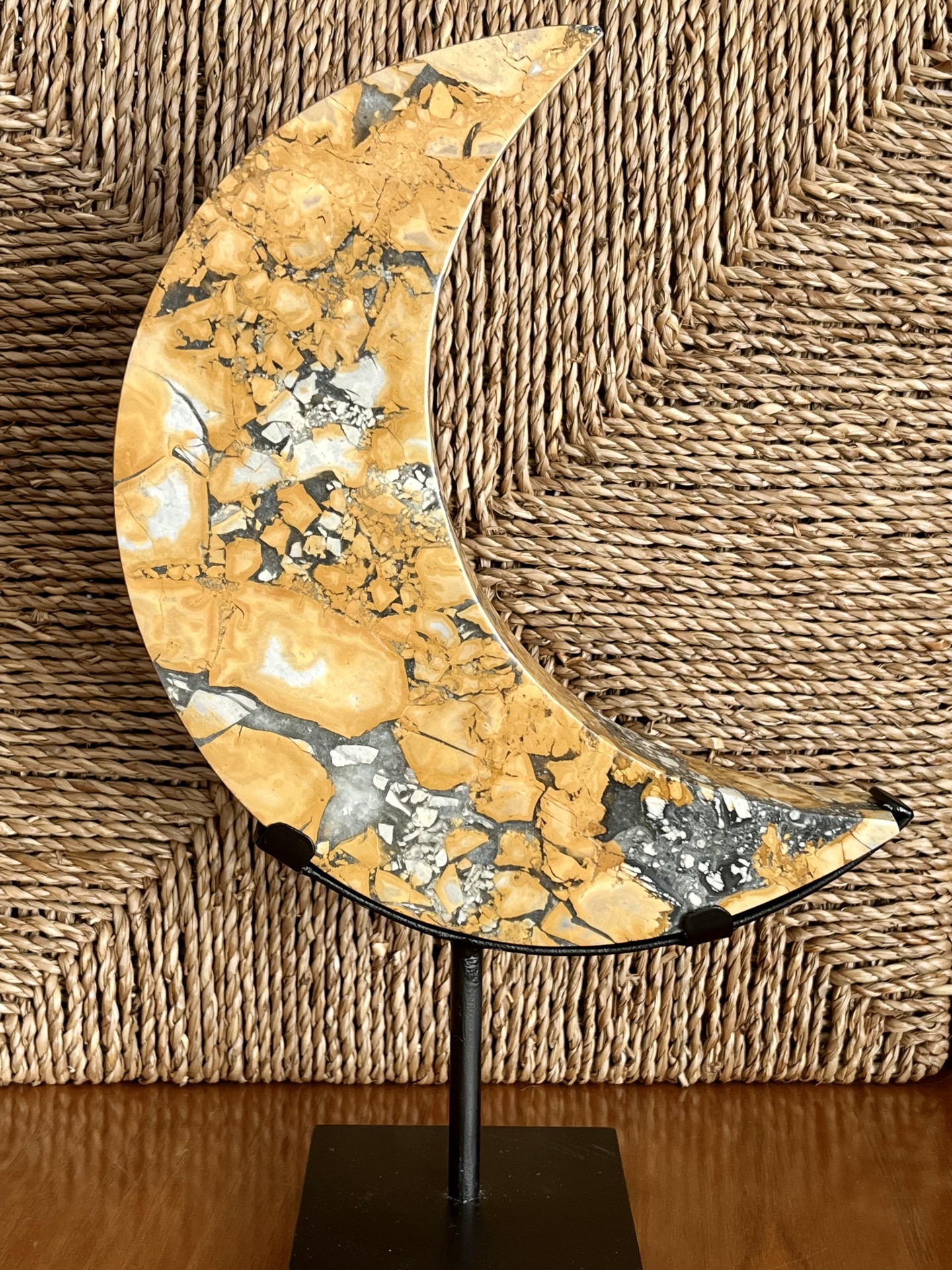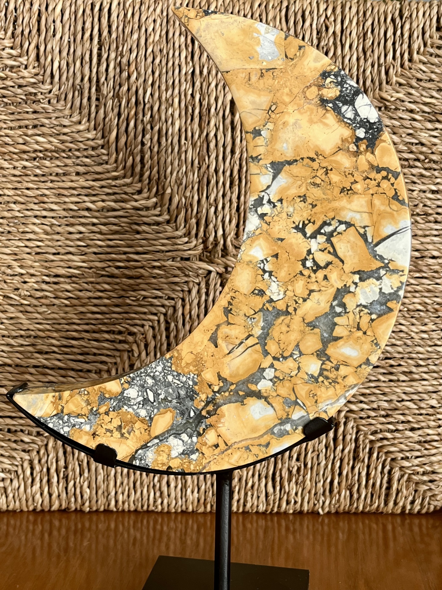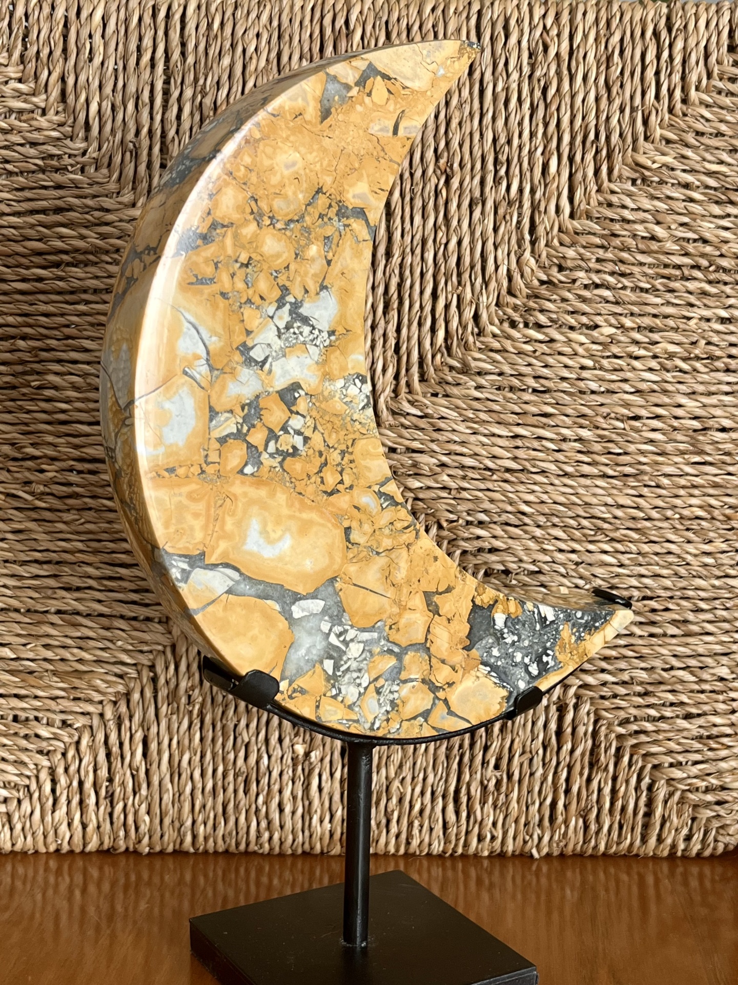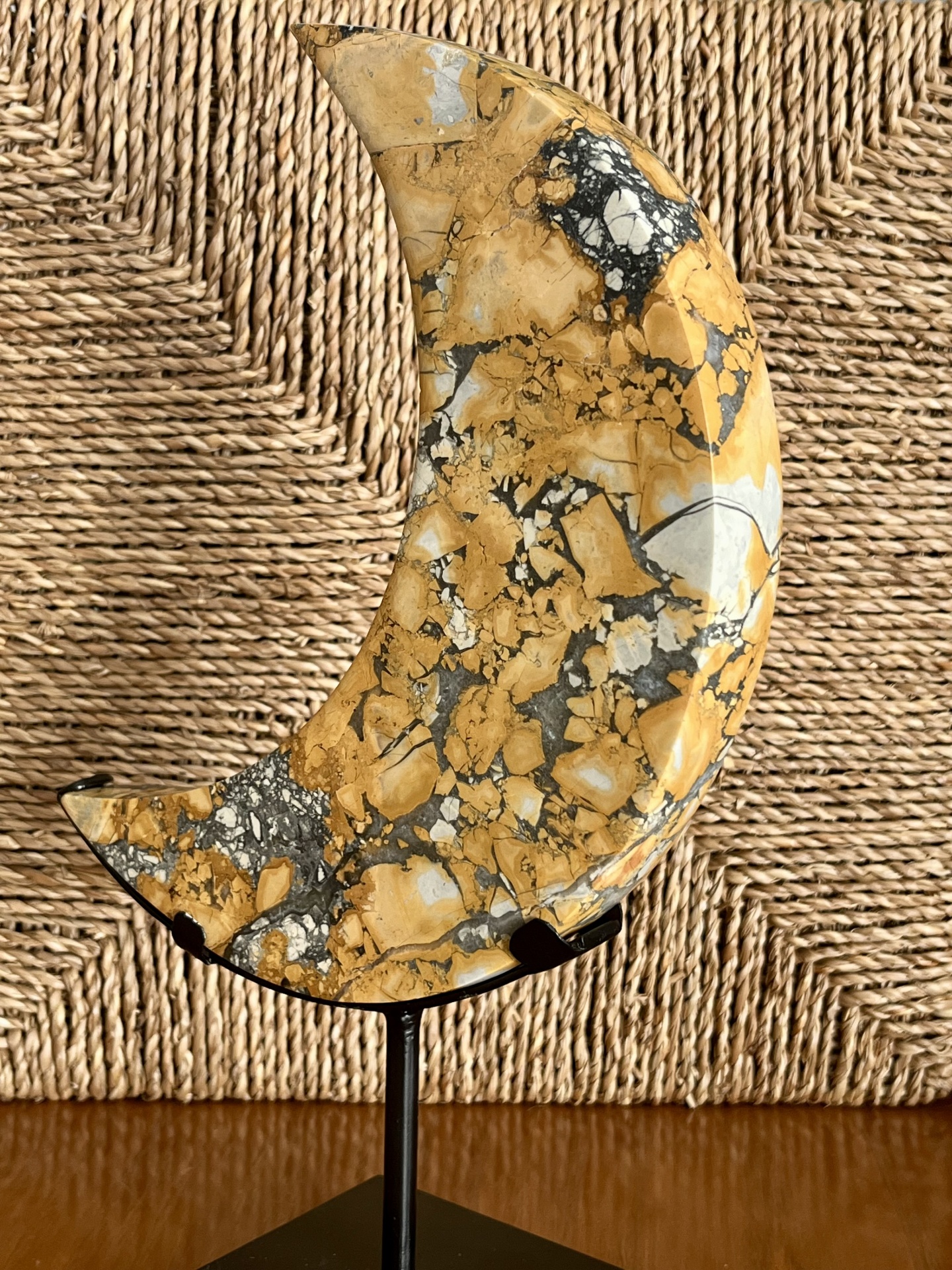Espécime decorativo de jaspe Maligano amarelo, esculpido em forma de lua crescente e apresentado num suporte metálico personalizado. Esta variedade de jaspe distingue-se pelos seus padrões brechados característicos, resultantes de processos geológicos complexos que originam contrastes cromáticos bem definidos.