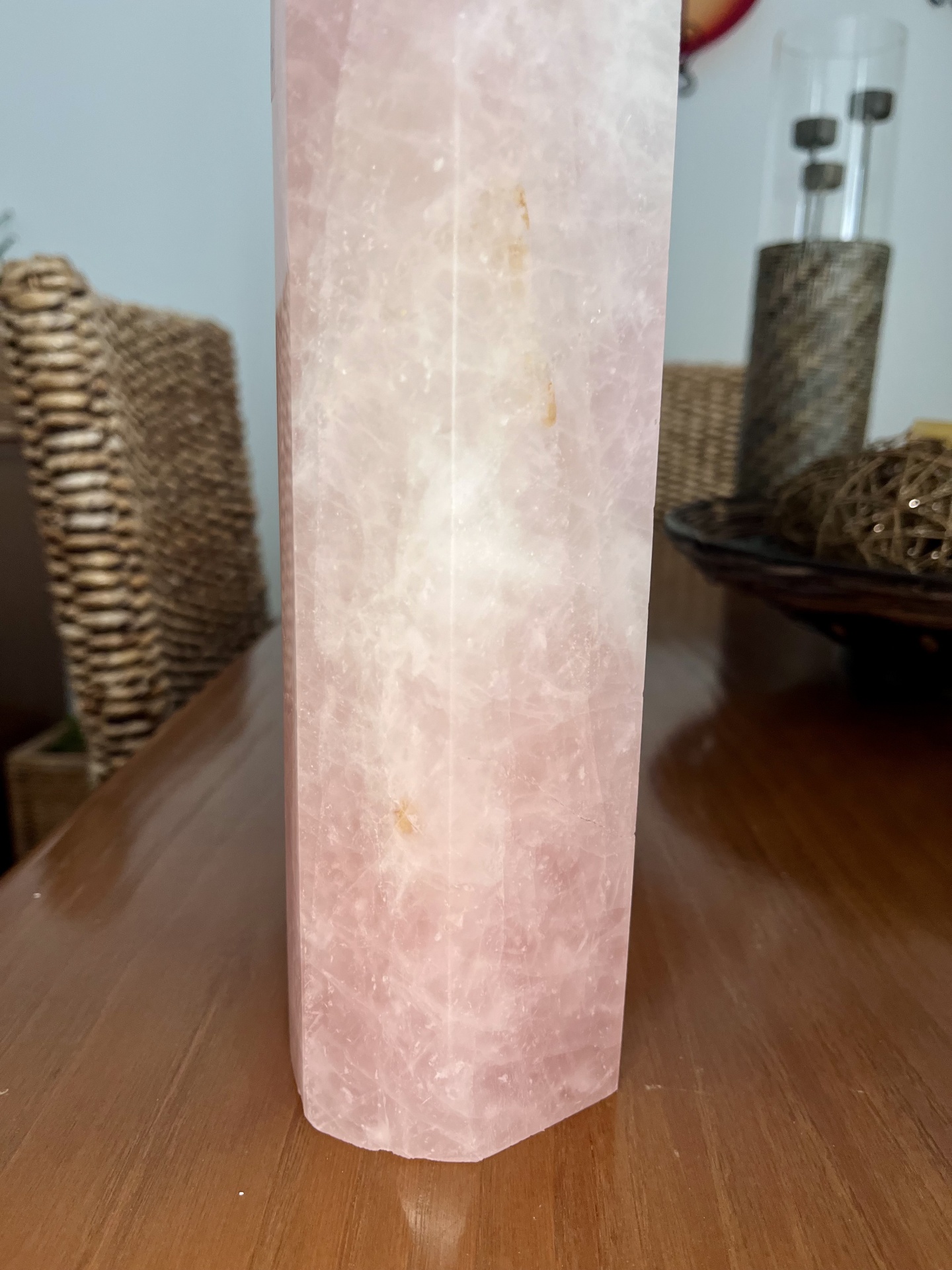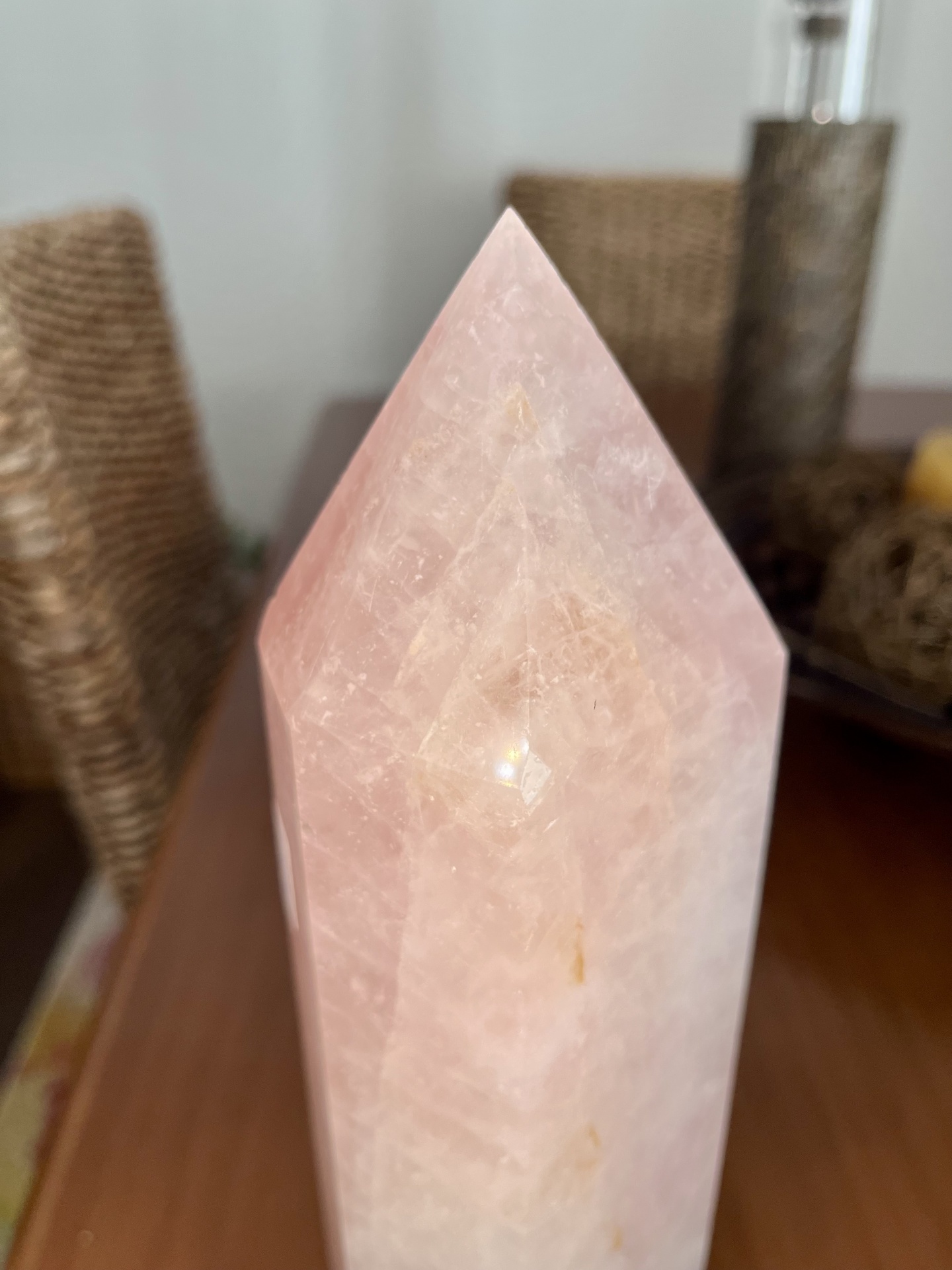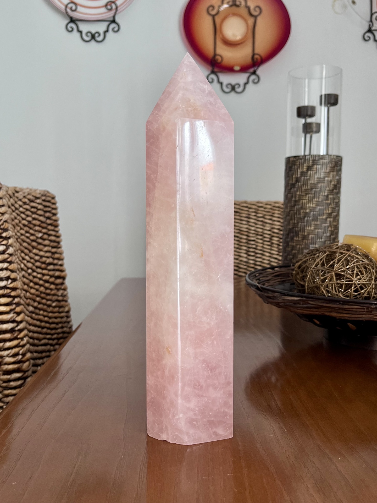 Este obelisco de Quartzo Rosa natural é uma peça de presença imponente e energia delicada. Lapidado à mão no Brasil, apresenta uma tonalidade rosa translúcida e brilho suave, refletindo a pureza e serenidade desta pedra sagrada.