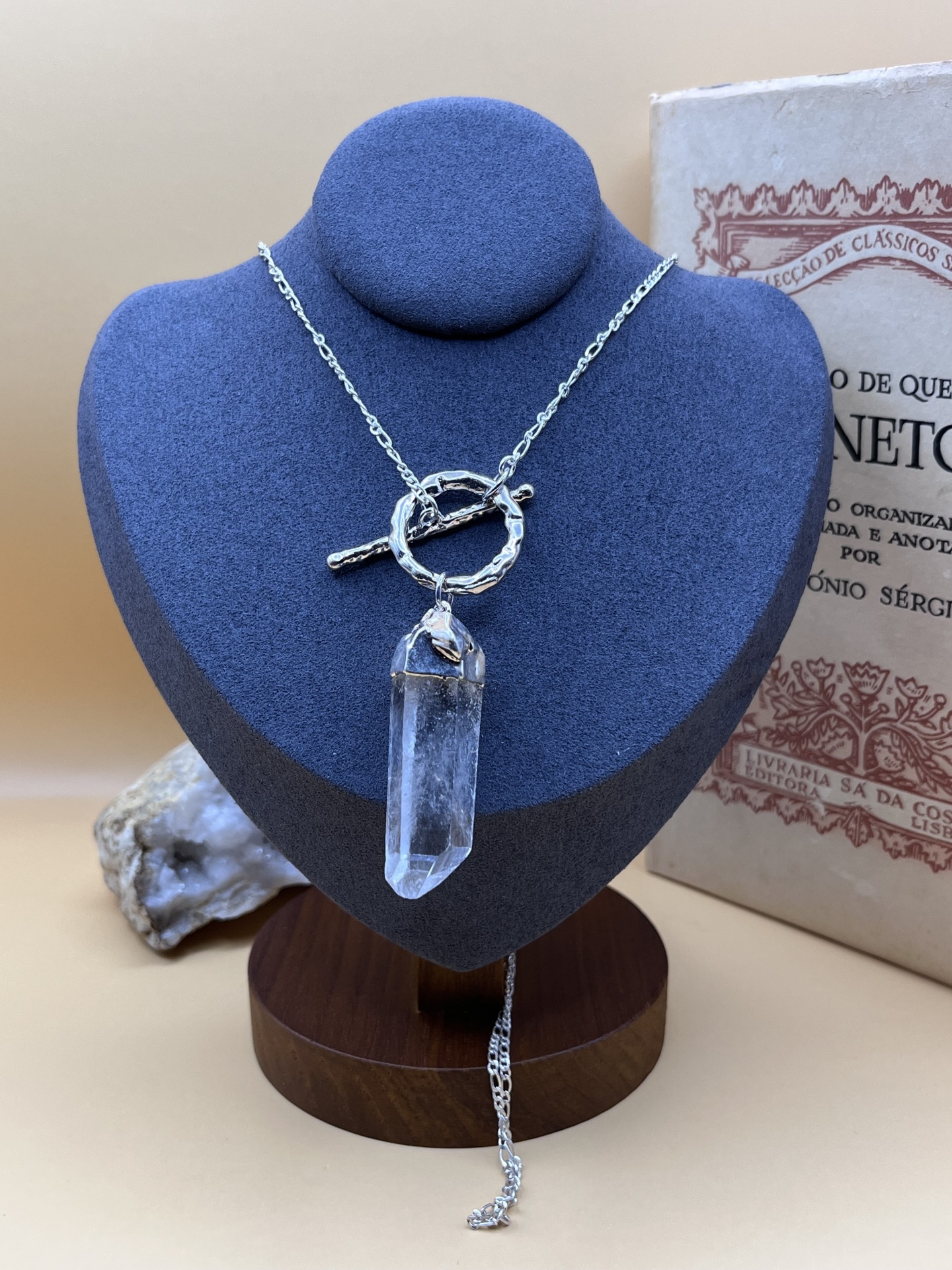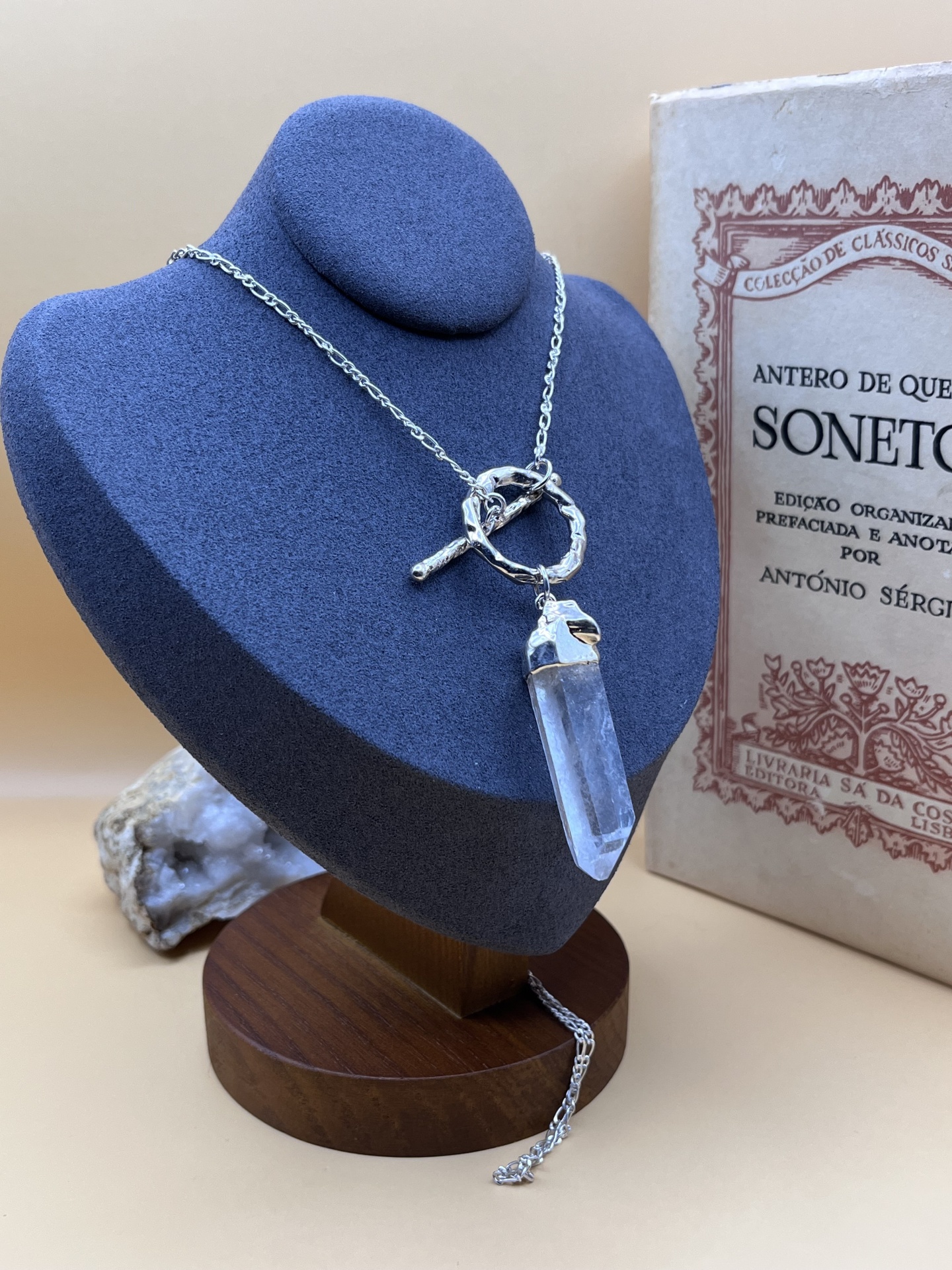 Cada peça tem aproximadamente 7 cm de altura e 1 cm de largura, sendo que a origem do quartzo é do Brasil, famoso pelas suas pedras preciosas de alta qualidade. Sendo uma pedra natural, cada pingente possui variações sutis, tornando a sua joia verdadeiramente única.