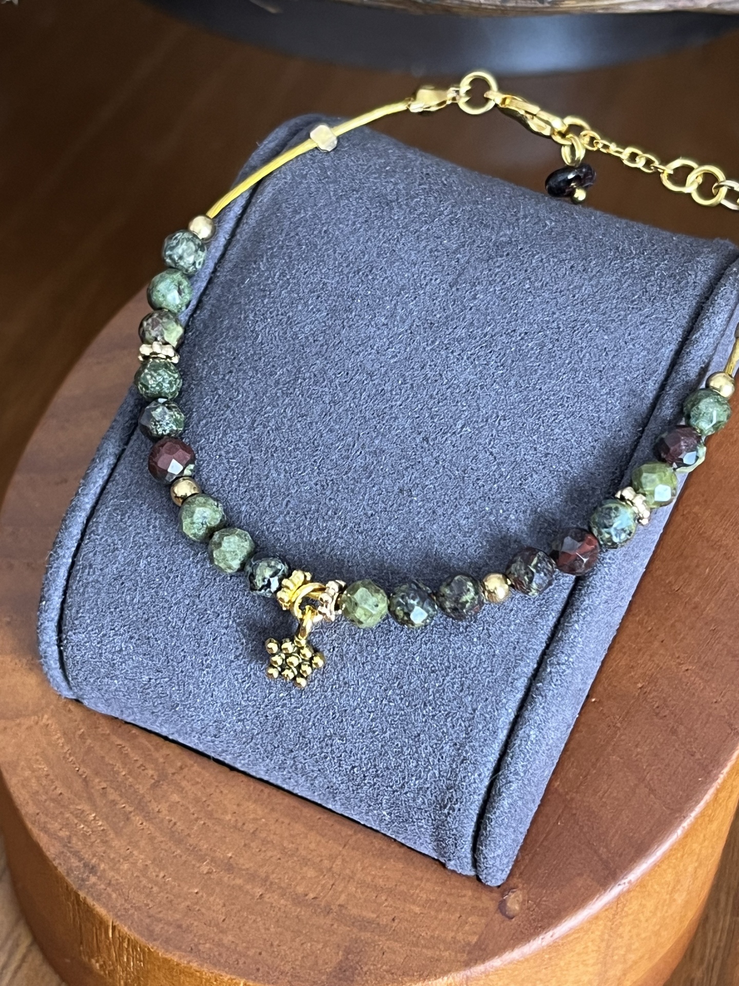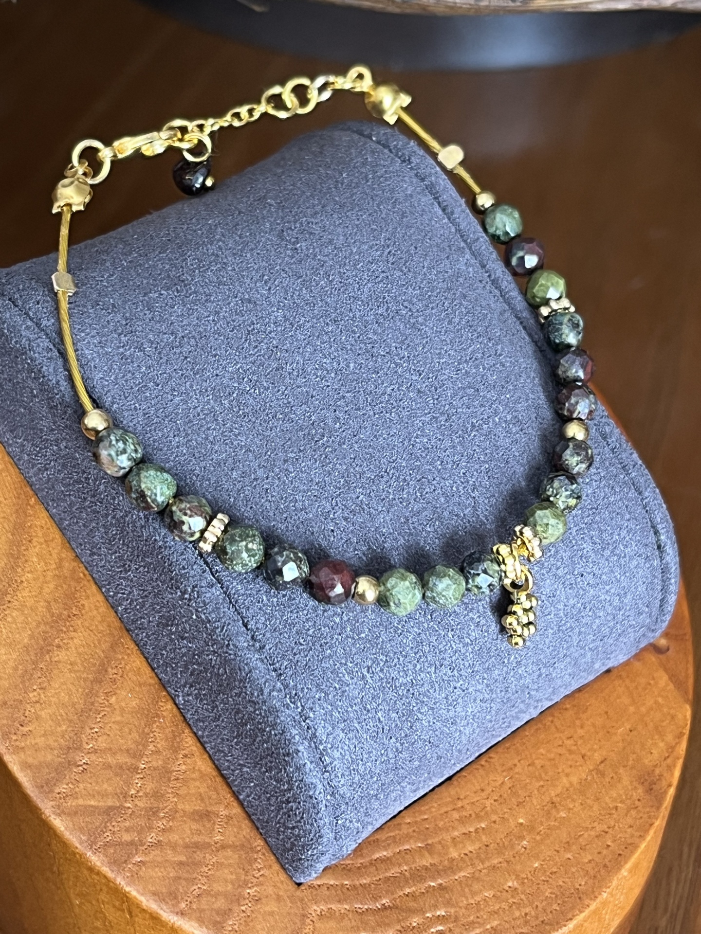 Esta elegante pulseira combina o brilho do aço inoxidável dourado com a beleza única da pedra natural Sangue de Dragão. Conhecida pelos seus tons profundos de verde com nuances avermelhadas, esta pedra cria um contraste natural marcante e sofisticado.