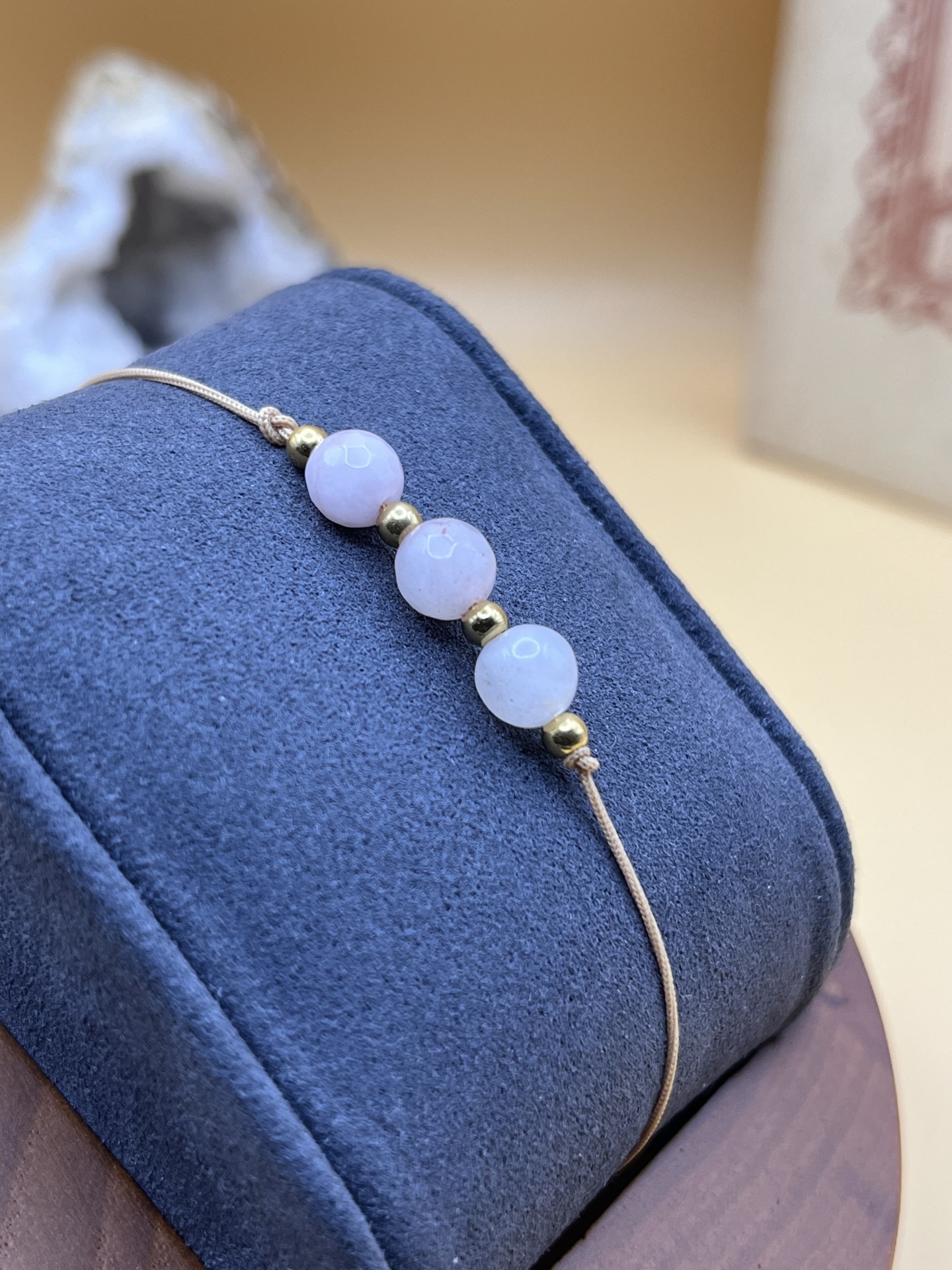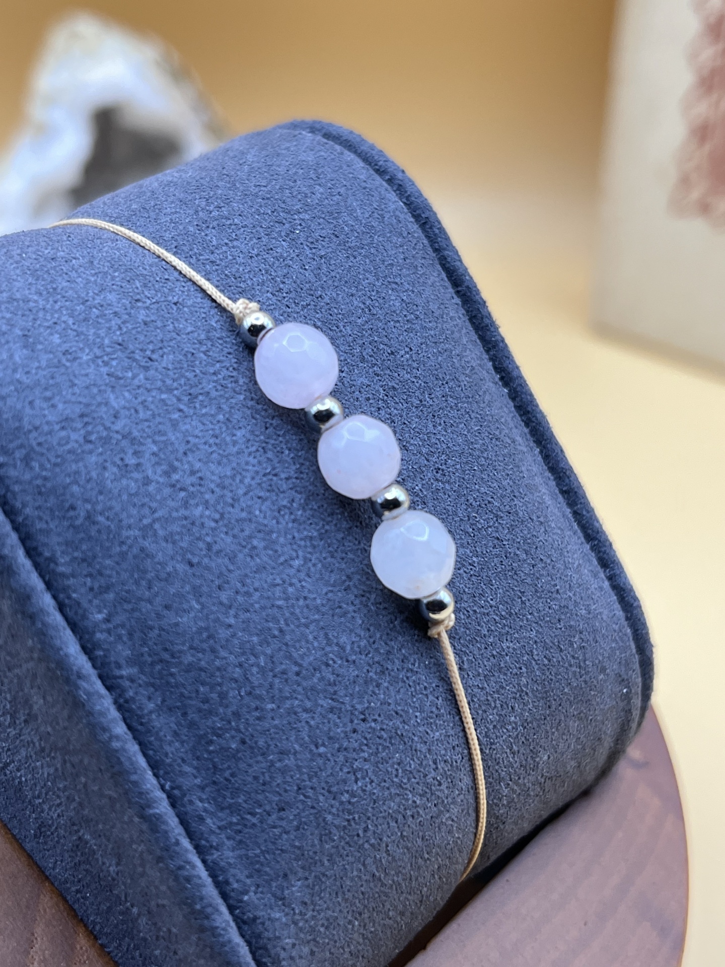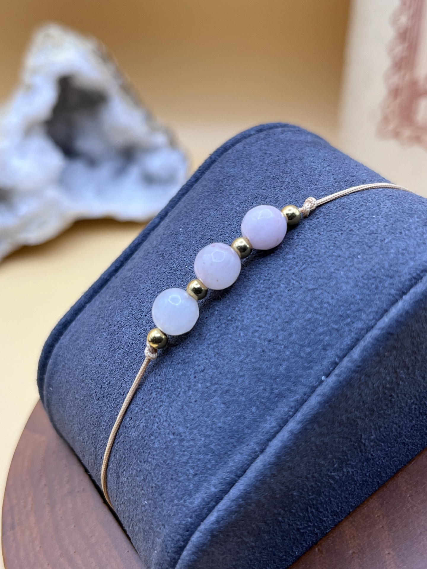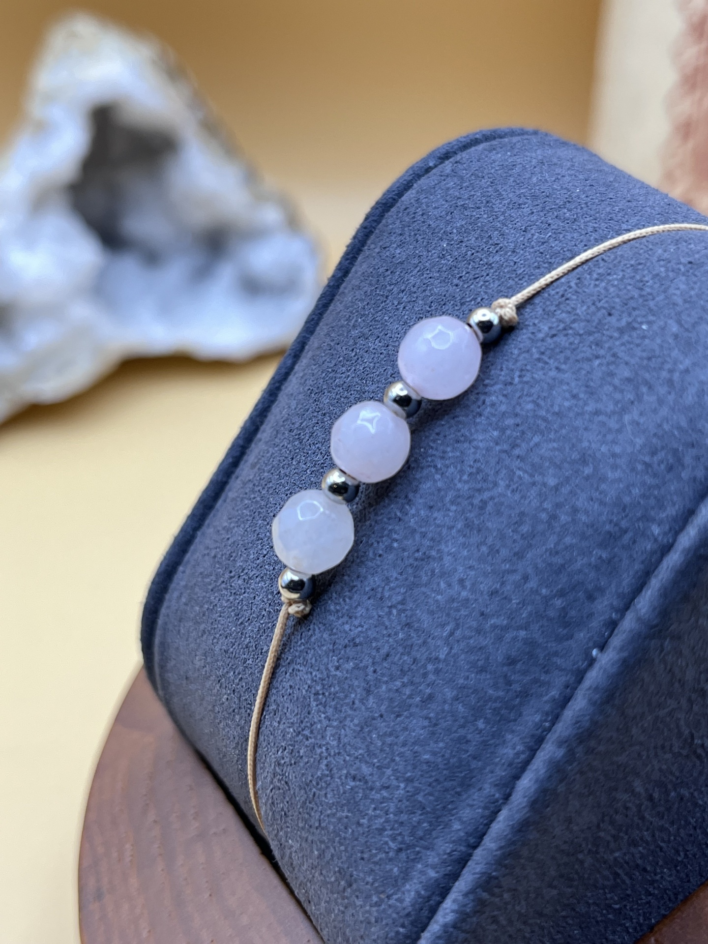 Pulseira artesanal com cordão de cetim bege e três pedras naturais de Quartzo Rosa de 6 mm. Produzida à mão em Portugal, é confortável e discreta para uso diário. O Quartzo Rosa está associado a suavidade e empatia. As contas metálicas podem ser douradas ou prateadas; escolha a opção desejada antes de adicionar ao carrinho. Por serem naturais, as pedras podem variar na tonalidade. Recomenda-se retirar durante o banho para maior durabilidade.