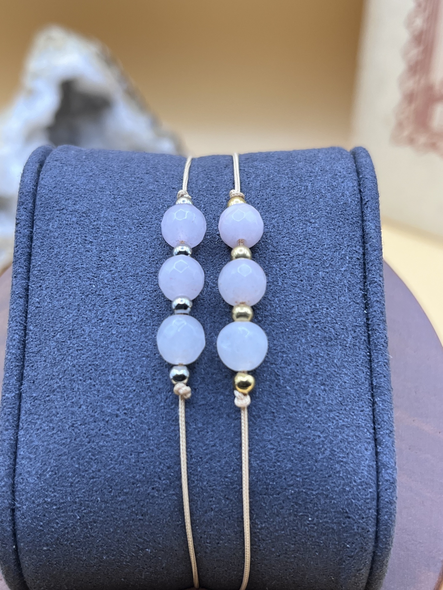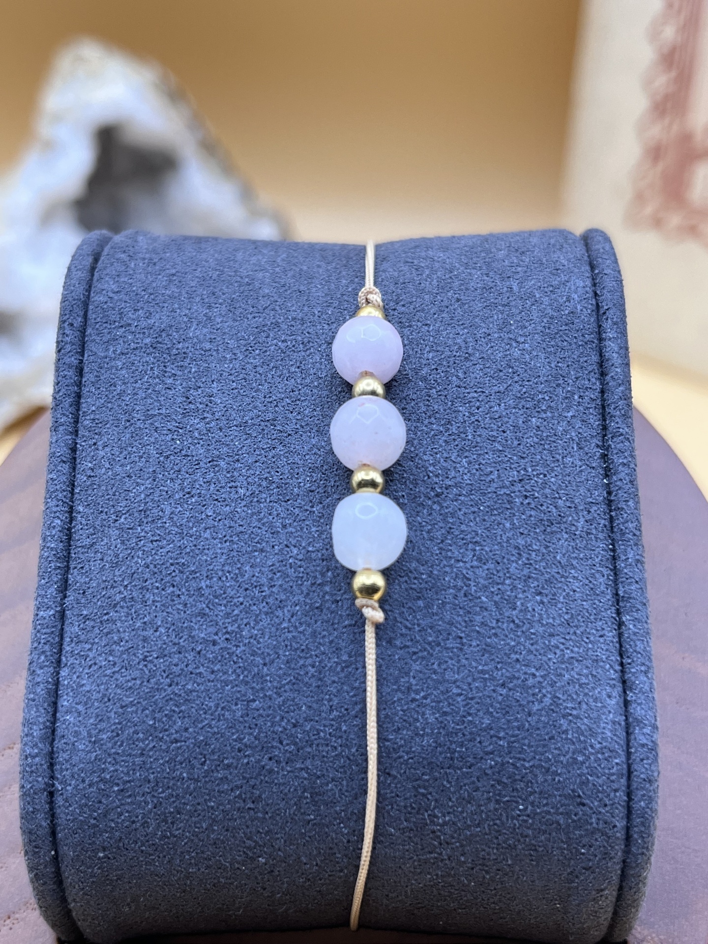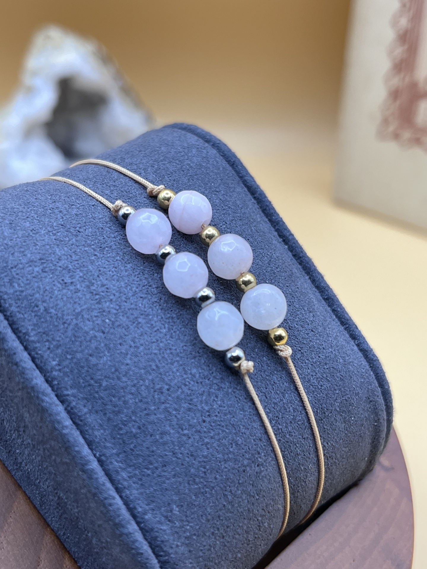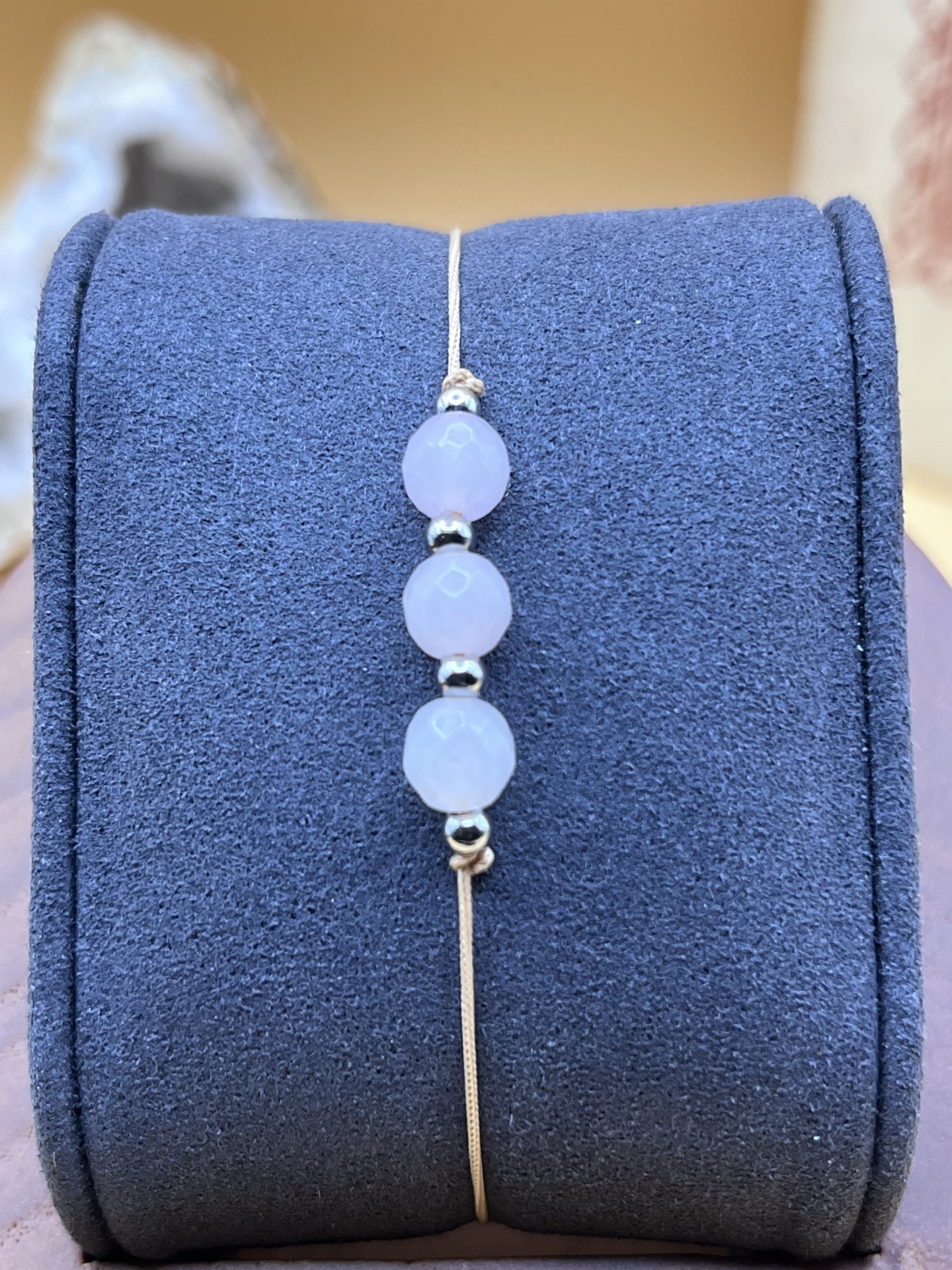 Pulseira artesanal com cordão de cetim bege e três pedras naturais de Quartzo Rosa de 6 mm. Produzida à mão em Portugal, é confortável e discreta para uso diário. O Quartzo Rosa está associado a suavidade e empatia. As contas metálicas podem ser douradas ou prateadas; escolha a opção desejada antes de adicionar ao carrinho. Por serem naturais, as pedras podem variar na tonalidade. Recomenda-se retirar durante o banho para maior durabilidade.