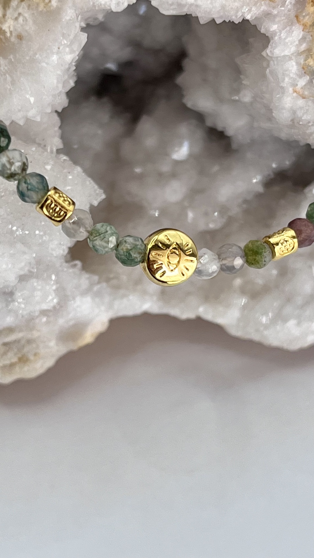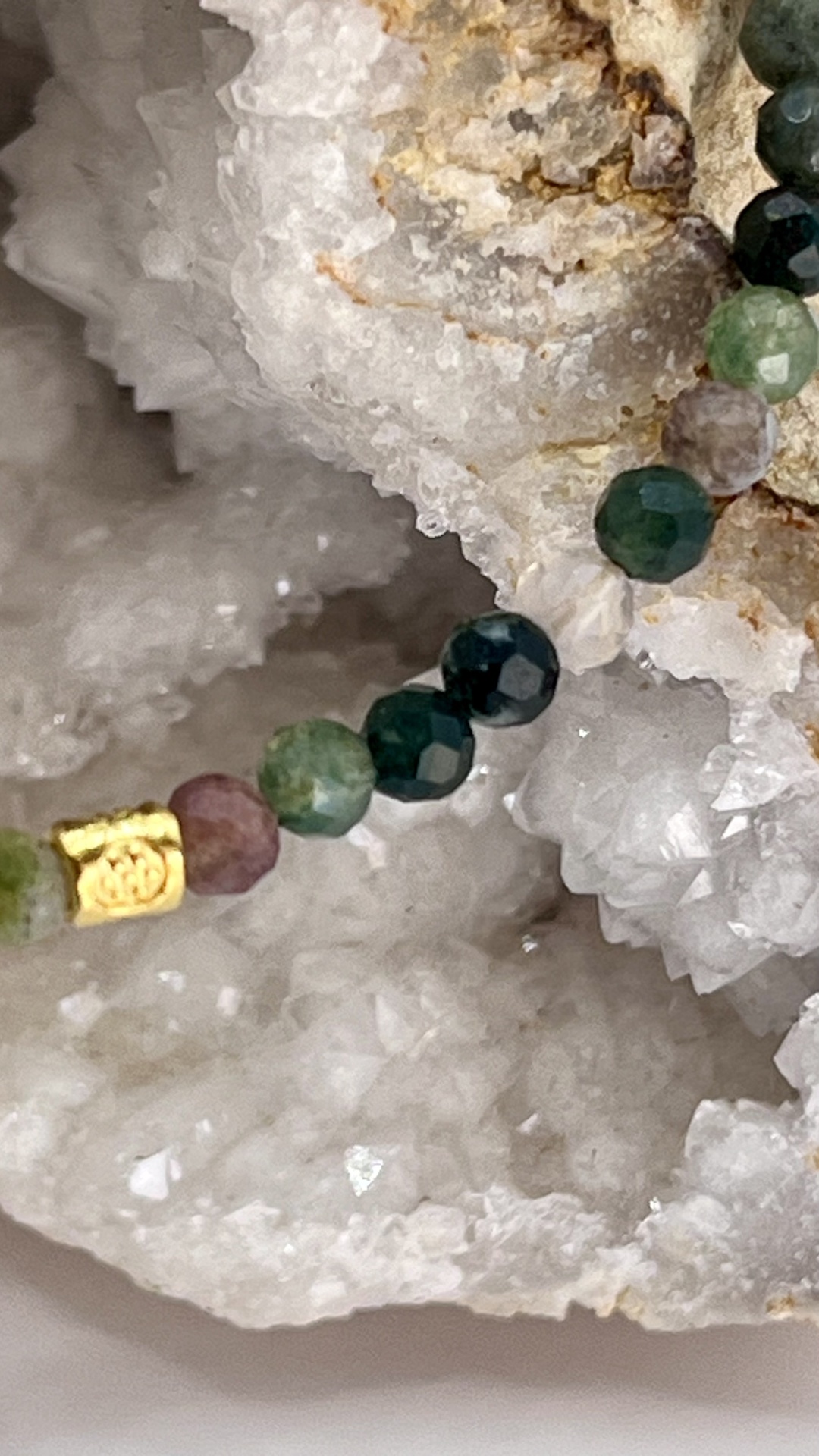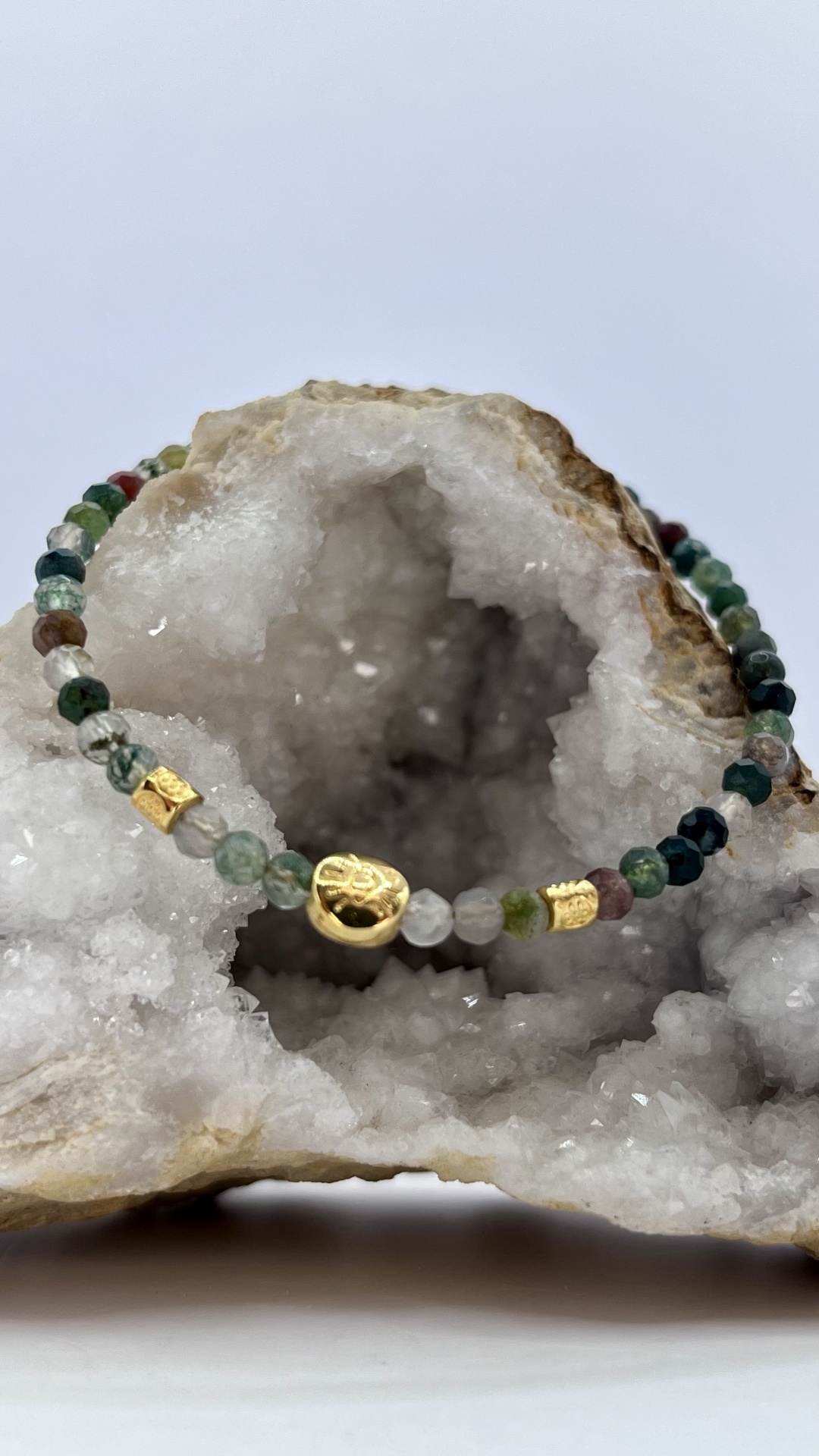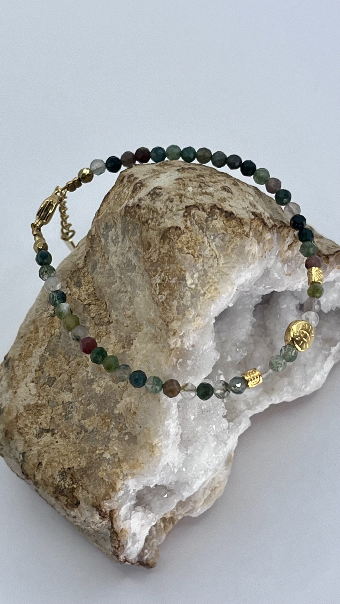 • Materiais: Contas de ágata indiana e encantos dourados.