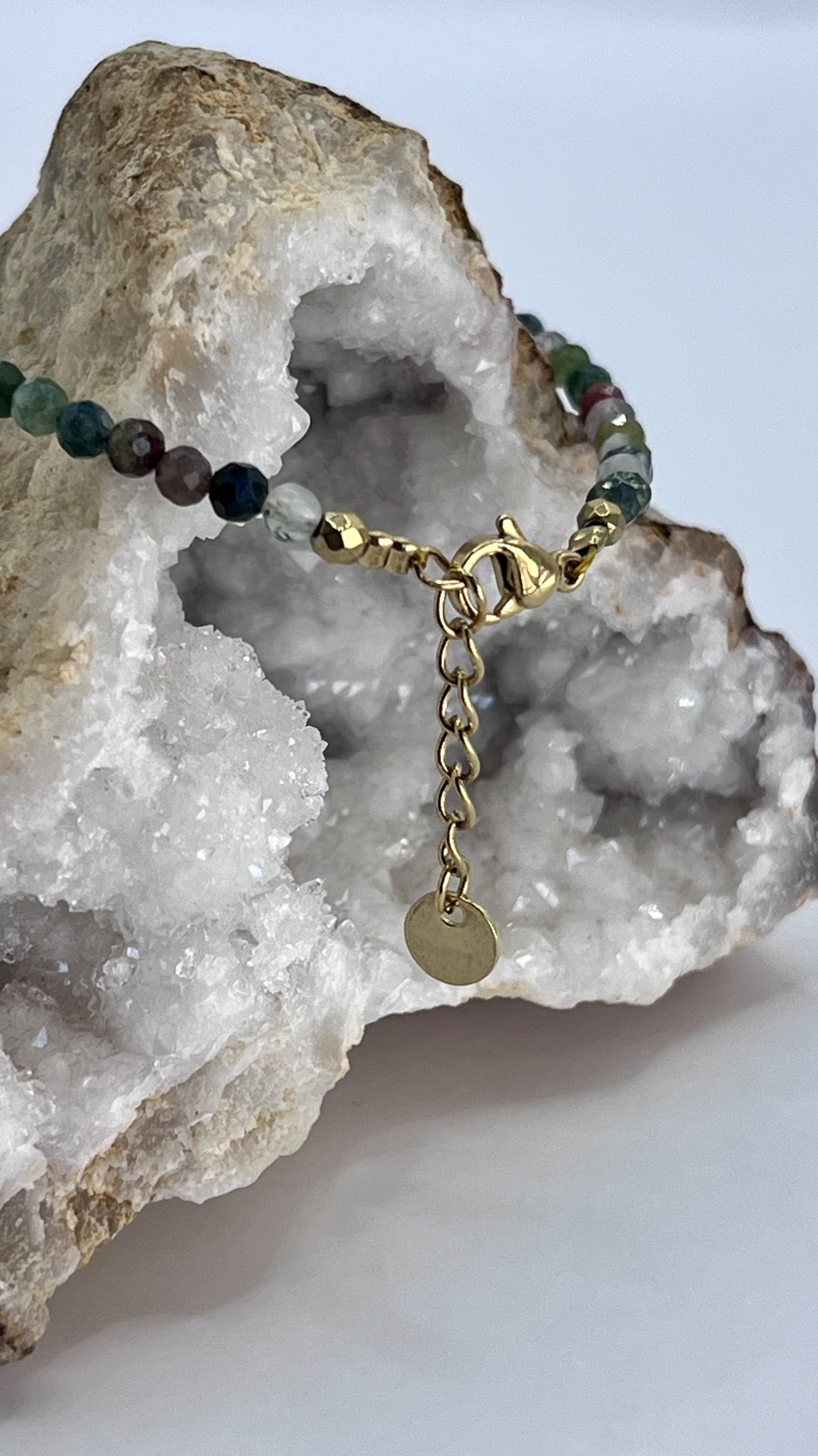 • Ágata Indiana: Cada conta possui padrões naturais distintos, realçando a beleza autêntica da peça.