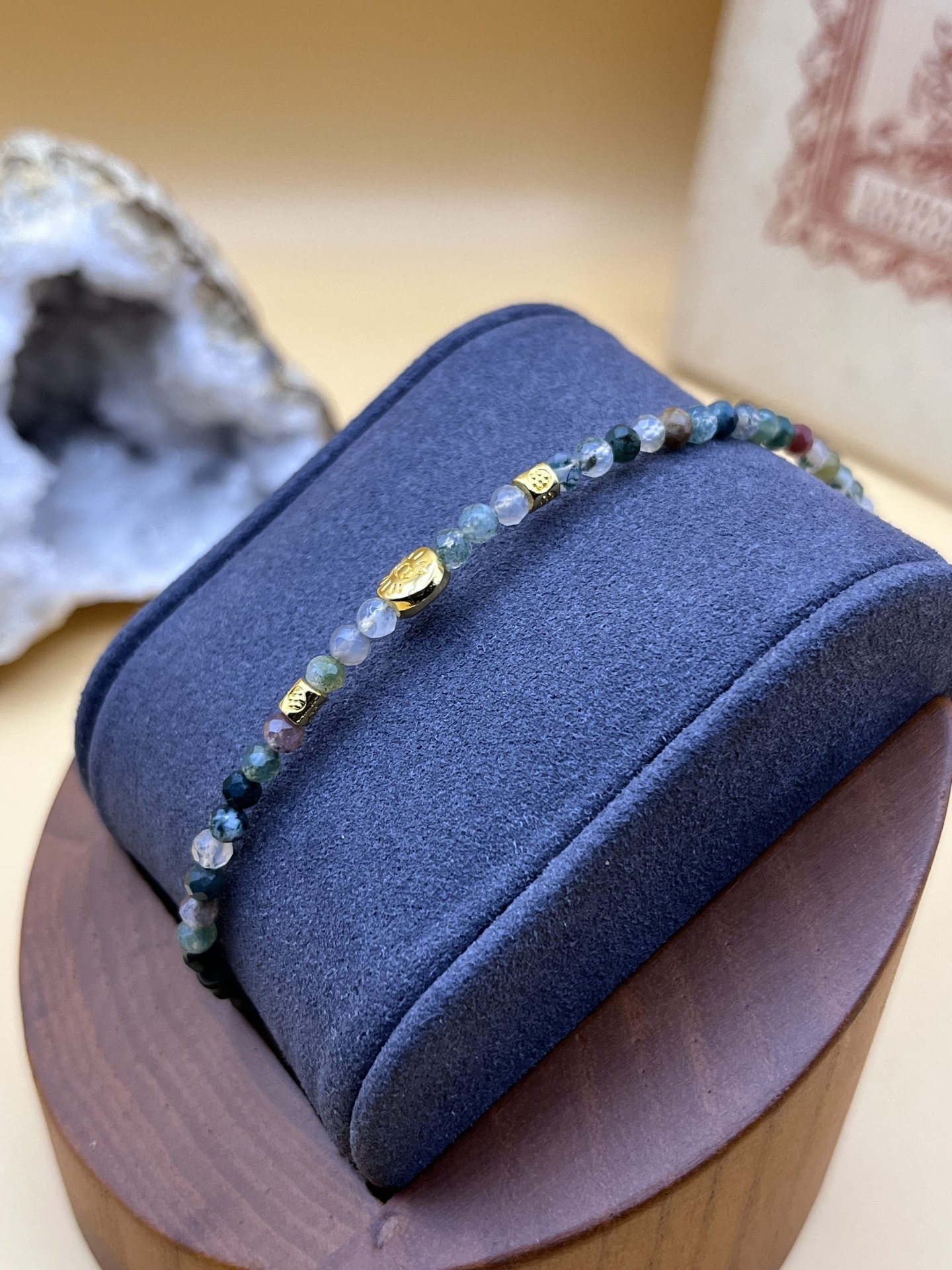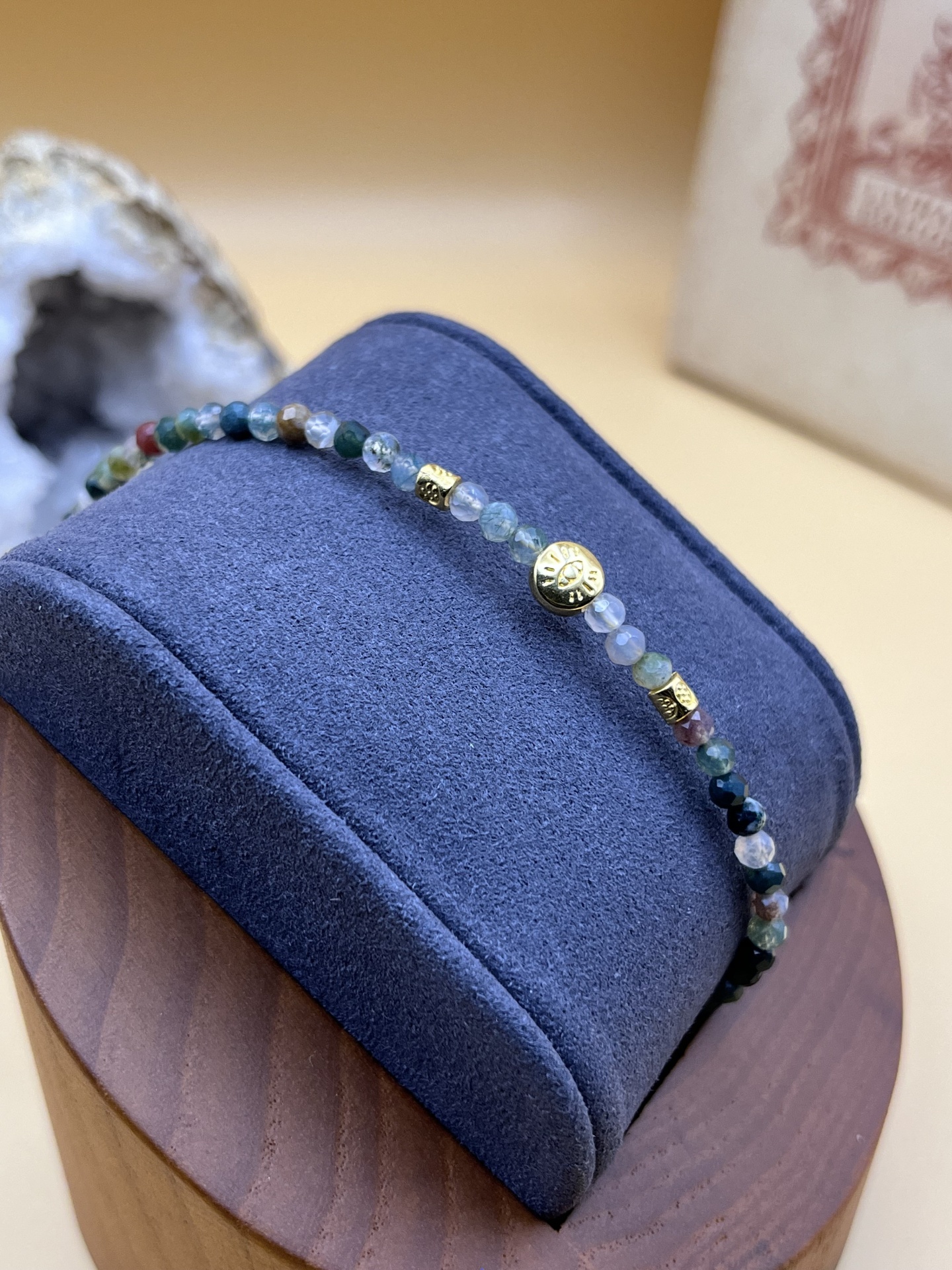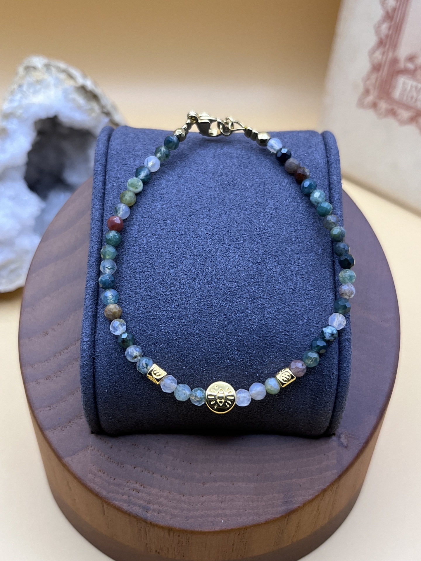 • Materiais: Contas de ágata indiana e encantos dourados.
