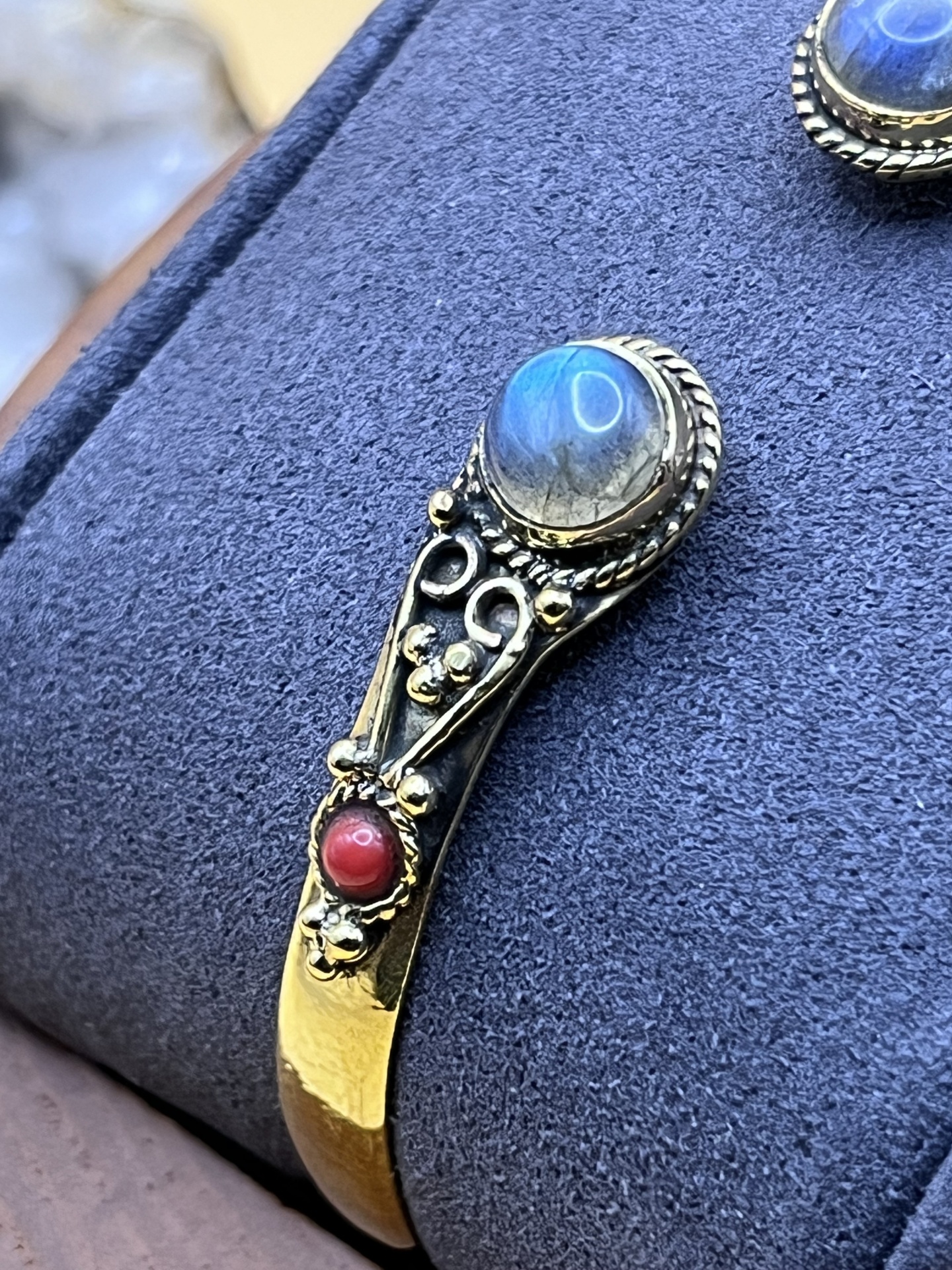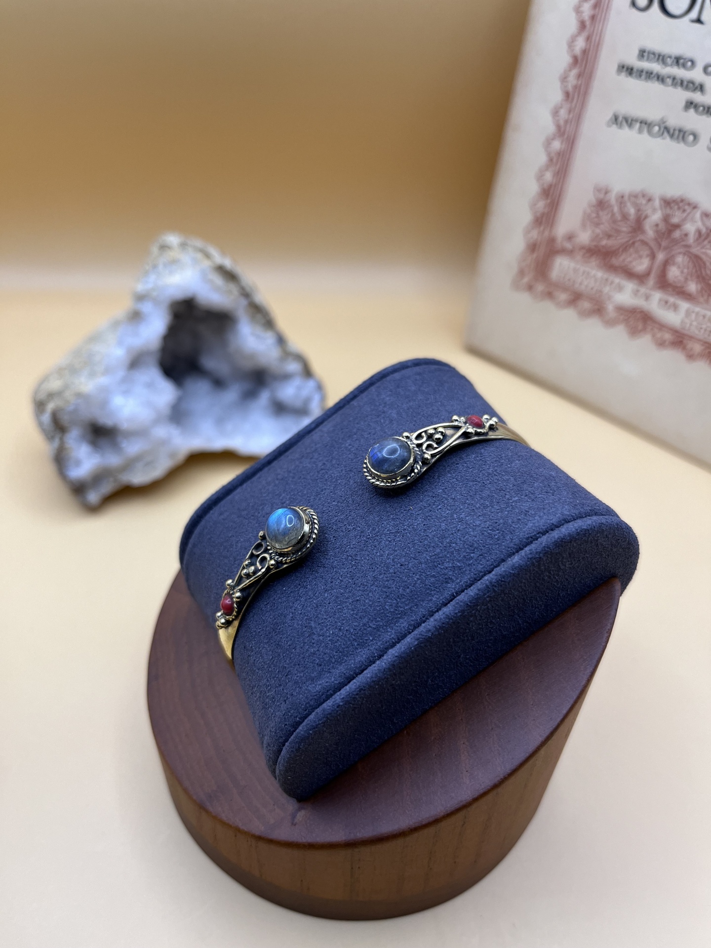 Encante-se com esta pulseira de bronze com labradorite, uma peça vibrante e diferenciada que destaca o brilho único desta pedra preciosa. Proveniente da Índia e inspirada na beleza natural e mística da labradorite, esta pulseira é perfeita para adicionar um toque de charme e exclusividade ao seu visual. Com um design ajustável e prático, adapta-se facilmente ao pulso.