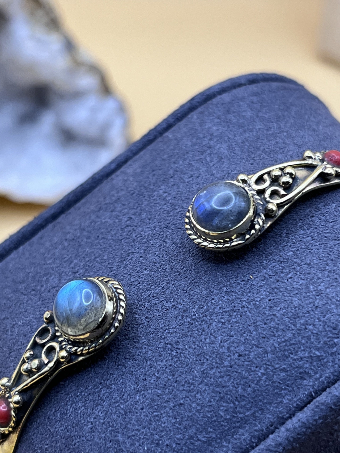 Cada cabochão de labradorite, com 0,6 cm de diâmetro, possui um brilho fascinante que complementa a estrutura em bronze. Ideal para ocasiões especiais ou uso diário, esta peça é artesanalmente trabalhada para garantir qualidade e durabilidade.