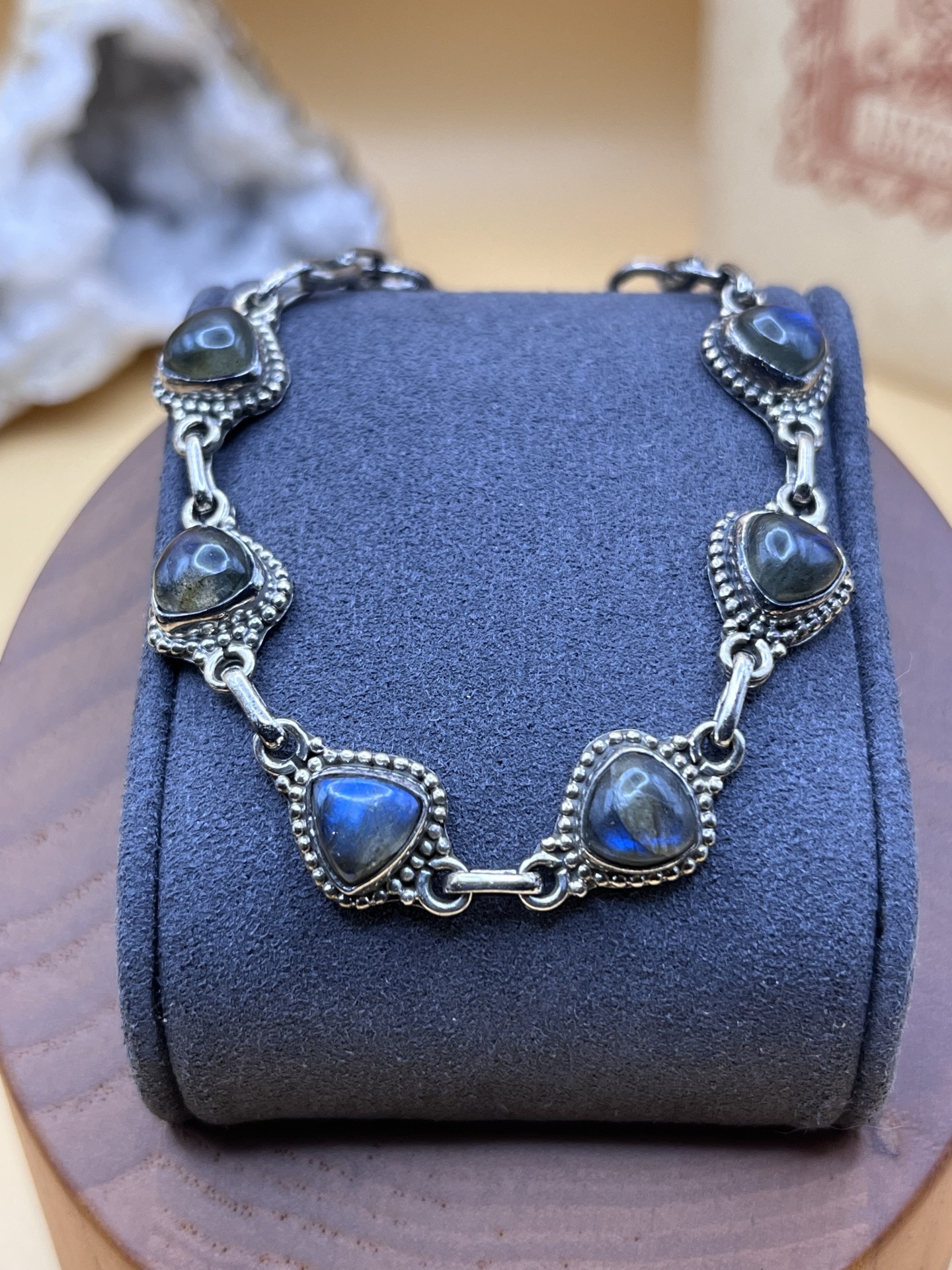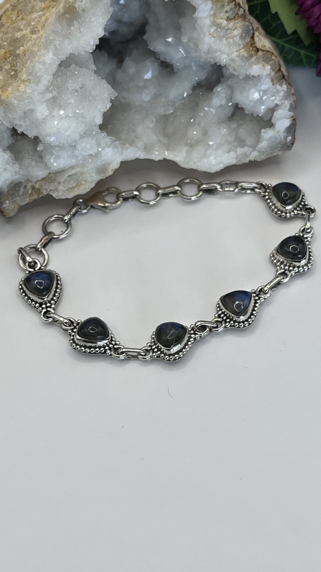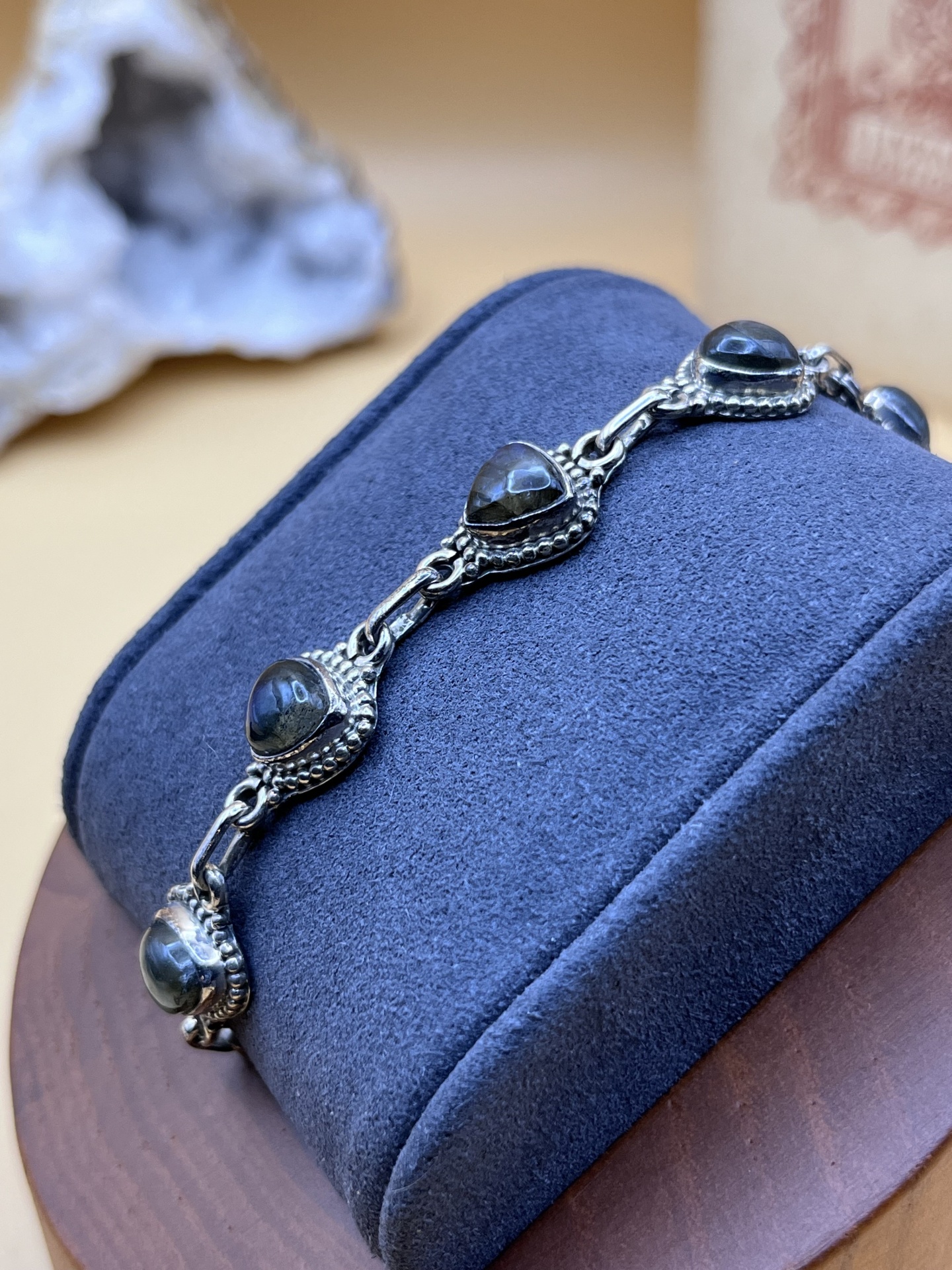 Apresentamos a Pulseira Aurora Mística, uma peça deslumbrante da coleção exclusiva de prata esterlina 925, adornada com labradorite natural. Conhecida pela sua iridescência mágica, a labradorite reflete luzes em tons vibrantes, que variam entre azul, verde e dourado, adicionando um toque celestial ao seu look.