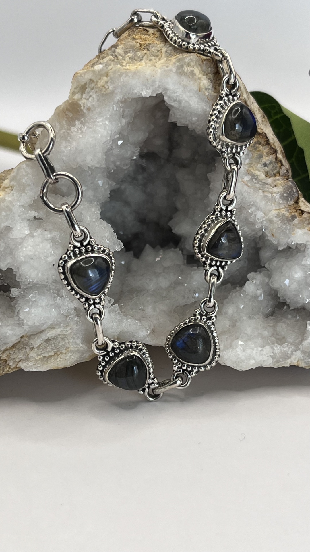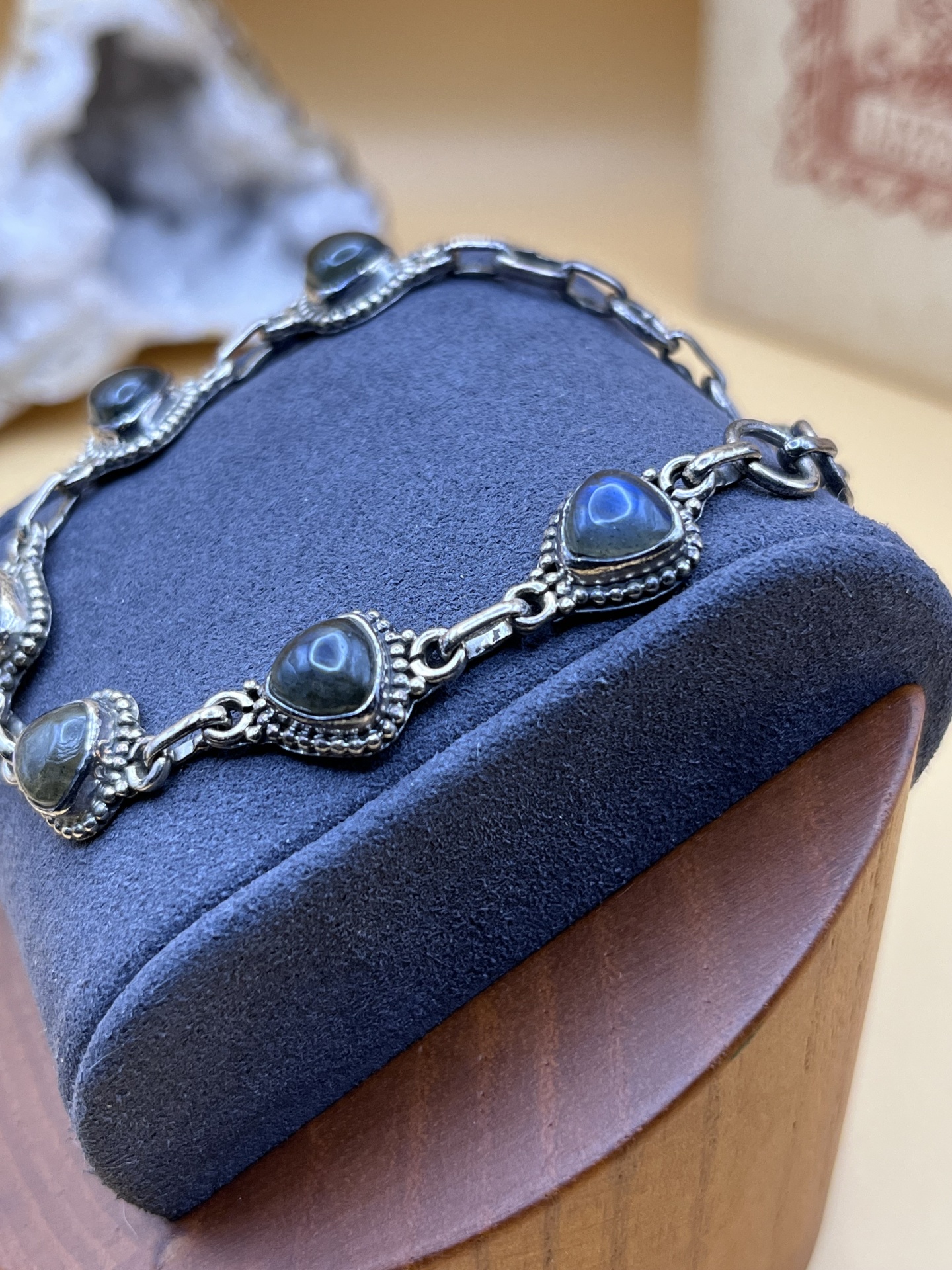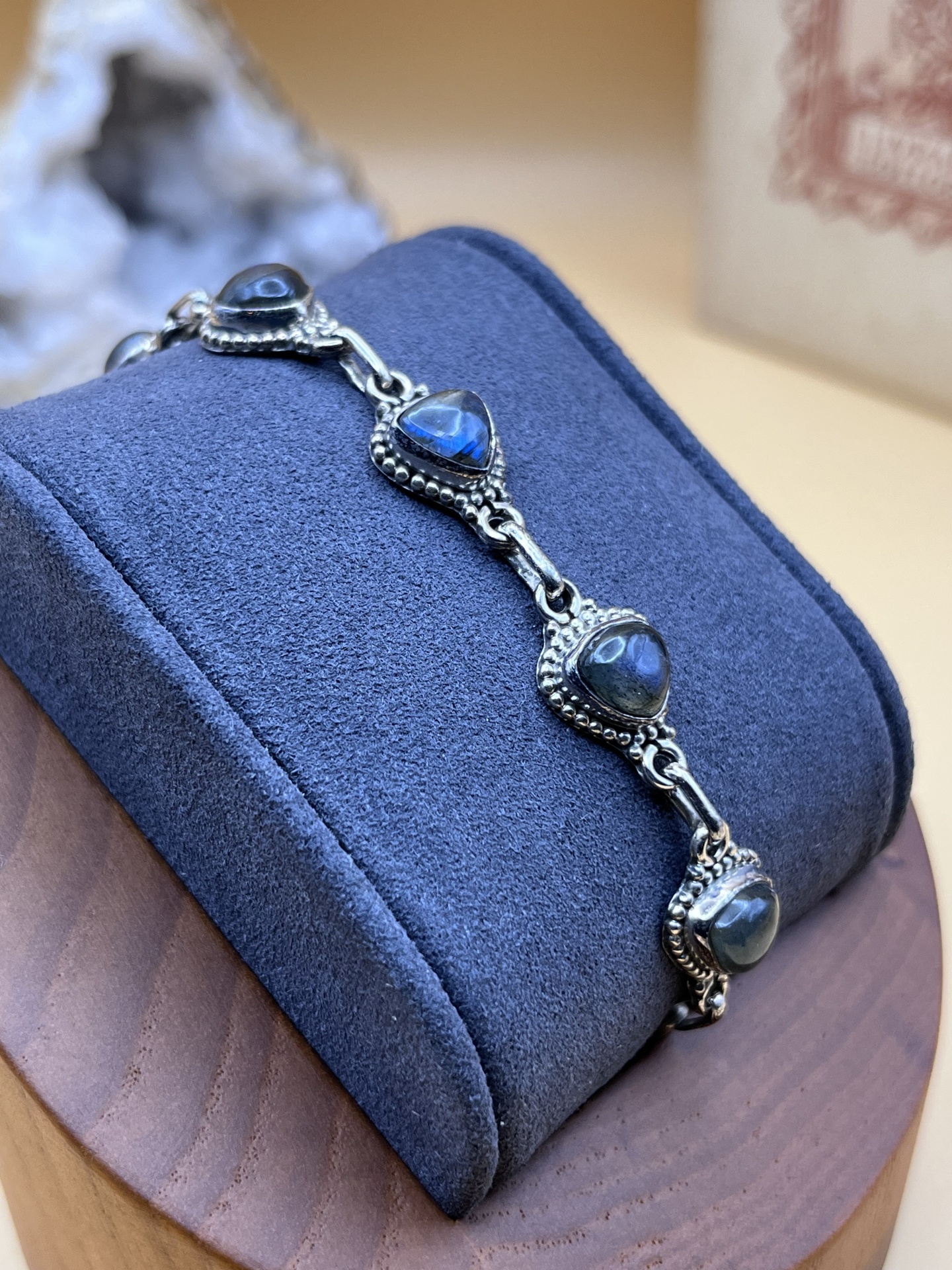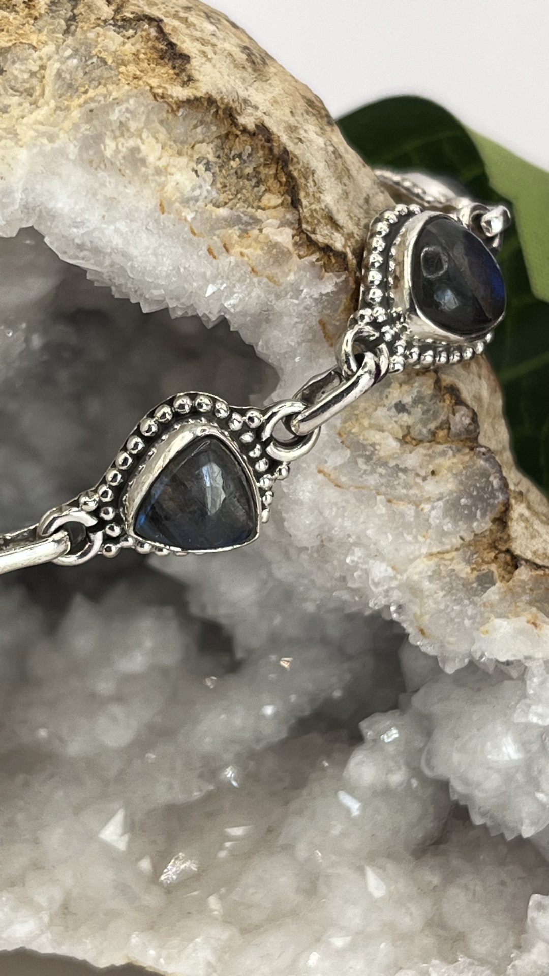 Apresentamos a Pulseira Aurora Mística, uma peça deslumbrante da coleção exclusiva de prata esterlina 925, adornada com labradorite natural. Conhecida pela sua iridescência mágica, a labradorite reflete luzes em tons vibrantes, que variam entre azul, verde e dourado, adicionando um toque celestial ao seu look.