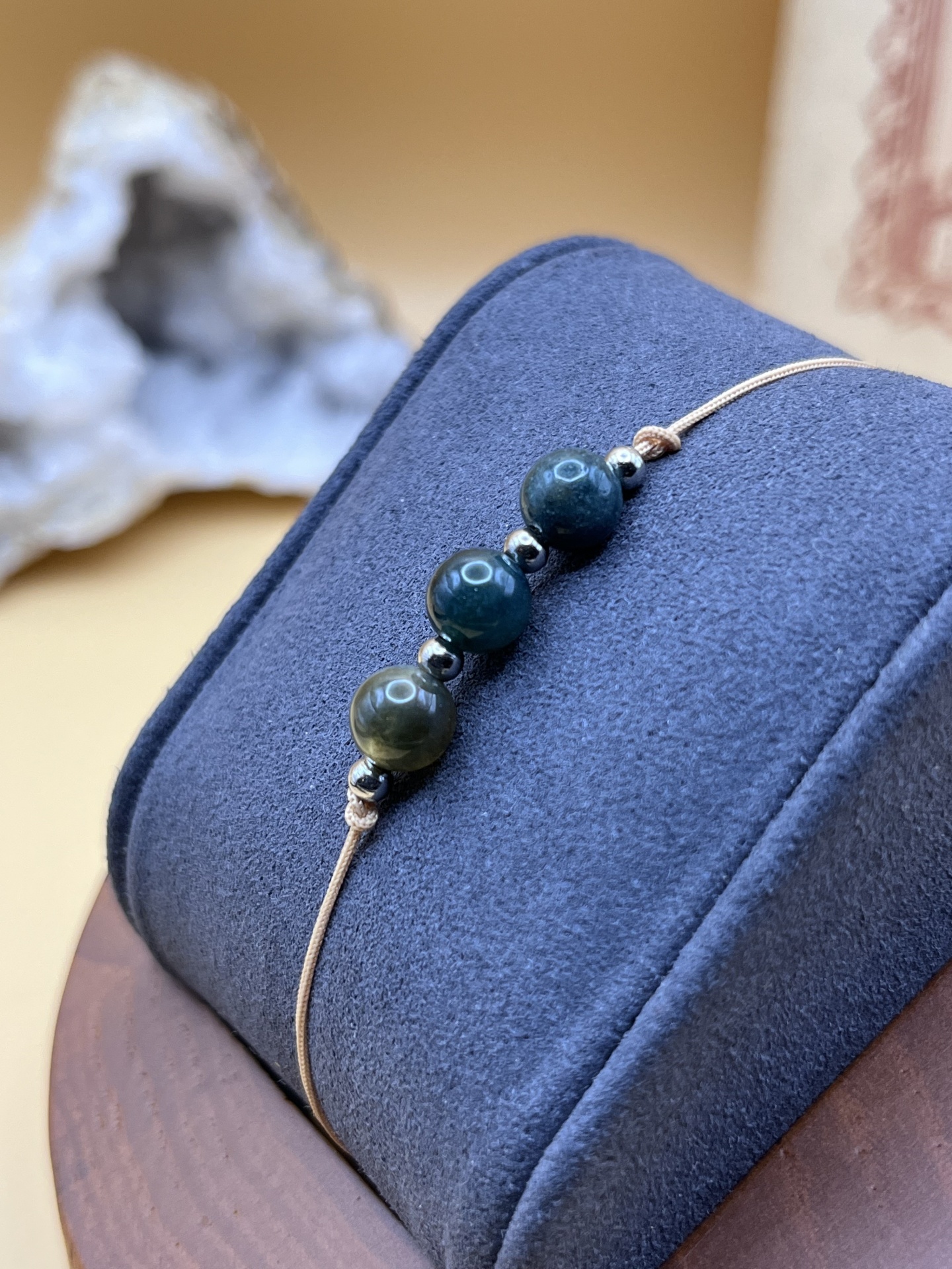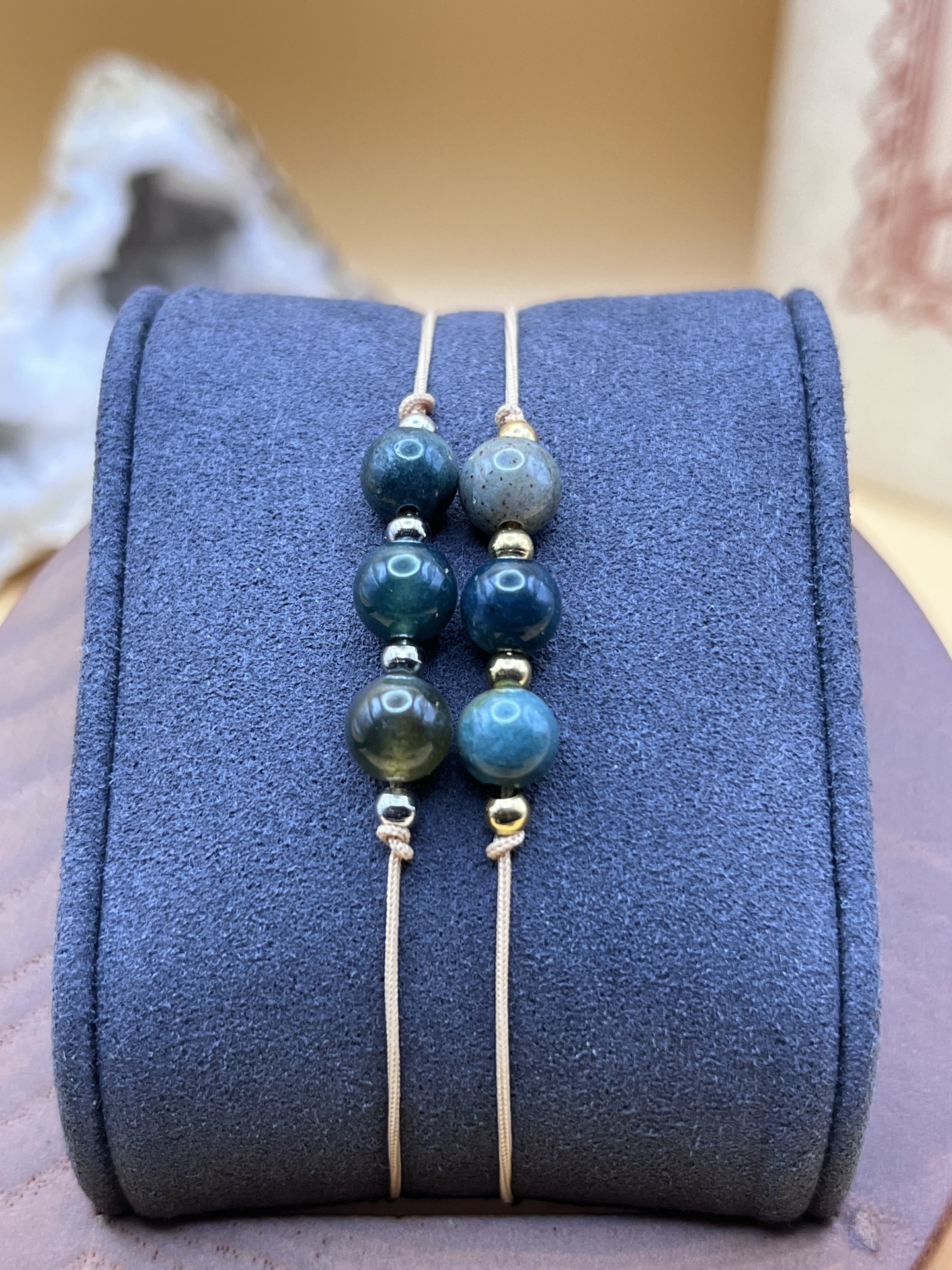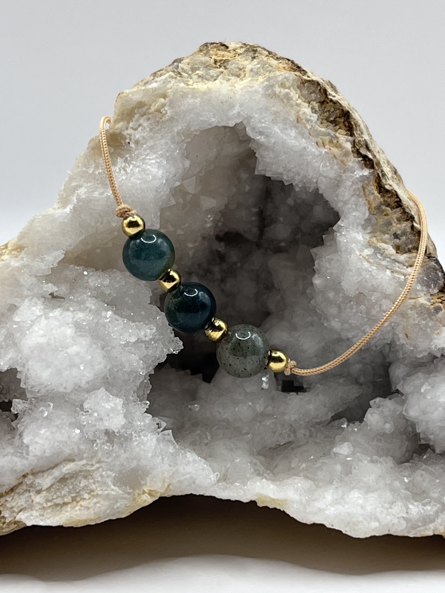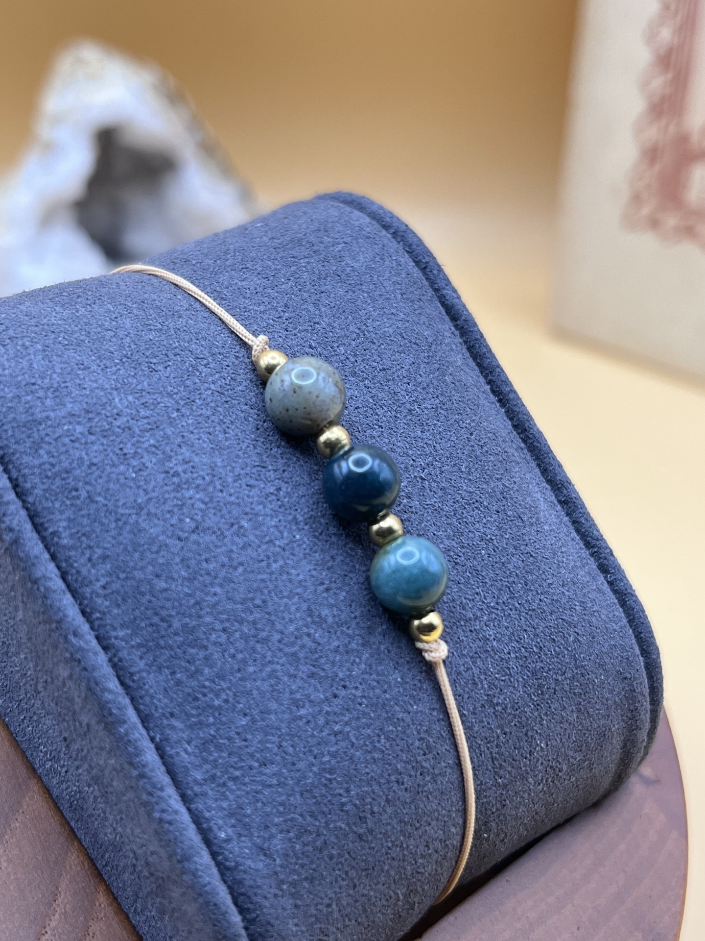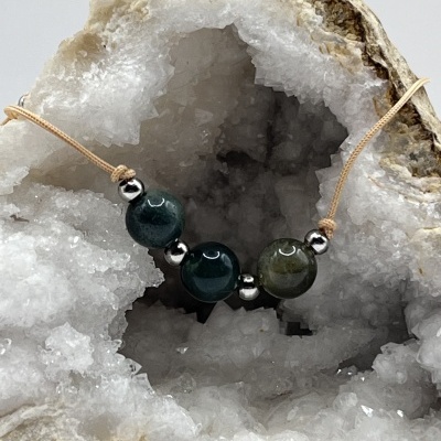 Pulseira artesanal em cetim bege com três pedras naturais de Ágata Indiana de 6 mm. Fabricada em Portugal, é leve e confortável para uso diário. A Ágata Indiana está associada a vitalidade e criatividade, oferecendo um toque de cor sem excesso. As contas metálicas podem ser douradas ou prateadas. Selecione a opção pretendida antes de adicionar ao carrinho. Como as pedras são naturais, existem diferenças subtis de cor. Recomenda-se retirar durante o banho para maior durabilidade.