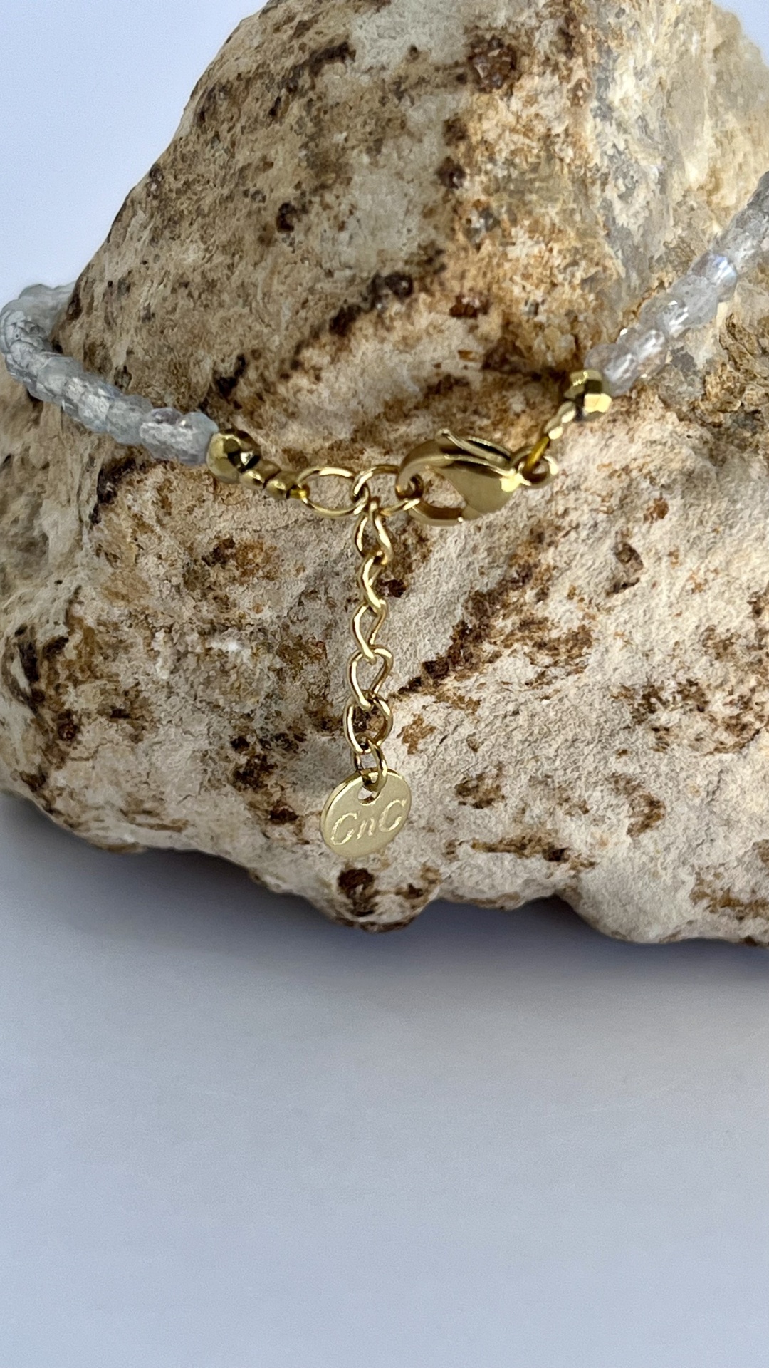 O contraste das pedras naturais com o brilho dos detalhes banhados a ouro confere à Pulseira Naina uma aura de sofisticação despretensiosa, ideal para complementar qualquer look, desde ocasiões formais até momentos mais descontraídos.
