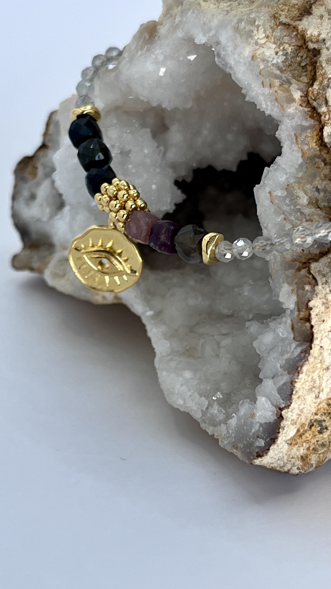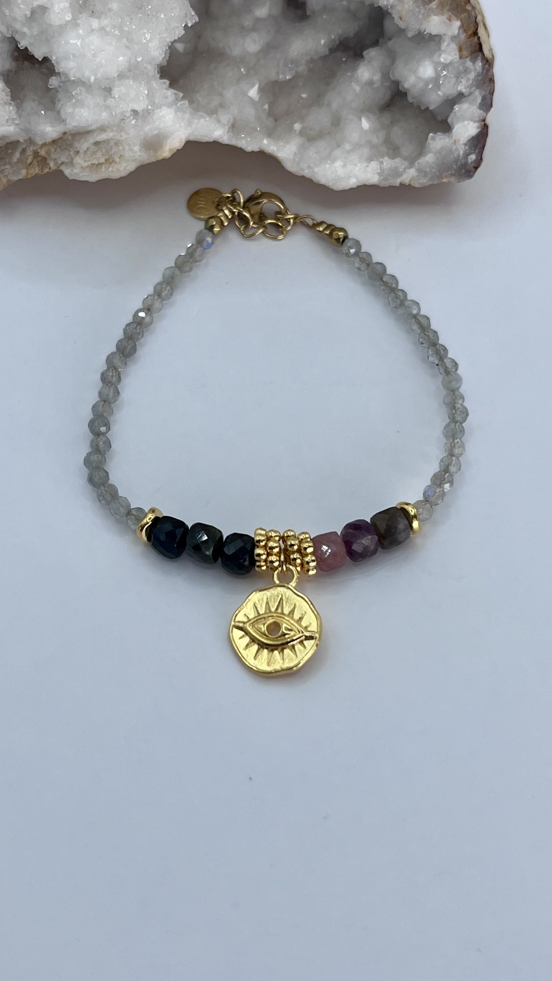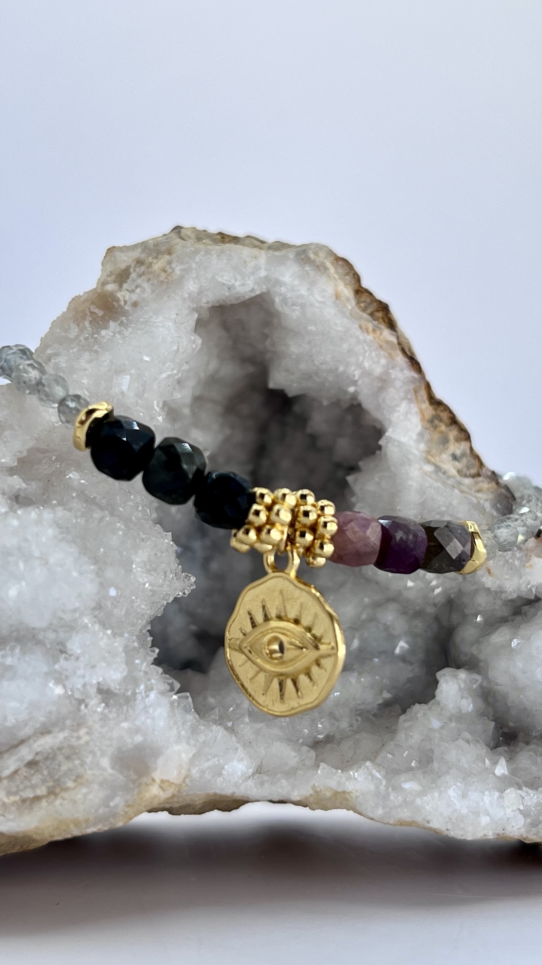 Descubra a Pulseira Naina, um acessório sofisticado que combina labradoritas, turmalinas e um charmoso pingente de olho banhado a ouro fino. Com um design moderno e elegante, esta peça é perfeita para quem aprecia exclusividade e estilo no dia a dia.