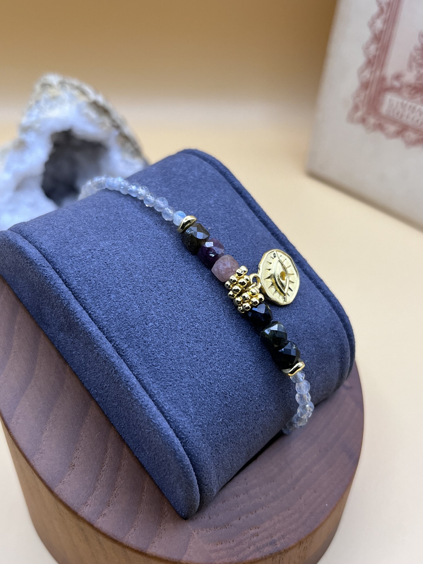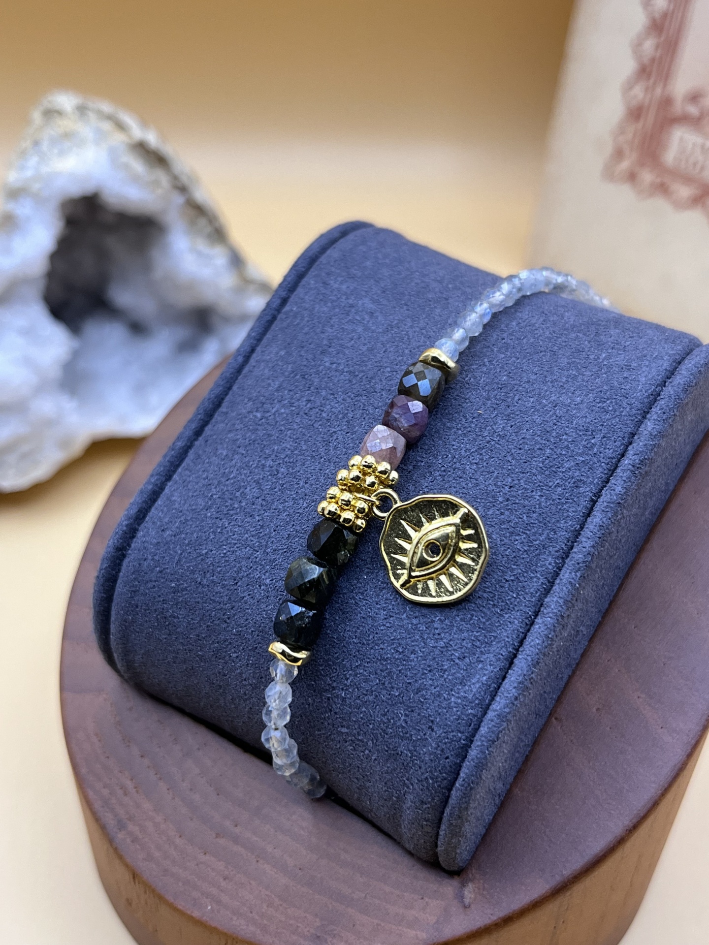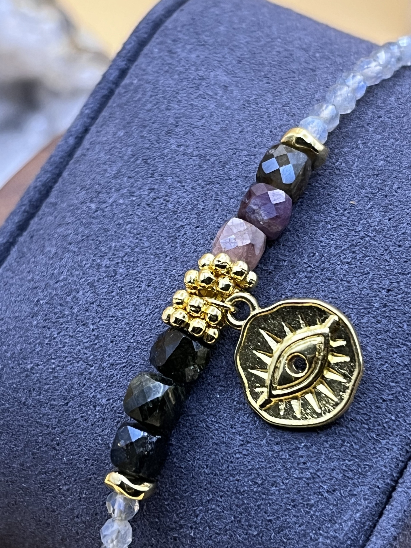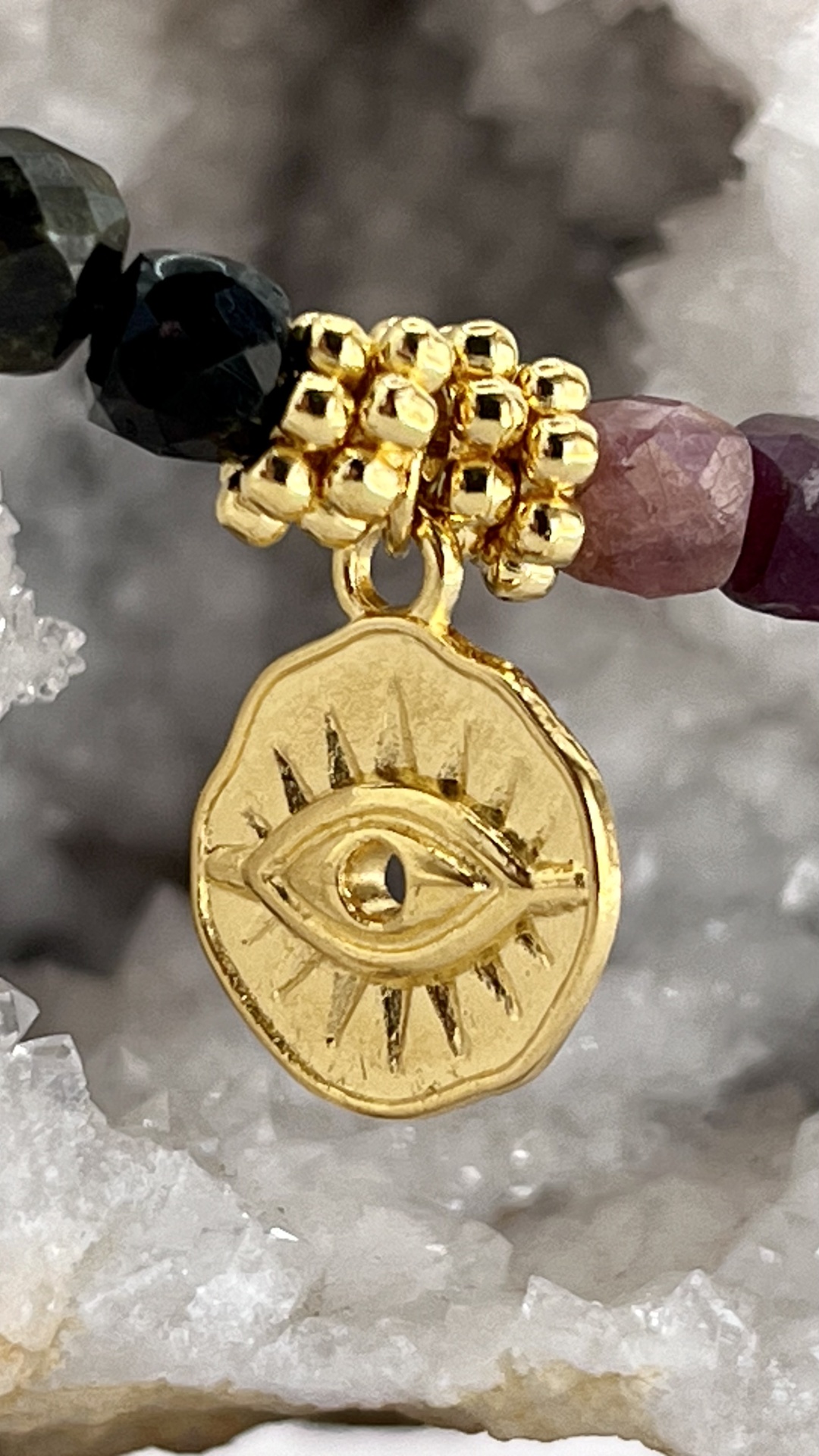 Descubra a Pulseira Naina, um acessório sofisticado que combina labradoritas, turmalinas e um charmoso pingente de olho banhado a ouro fino. Com um design moderno e elegante, esta peça é perfeita para quem aprecia exclusividade e estilo no dia a dia.