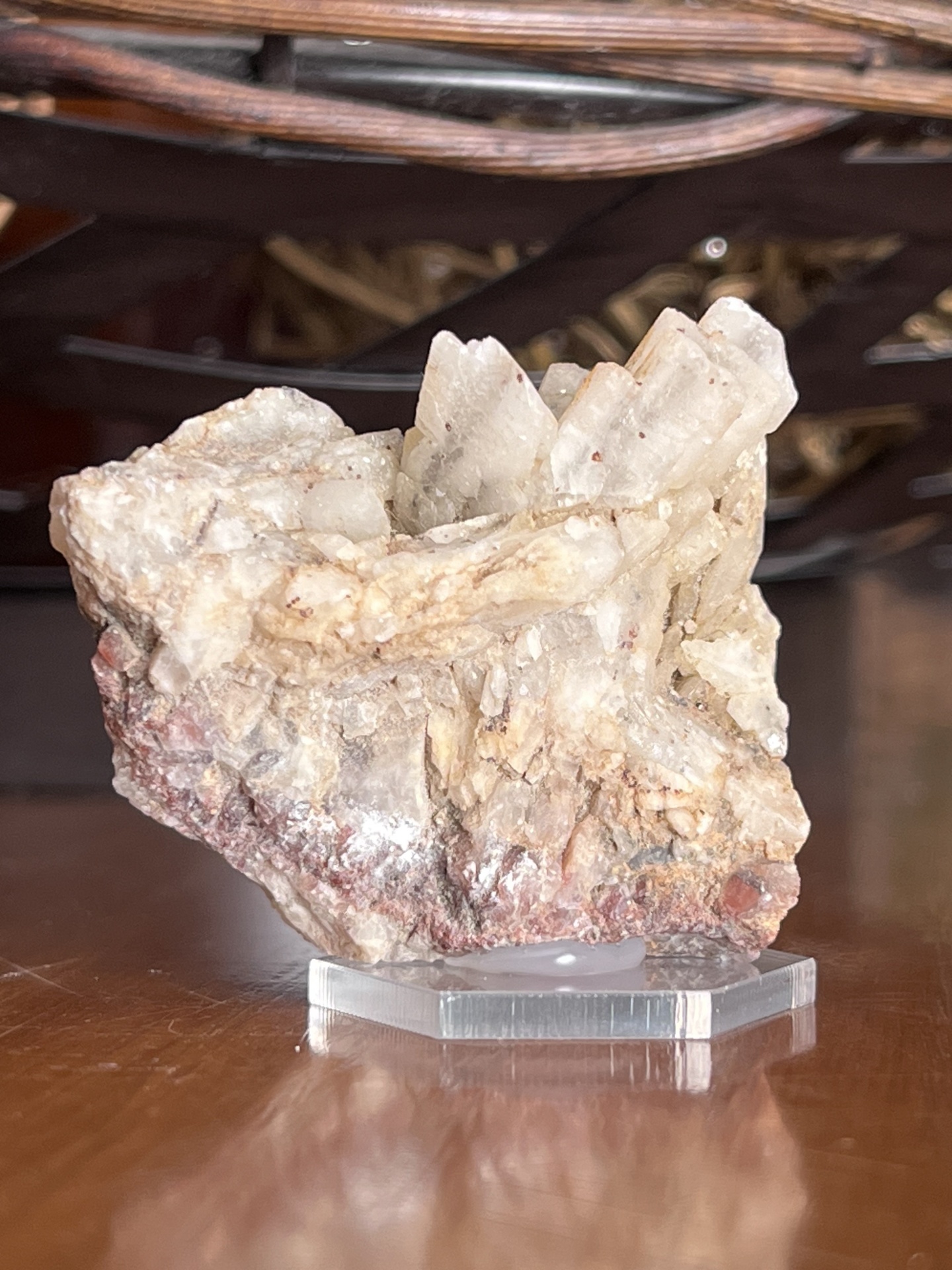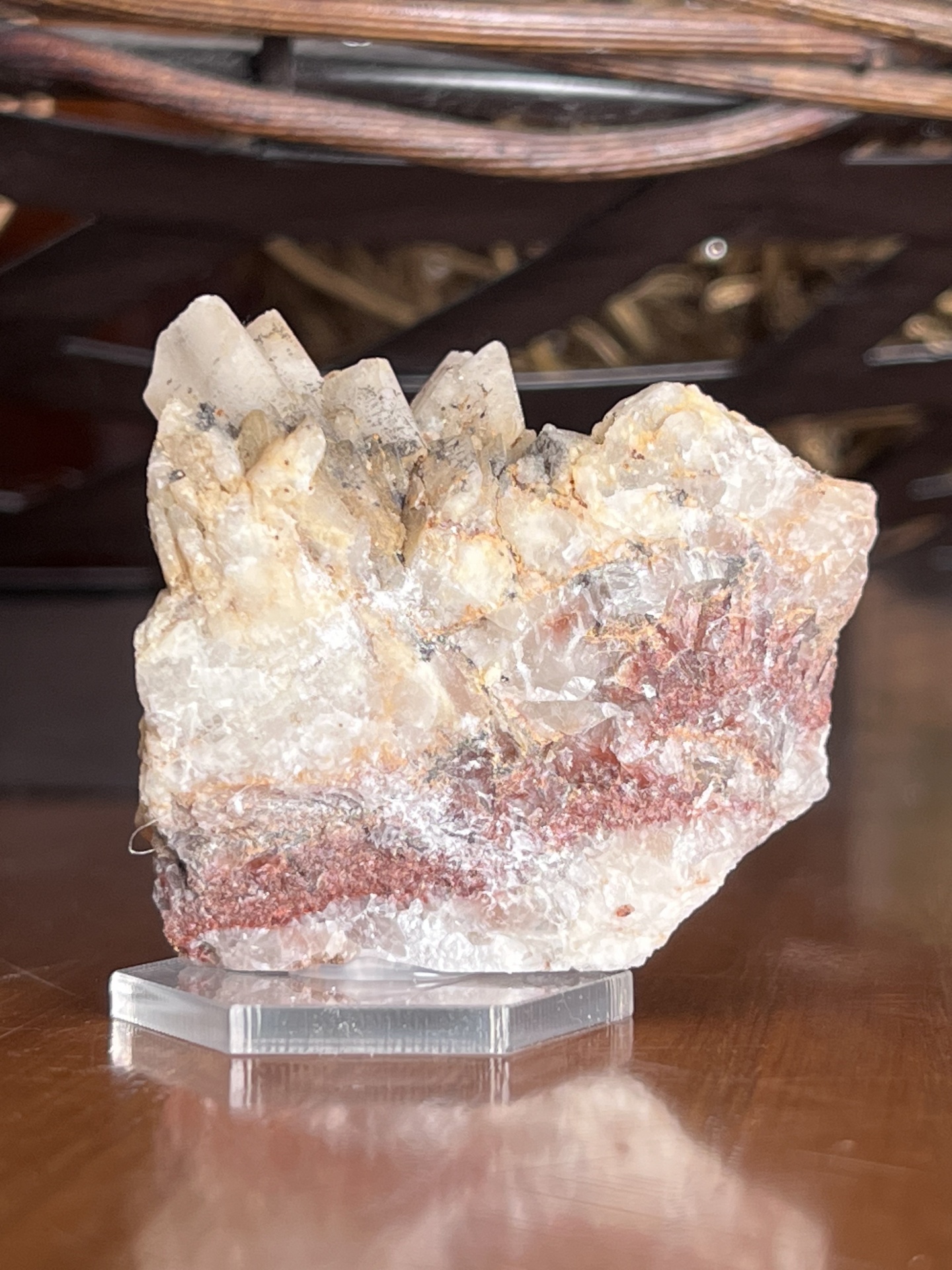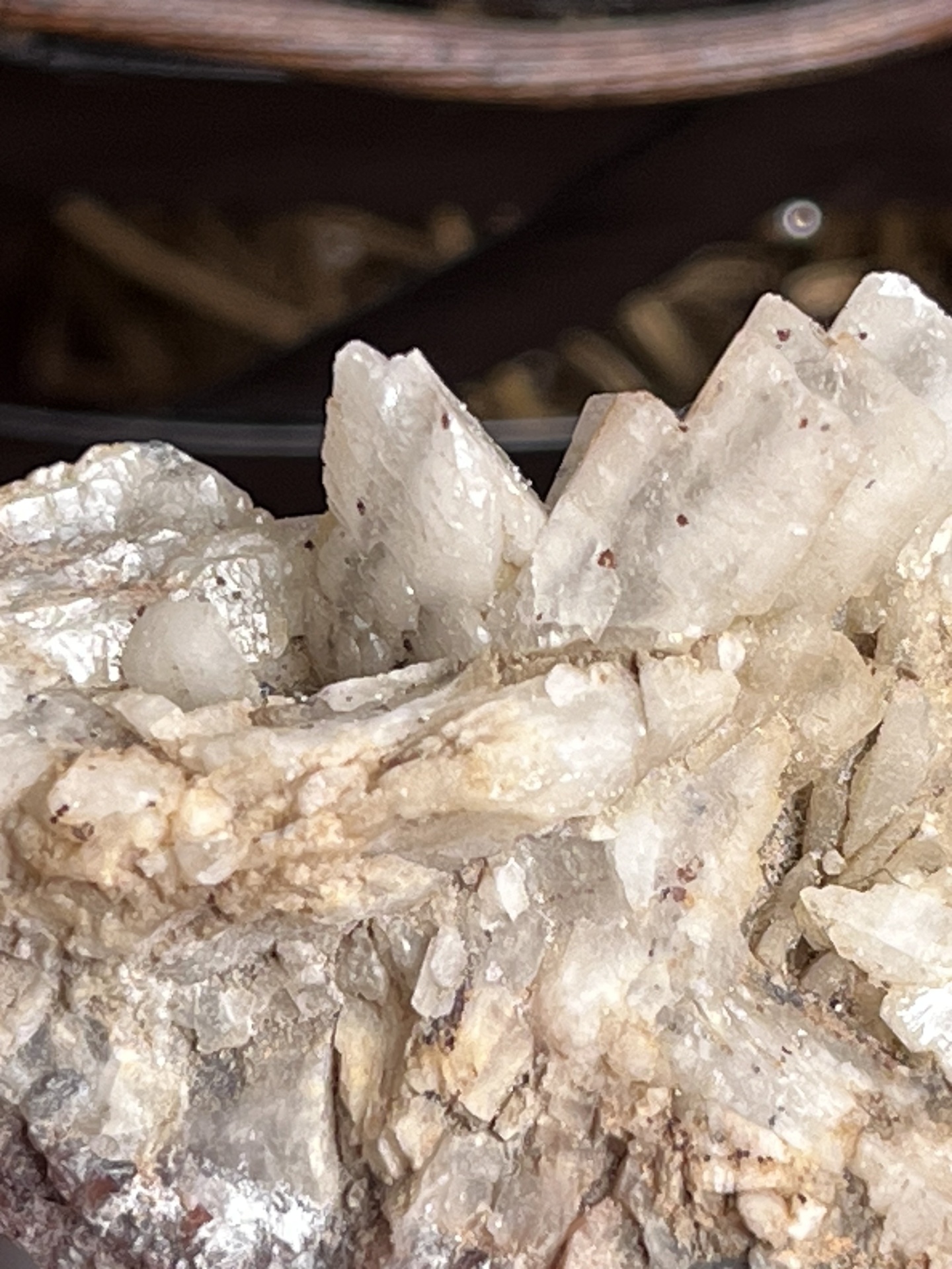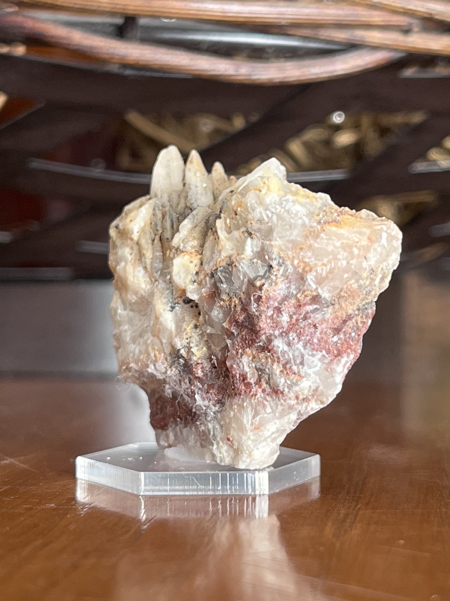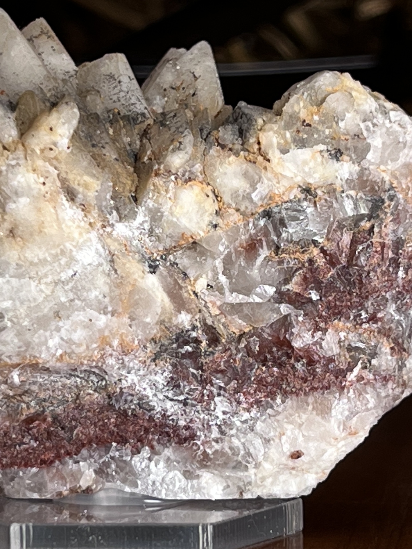 O conjunto exibe tonalidades que variam do branco ao translúcido, com áreas avermelhadas e acastanhadas resultantes da presença de óxidos de ferro, provavelmente hematite. Estas inclusões conferem contraste cromático e enriquecem a leitura geológica do exemplar.