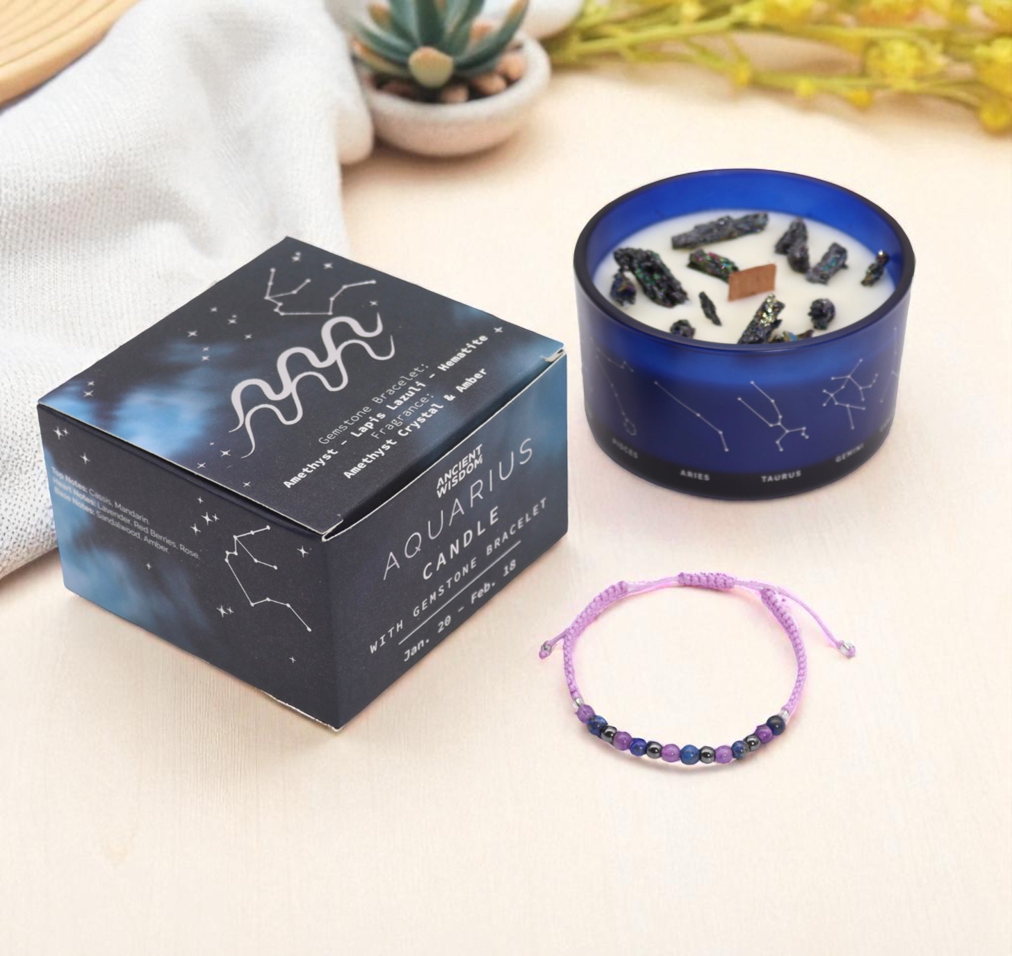 À medida que a vela arde, pedras preciosas brilhantes emergem, amplificando a conexão com a energia de Aquário. O conjunto inclui uma pulseira de cristais feita com ametista, lápis-lazúli e hematita, pedras cuidadosamente selecionadas para alinhar-se com as forças desse signo: