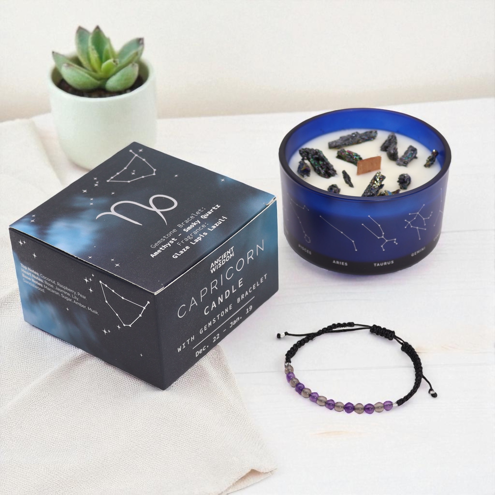 Esta combinação elegante de vela e pulseira é ideal para momentos de auto-reflexão, foco ou como um presente significativo para um capricorniano.